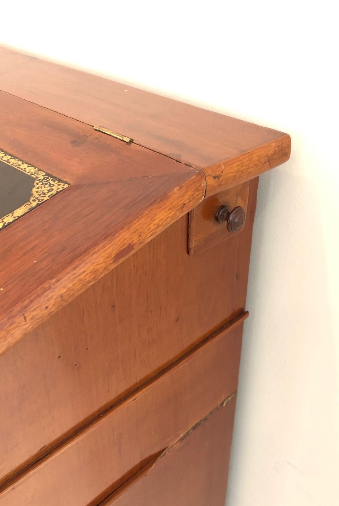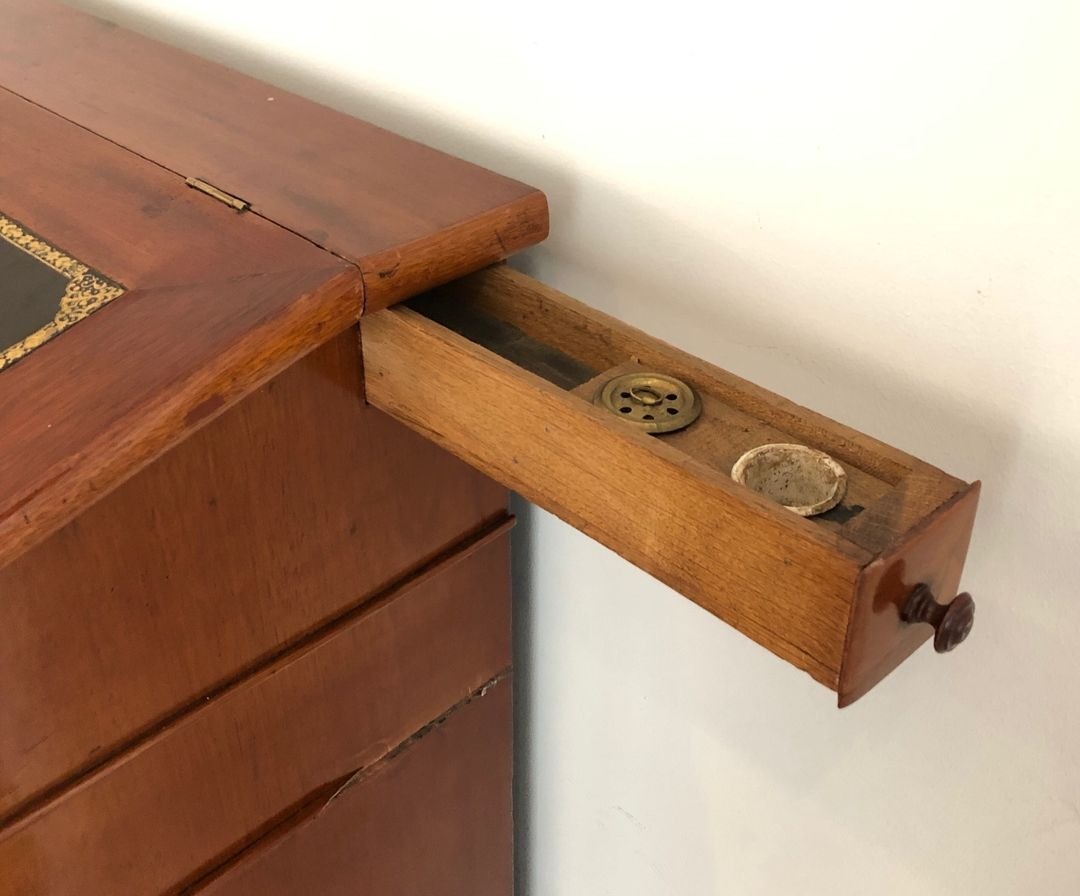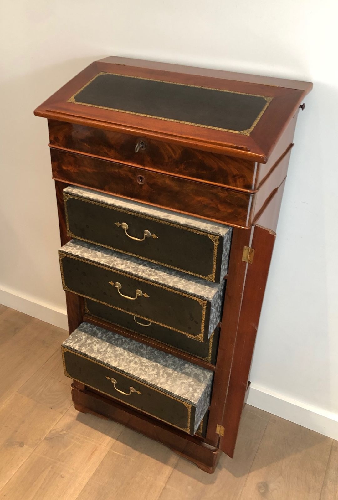 This cabinet, in the Napoléon III style characteristic of the prosperous bourgeois offices of the Second Empire, translates these professional imperatives into furniture of considerable presence. Standing at 117 centimetres, it commands the space around it without ostentation. The mahogany carcase, well-joined and structurally sound after more than a century and a half, speaks to cabinet-making of the serious professional-interior tradition: not showy, but exacting, built to outlast its first owner’s career and his successor’s. The leather surfaces, patinated with age, add a warmth and depth that raw wood would not achieve.