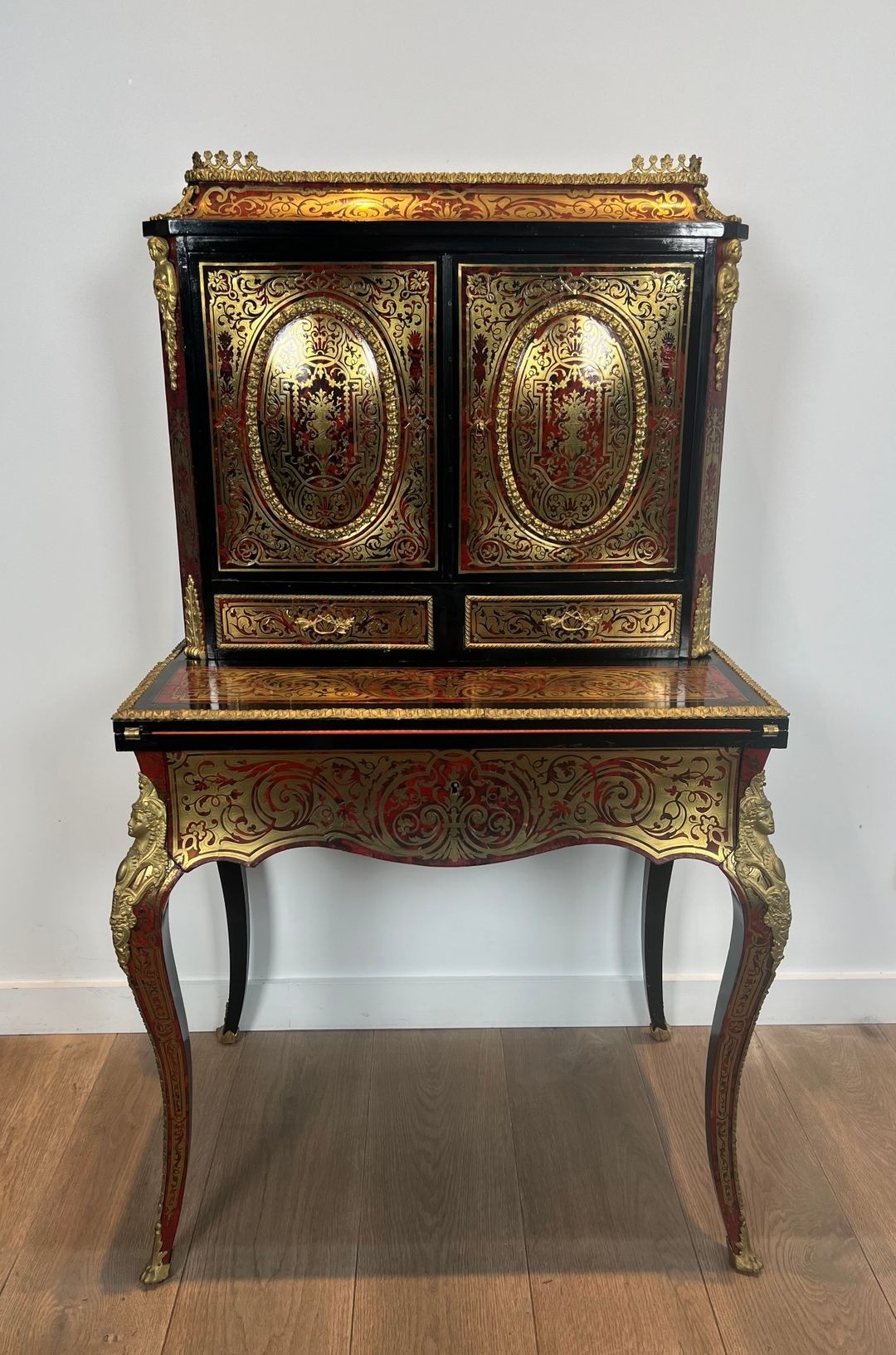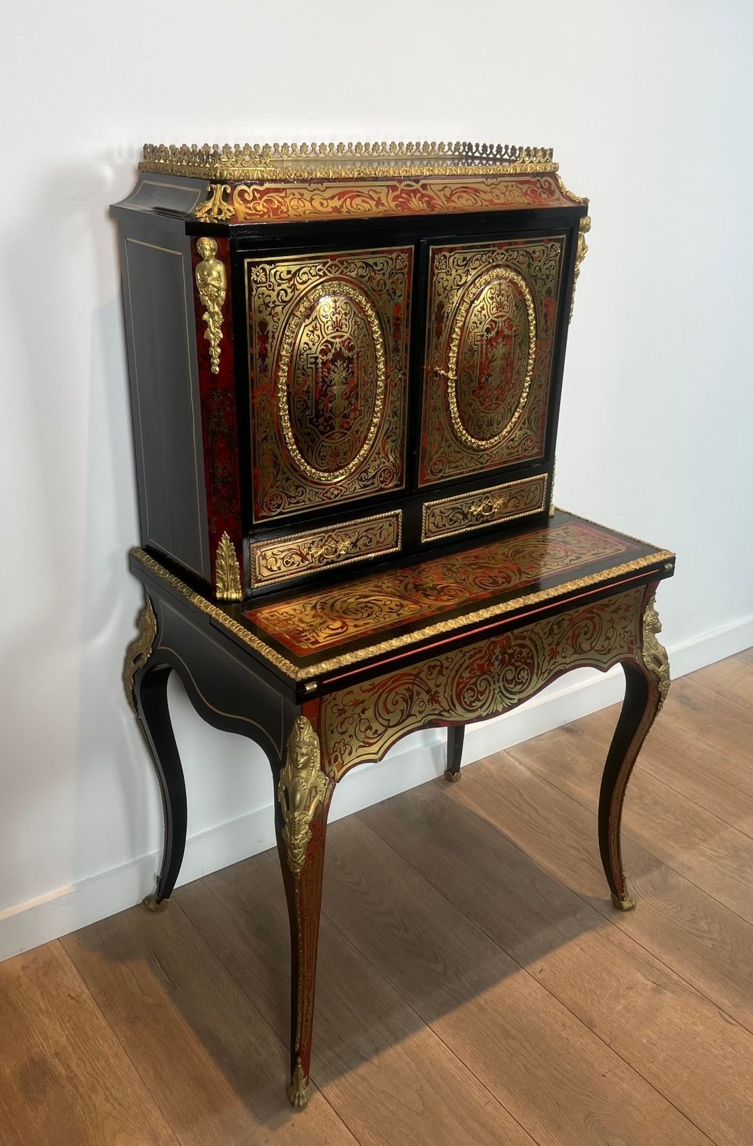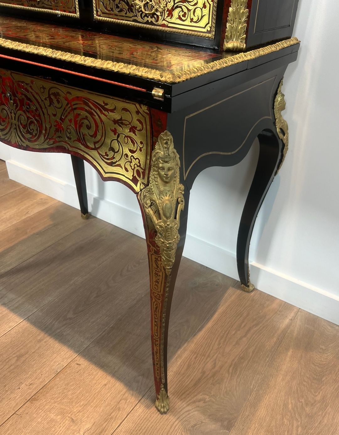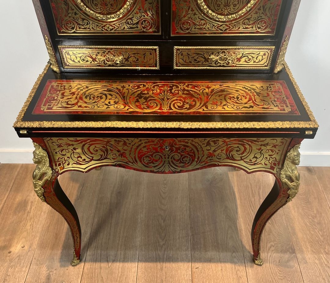 The entire surface of both sections is enriched with Boulle marquetry of the first order — that singular technique perfected by André-Charles Boulle under Louis XIV and revived with great enthusiasm during the Second Empire. Here the brass arabesques, foliage scrolls and strapwork are inlaid against a ground of red-tinted tortoiseshell-effect material and blackened pear wood veneer, producing the characteristic warm, jewel-like contrast that made Boulle work so sought after by the collectors and decorators of Napoleon III’s court.