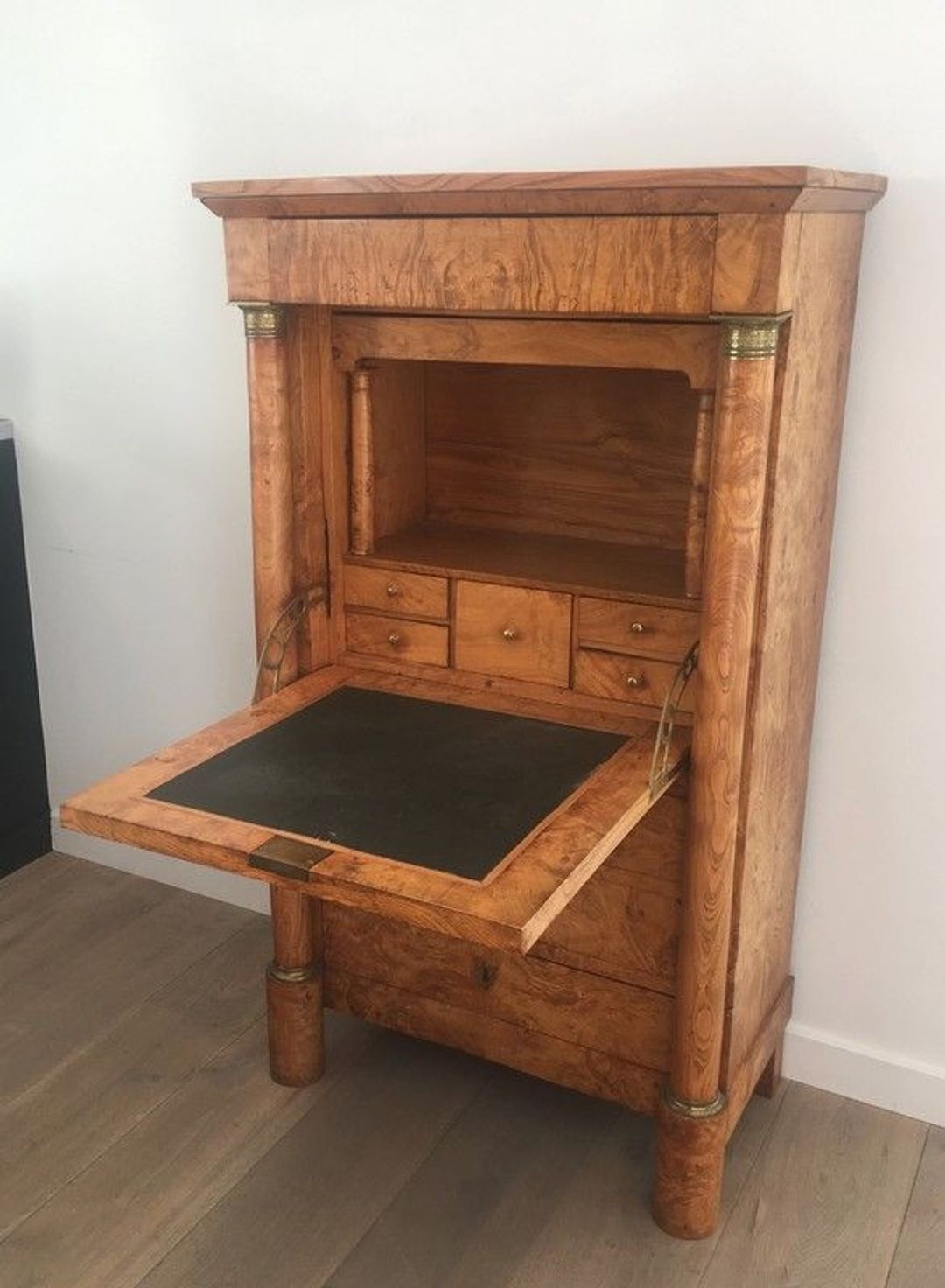 French Empire fall-front secrétaire veneered in burr walnut with detached gilt brass-capped columns, leather-lined writing surface, interior fitted with small drawers and a concealed secret drawer. France, circa 1850. W. 80 × D. 46 × H. 143 cm.