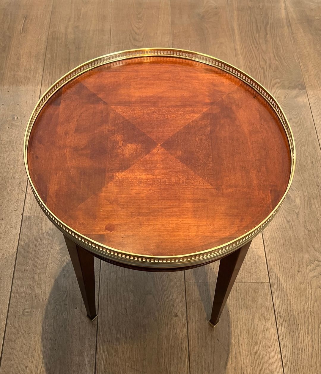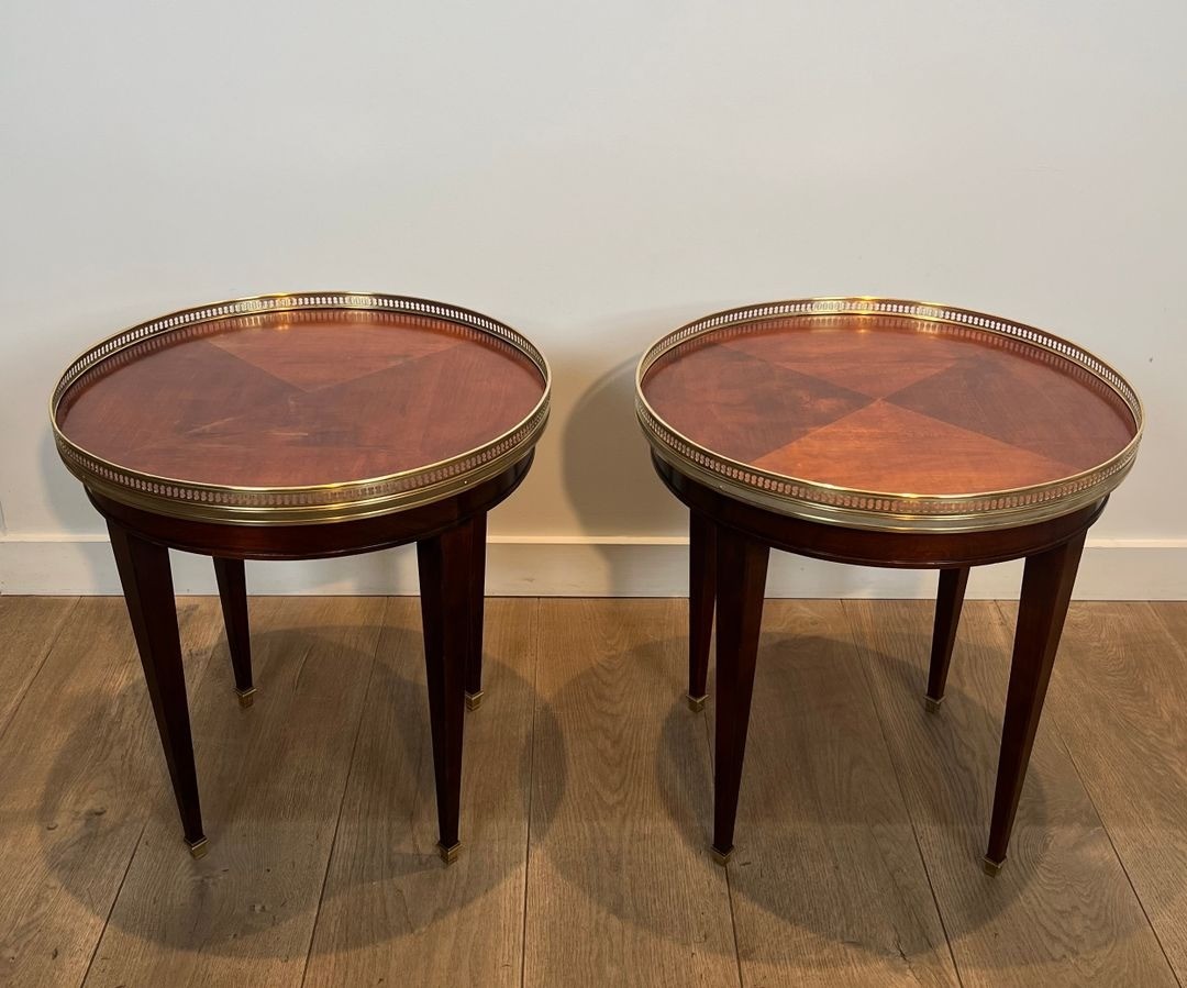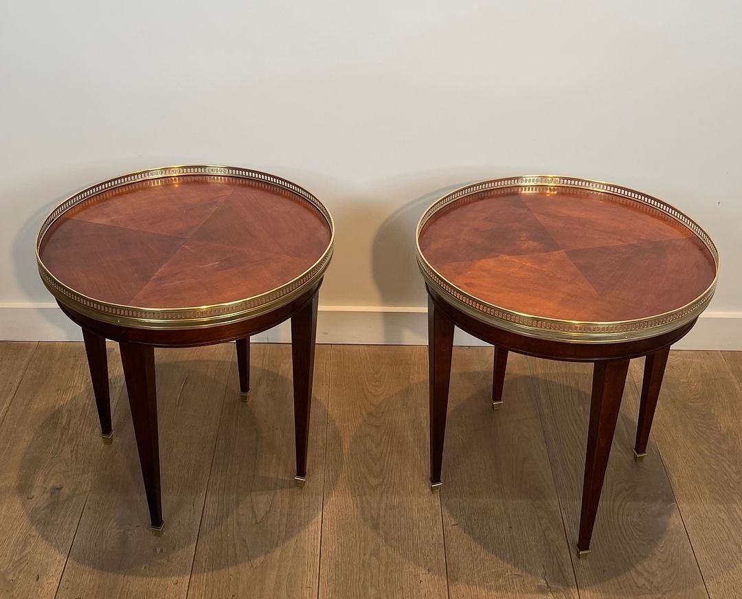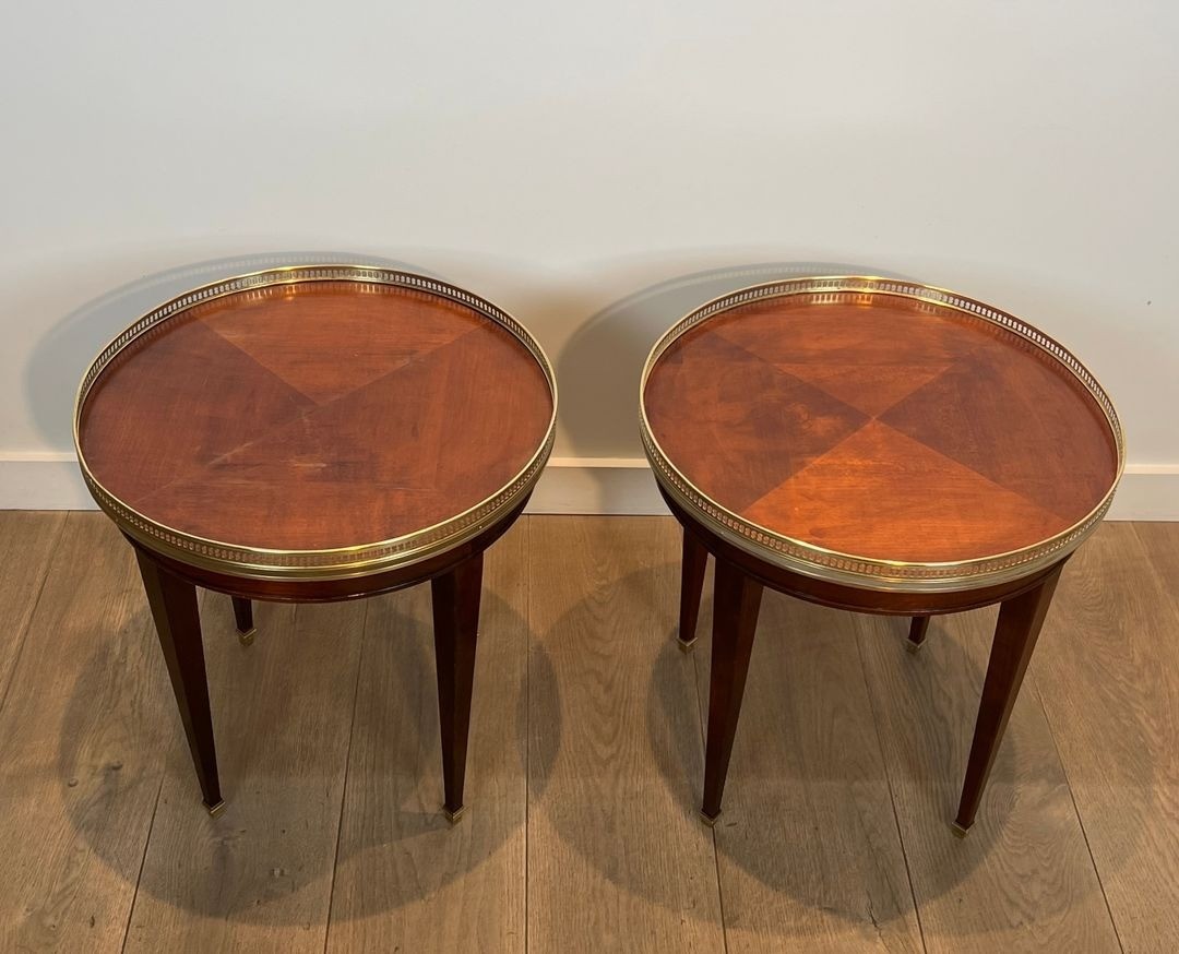 A pair of neoclassical round bouillotte tables in mahogany and brass, French work, circa 1940. Circular tops with brass gallery on slender turned legs. Diam. 50 cm × H. 52.5 cm each.