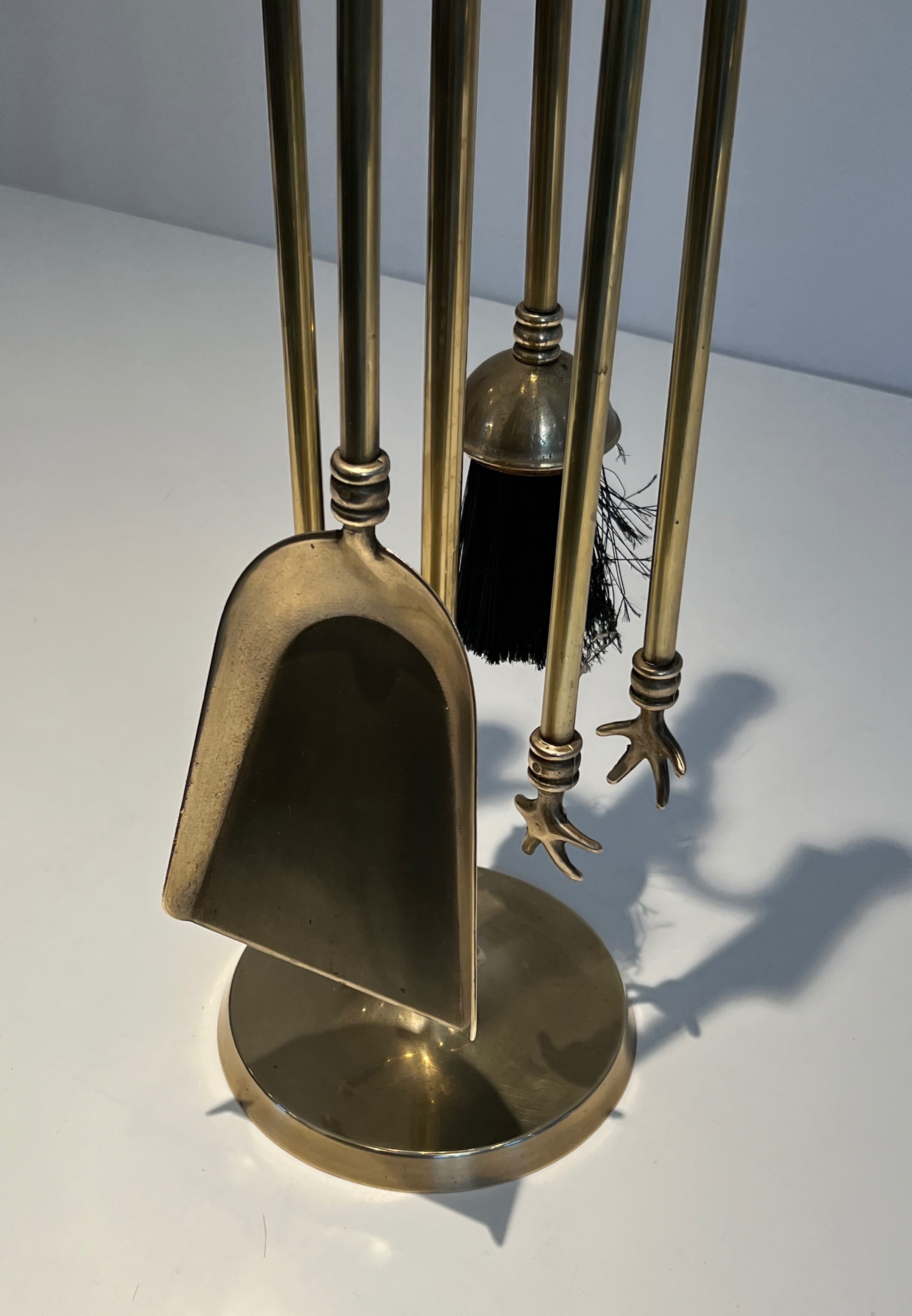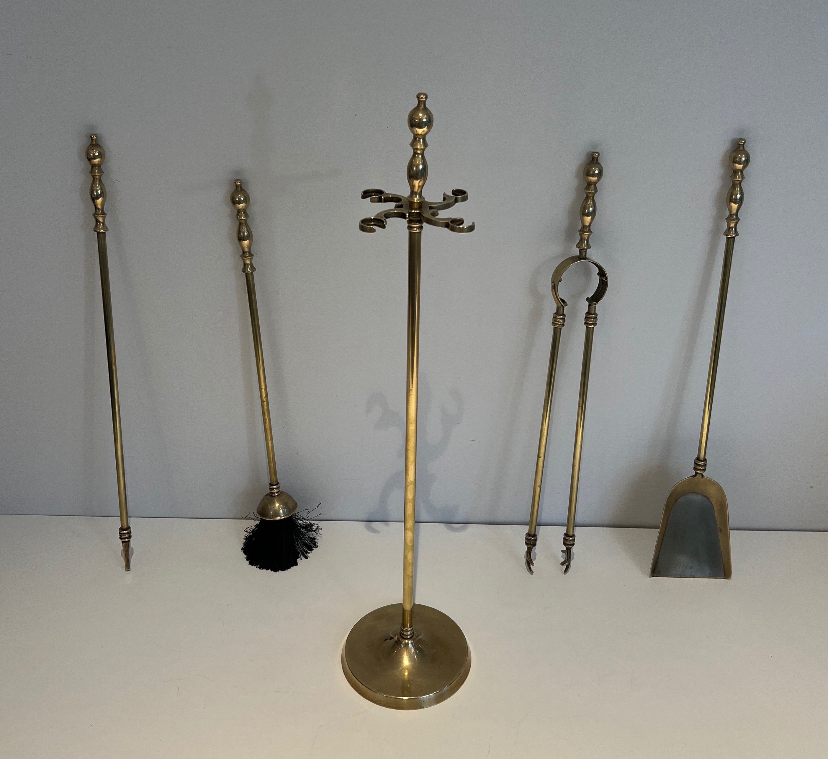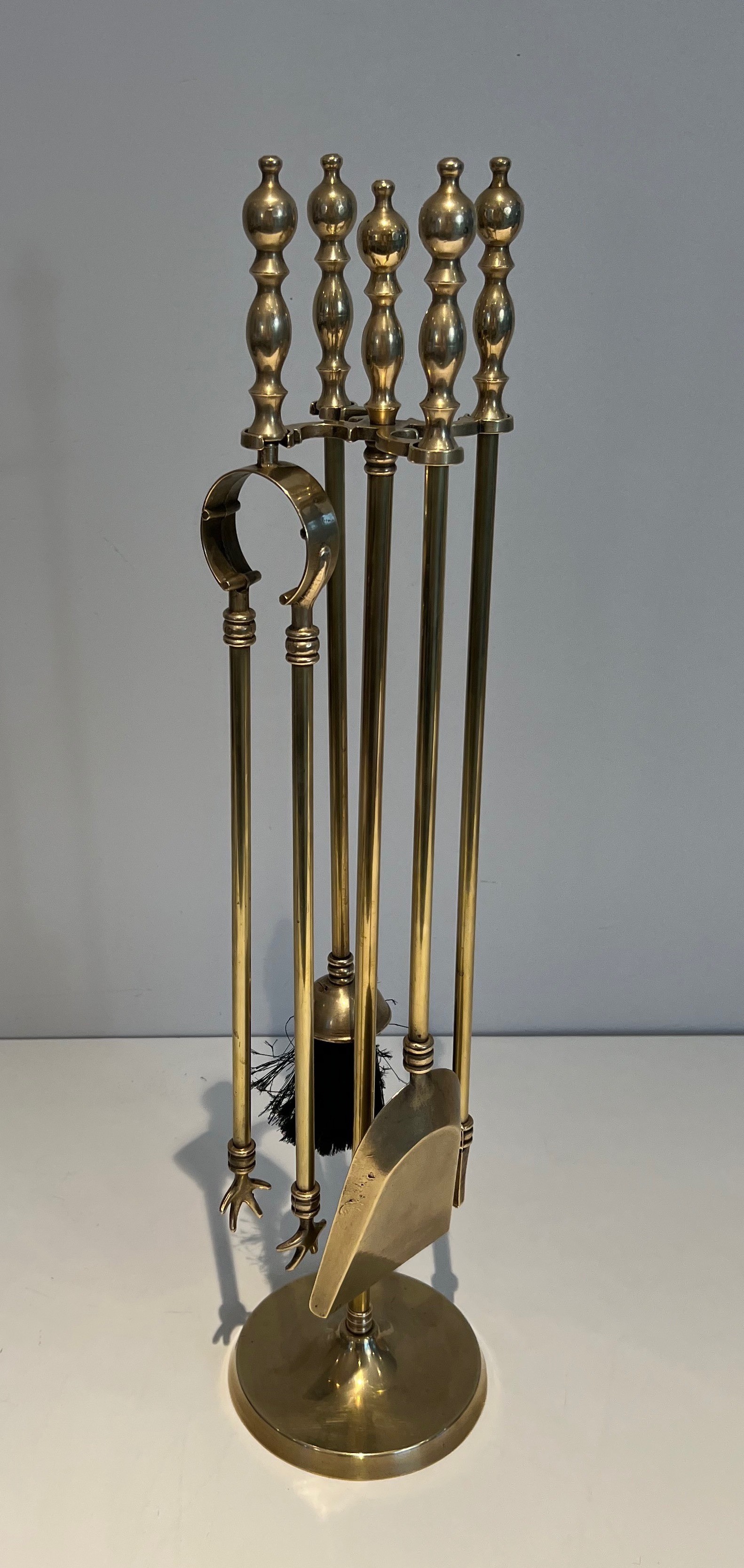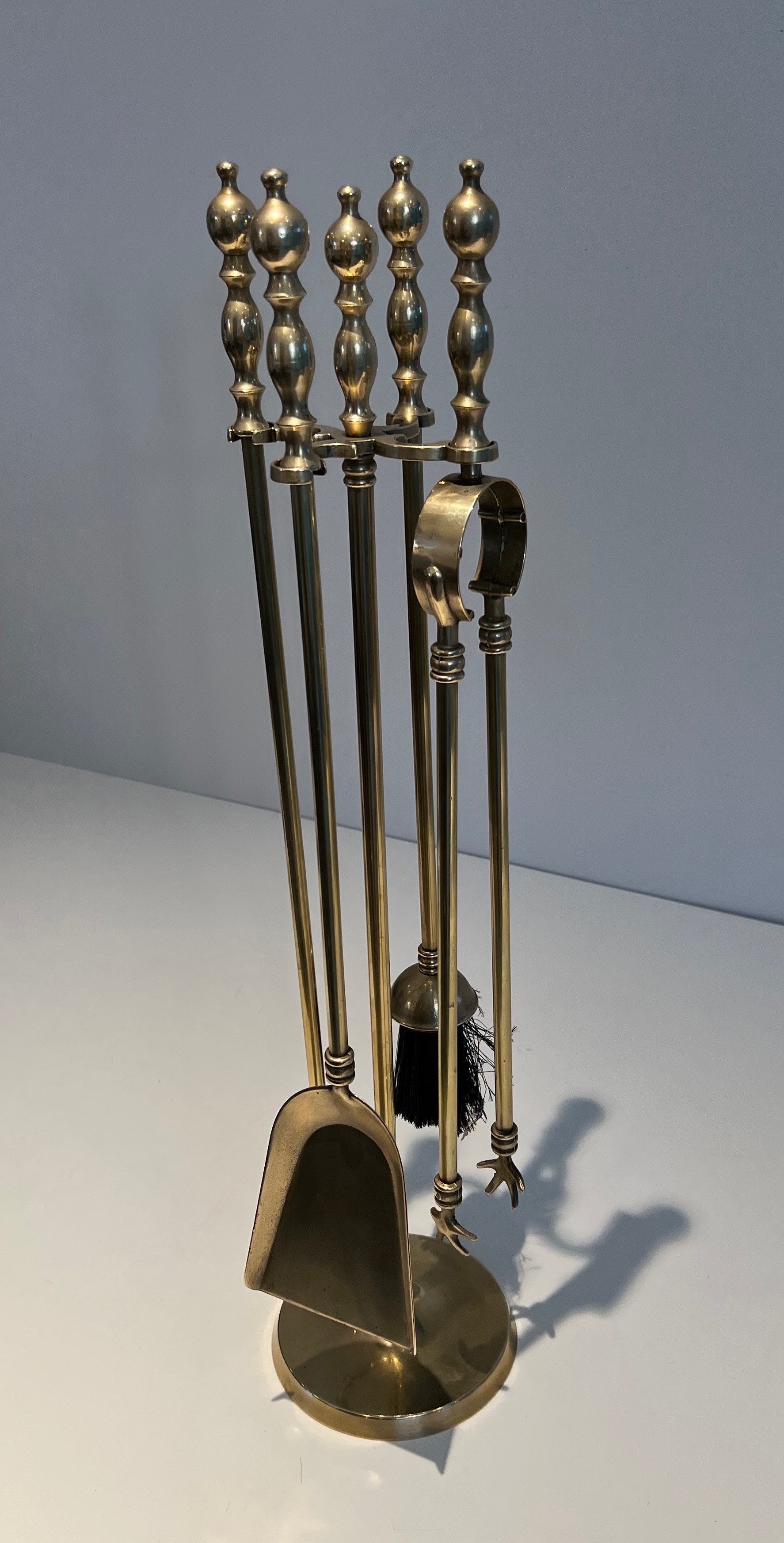 Brass fireplace accessories in the neoclassical style have been a constant presence in the finest French interiors since the early nineteenth century, their enduring appeal lying in the universal language of classical form that transcends period and fashion. The quality and finish of a fireplace set has long been regarded in France as a mark of the householder's taste and refinement, and these tools — with their well-proportioned handles, their precise casting and their warm, golden lustre — speak clearly of a demanding aesthetic standard. This set belongs to the distinguished lineage of French brass craftsmanship that stretches back to the great bronziers of the ancien régime.
