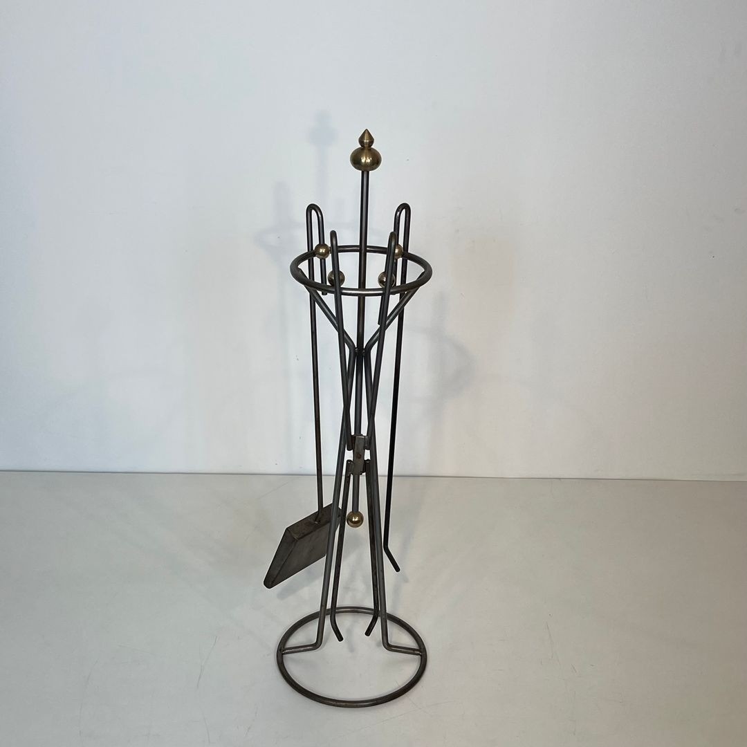 Modernist fireplace companion set in brushed steel and brass, comprising five tools within a tall cage-form stand of slender steel rods on a circular ring base, the whole crowned by a brass finial. French work, circa 1970. W. 25 × D. 25 × H. 82.3 cm.