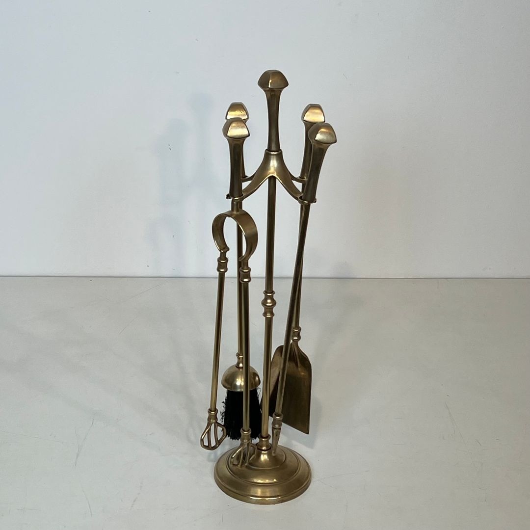 Neoclassical brass fireplace companion set with tools on a central ring holder, mounted on a tripod stand with three gracefully spreading legs. W. 18 × D. 18 × H. 56.2 cm. French work, circa 1970.