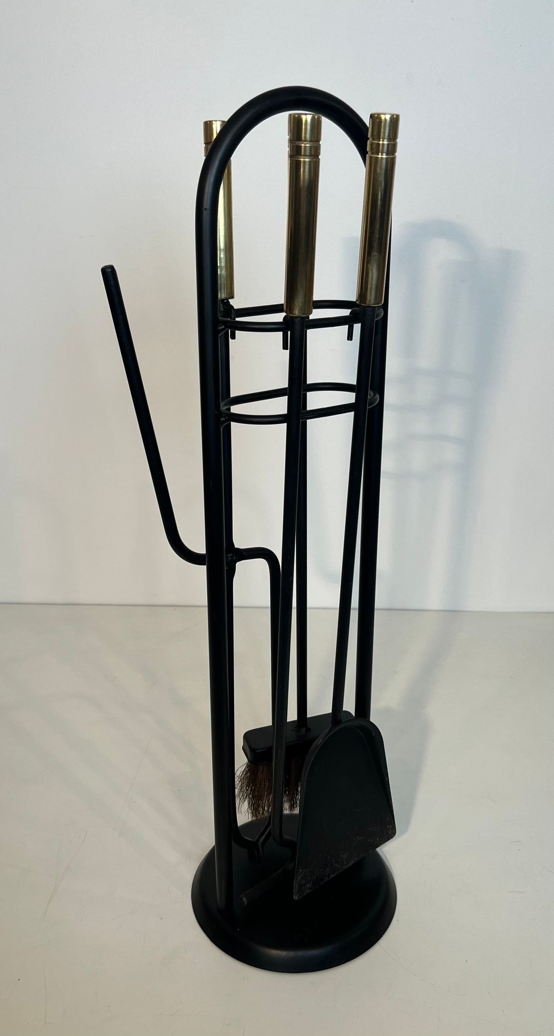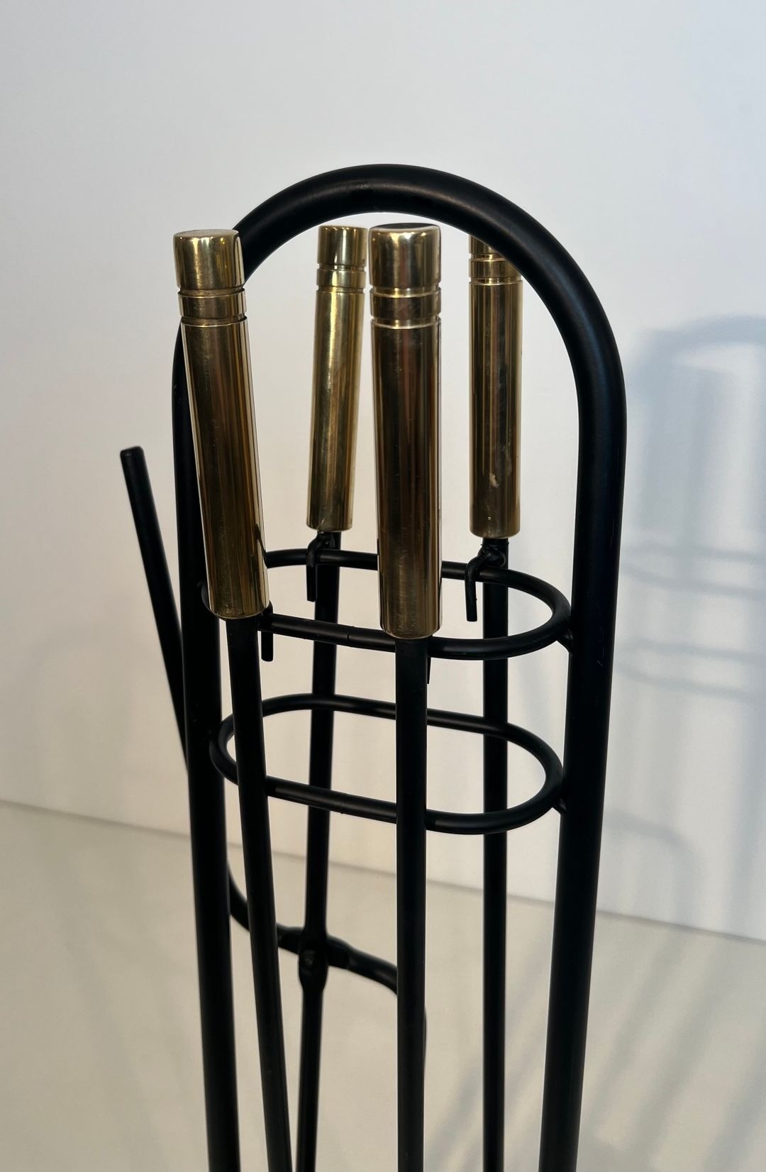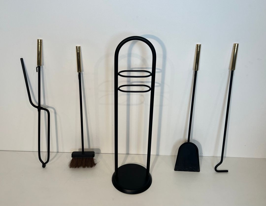 The contrast between the black lacquered ironwork and the polished brass handles of the tools is characteristic of the chromatic sophistication sought by French designers of this period, who frequently played the warmth of non-ferrous metals against the austerity of lacquered or enamelled iron. The present set, with its distinctive carrying handle and well-resolved proportions, is a particularly coherent expression of this approach.