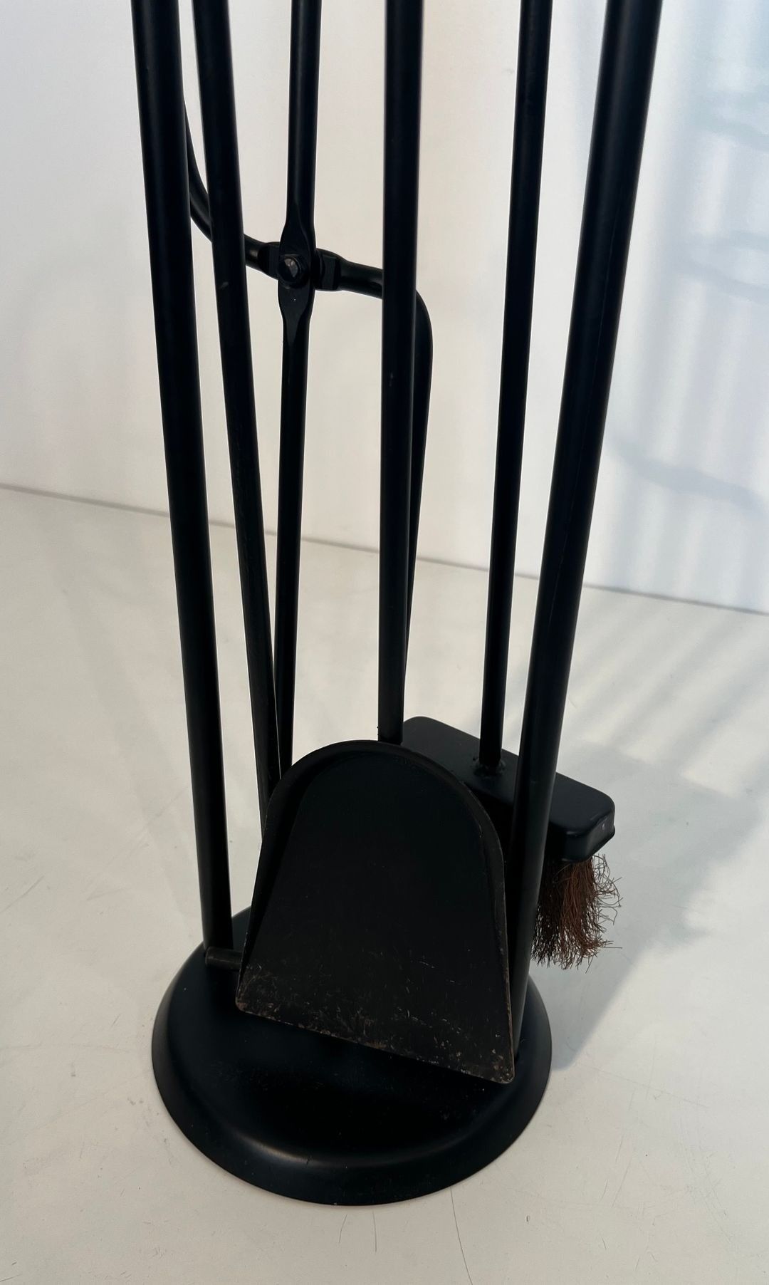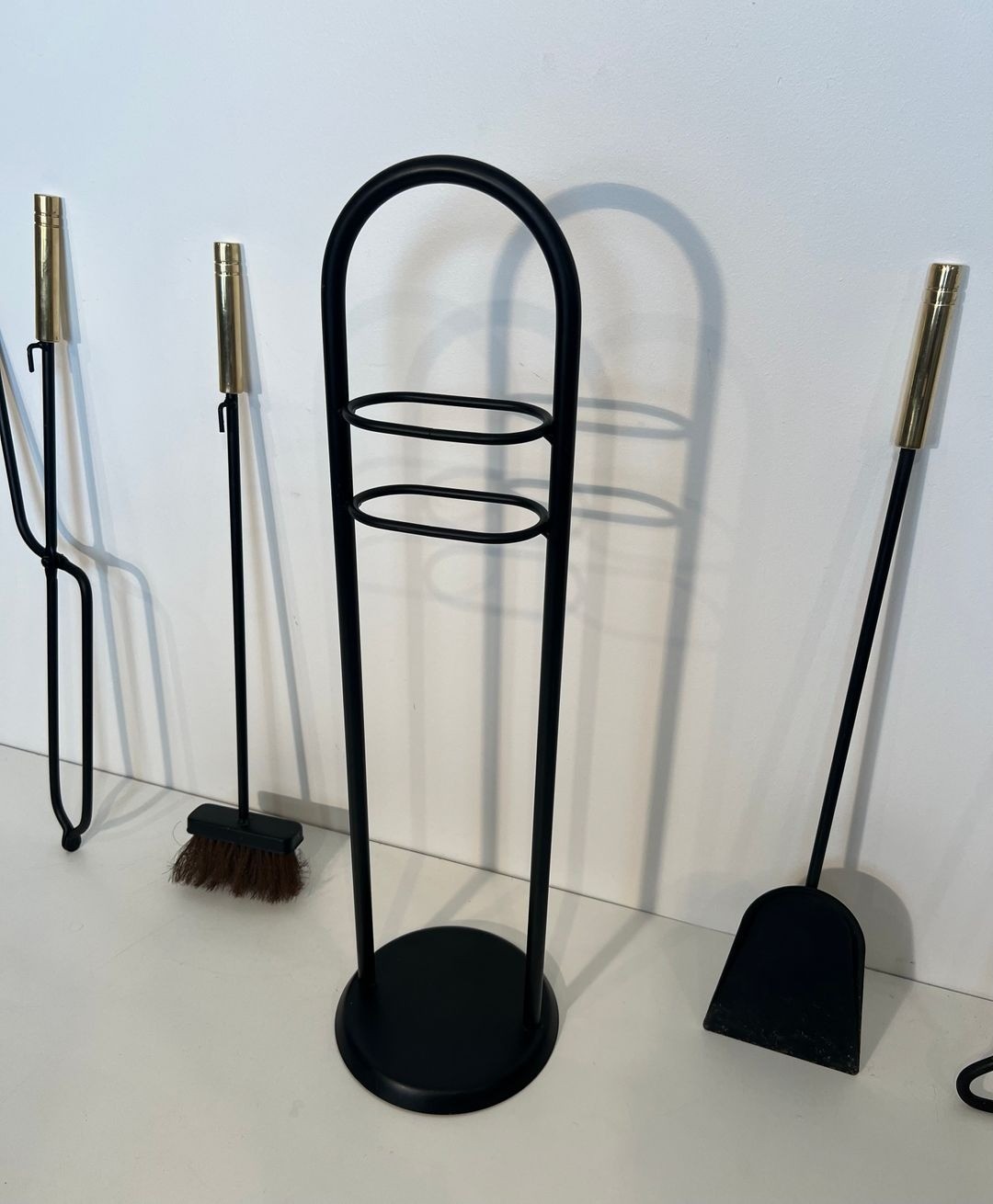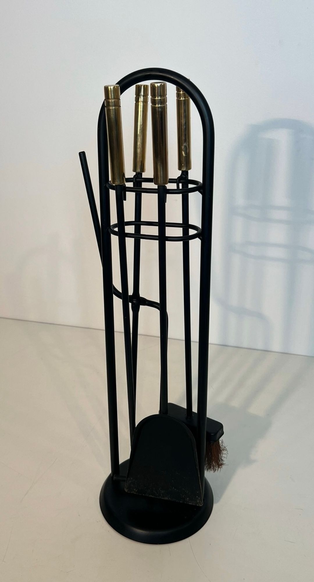 The contrast between the black lacquered ironwork and the polished brass handles of the tools is characteristic of the chromatic sophistication sought by French designers of this period, who frequently played the warmth of non-ferrous metals against the austerity of lacquered or enamelled iron. The present set, with its distinctive carrying handle and well-resolved proportions, is a particularly coherent expression of this approach.