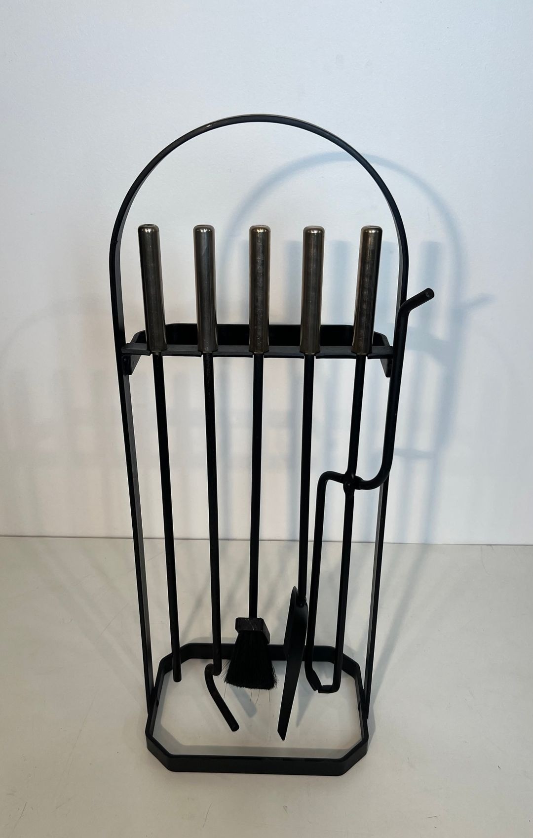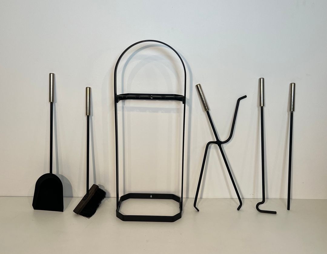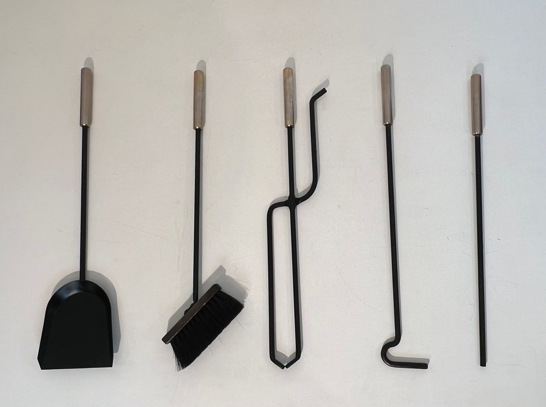 The individual tools are worked in black lacquered metal with chrome accents, their forms simplified to clean geometric essentials that complement the structural logic of the cage stand. This set represents a particularly self-assured example of French modernist fireplace design, in which functional considerations and formal ambition are held in confident equilibrium.
