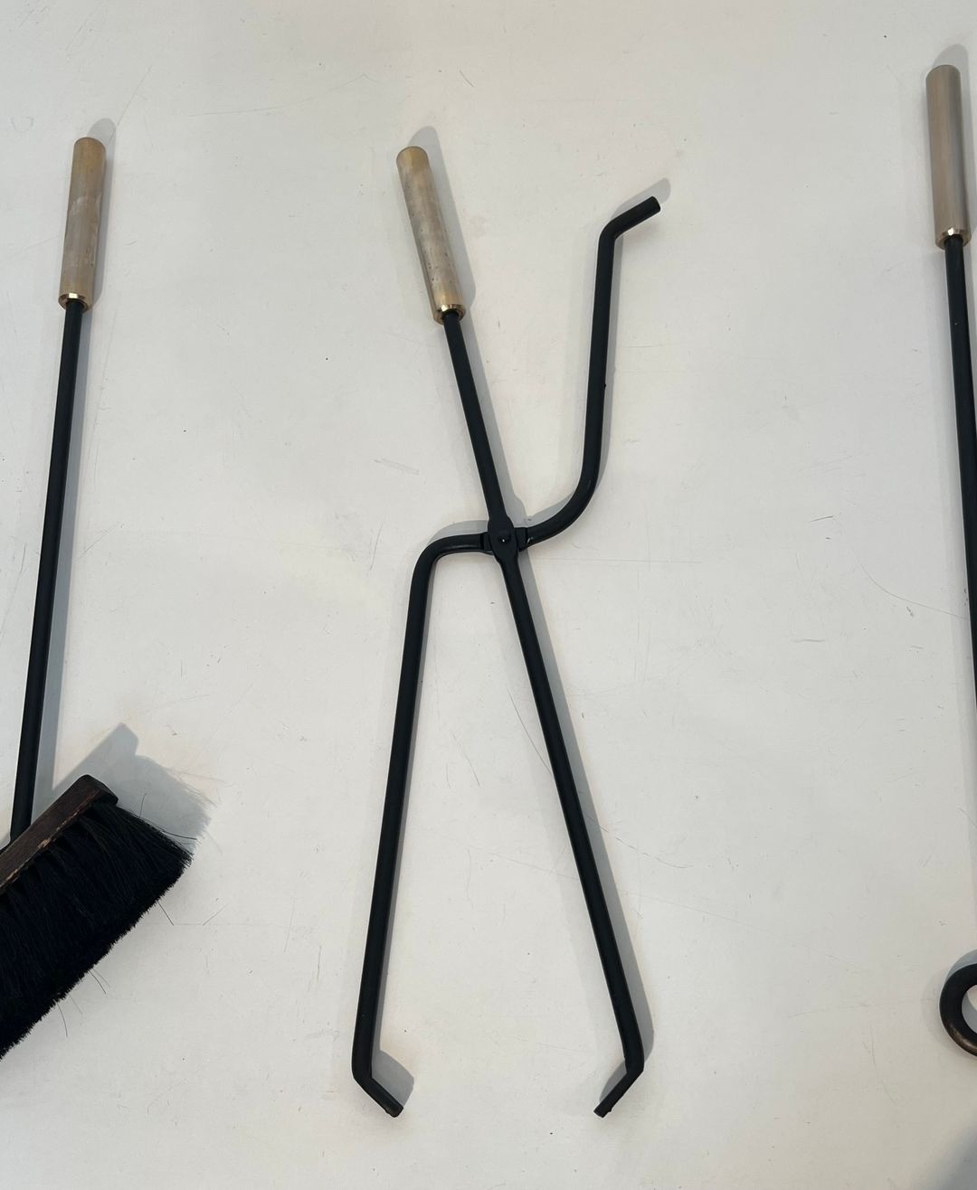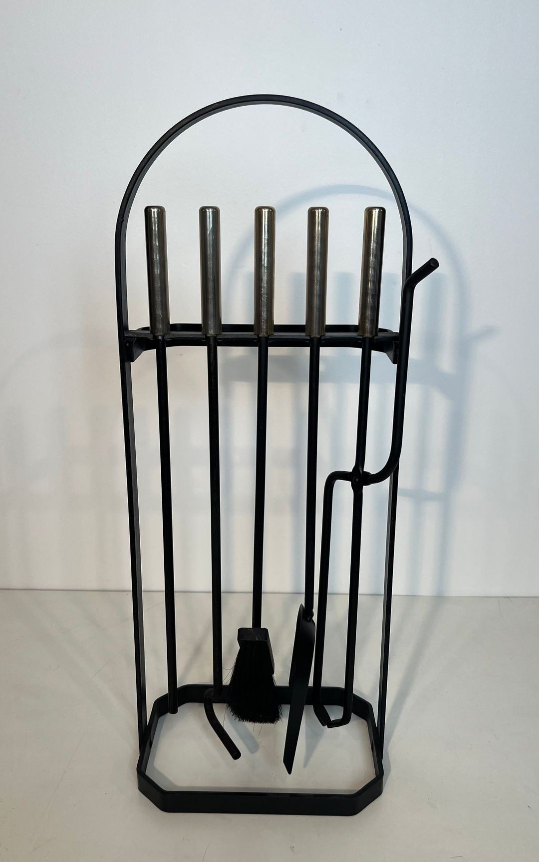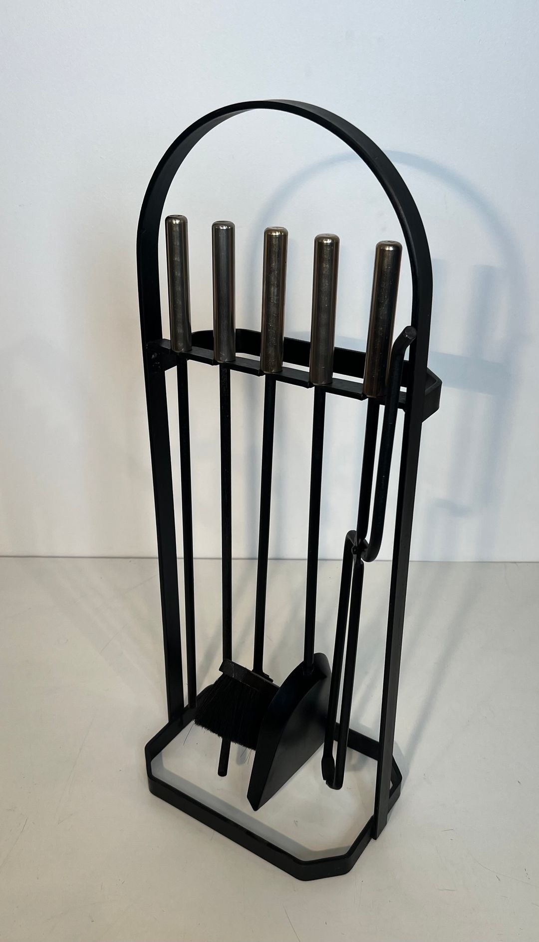 The individual tools are worked in black lacquered metal with chrome accents, their forms simplified to clean geometric essentials that complement the structural logic of the cage stand. This set represents a particularly self-assured example of French modernist fireplace design, in which functional considerations and formal ambition are held in confident equilibrium.
