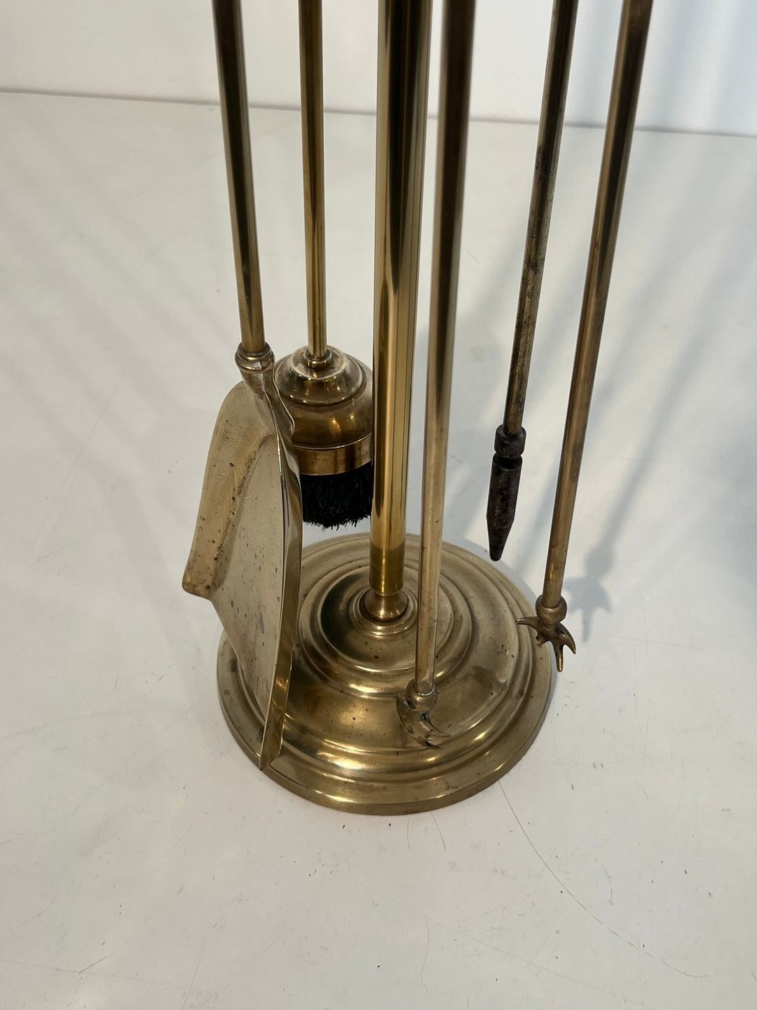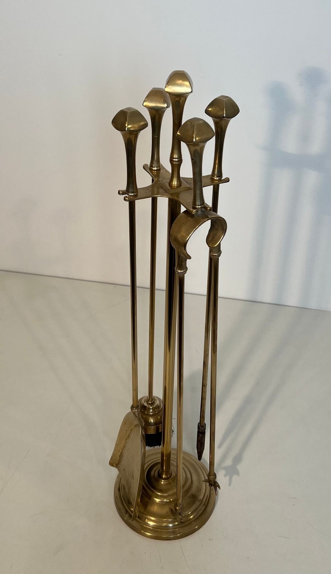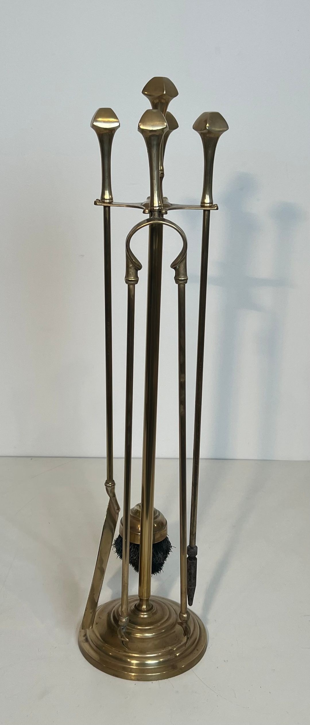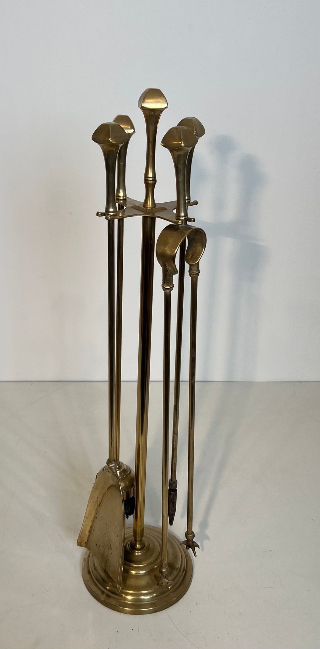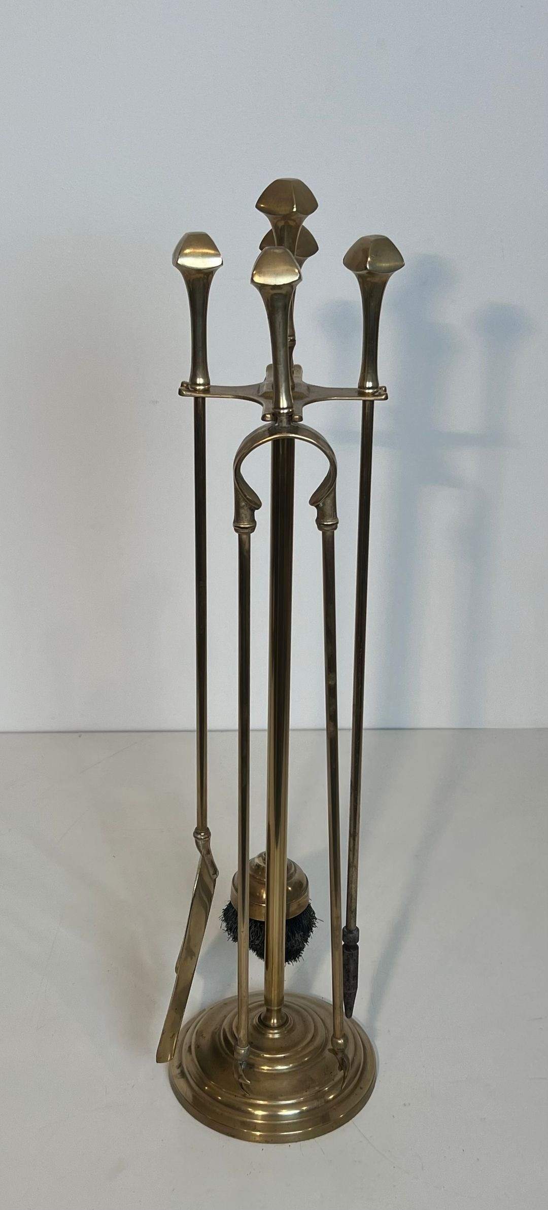 This set comprises five polished brass fireplace tools — poker, shovel, tongs, brush, and stand — each crowned with a flat disc finial that echoes the horizontal emphasis characteristic of neoclassical ornament. The slender cylindrical shafts rise from a circular disc-footed stand, their uniform height and smooth finish conveying the understated elegance associated with the period.