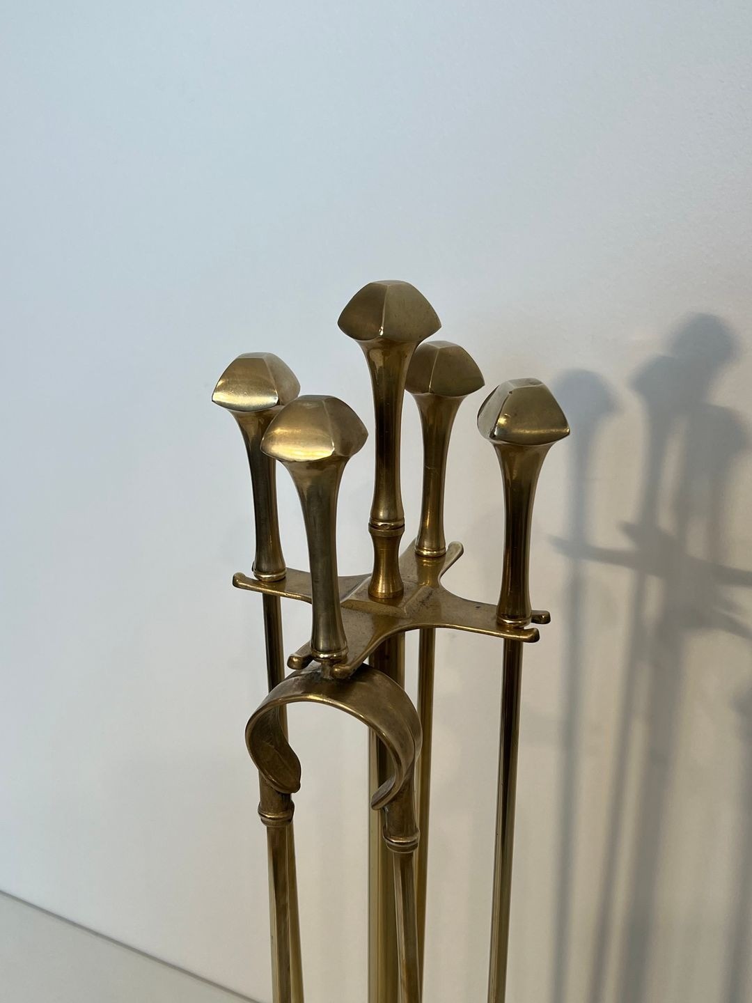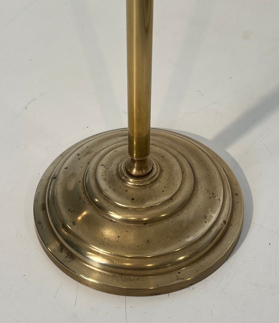 The restrained geometry of the finials — wide, flat discs silhouetted against the tall shafts — draws from the repertoire of neoclassical design, where horizontal elements and clean profiles were favored over baroque exuberance. The polished brass retains a warm golden patina, enriched by decades of careful use, that lends depth and richness to each surface.