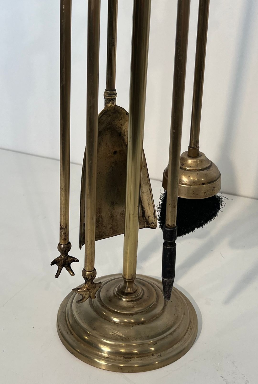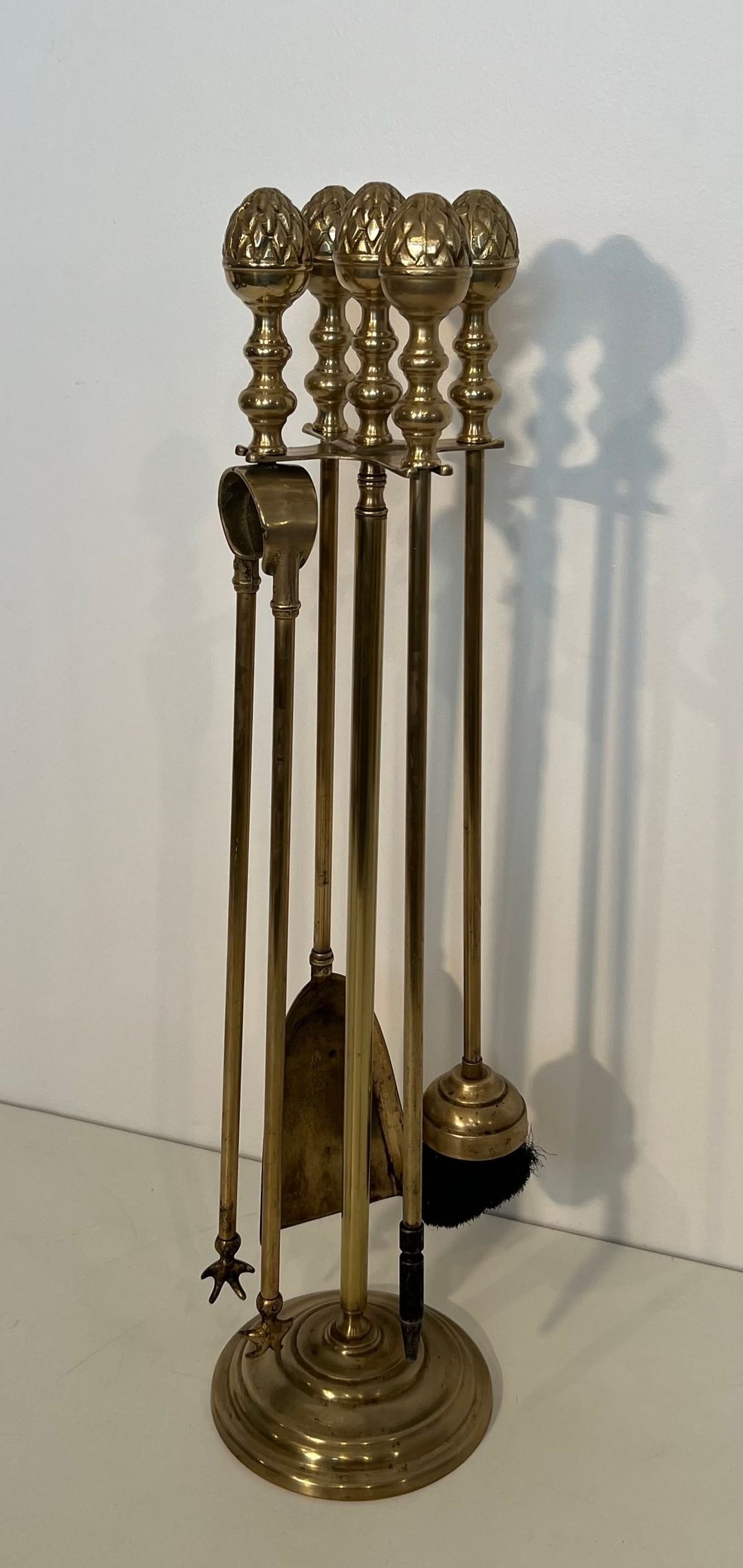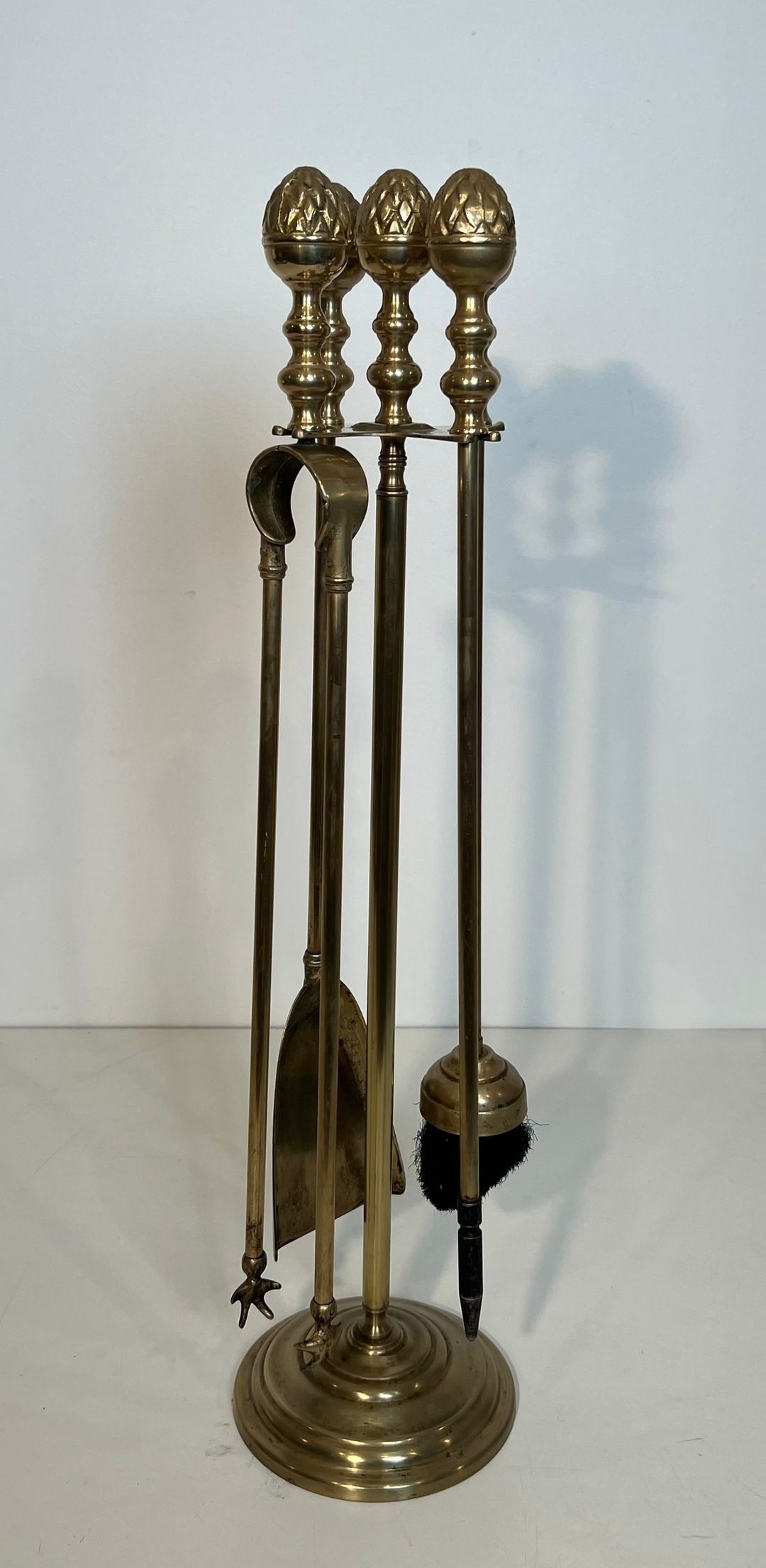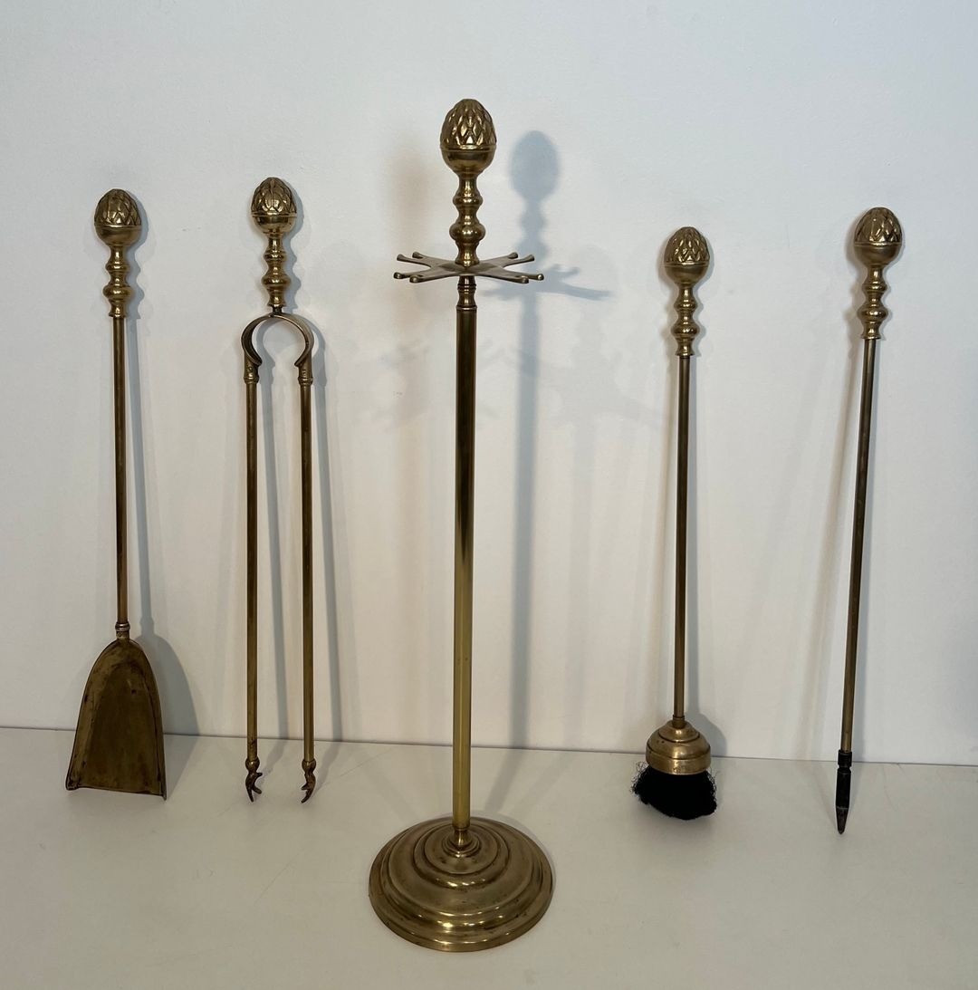 An exceptionally refined brass fireplace companion set conceived in the grand Neoclassical manner and executed in the spirit of Maison Baguès, the Parisian maison whose sumptuous fire accessories defined the highest expression of French decorative metalwork throughout the 20th century. The set comprises four tools—poker, shovel, brush, and tongs—presented on a circular disc stand, each piece united by a design vocabulary of polished brass, decorated shafts, and imposing pine cone finials of considerable sculptural presence.