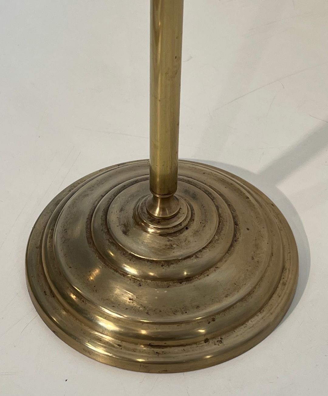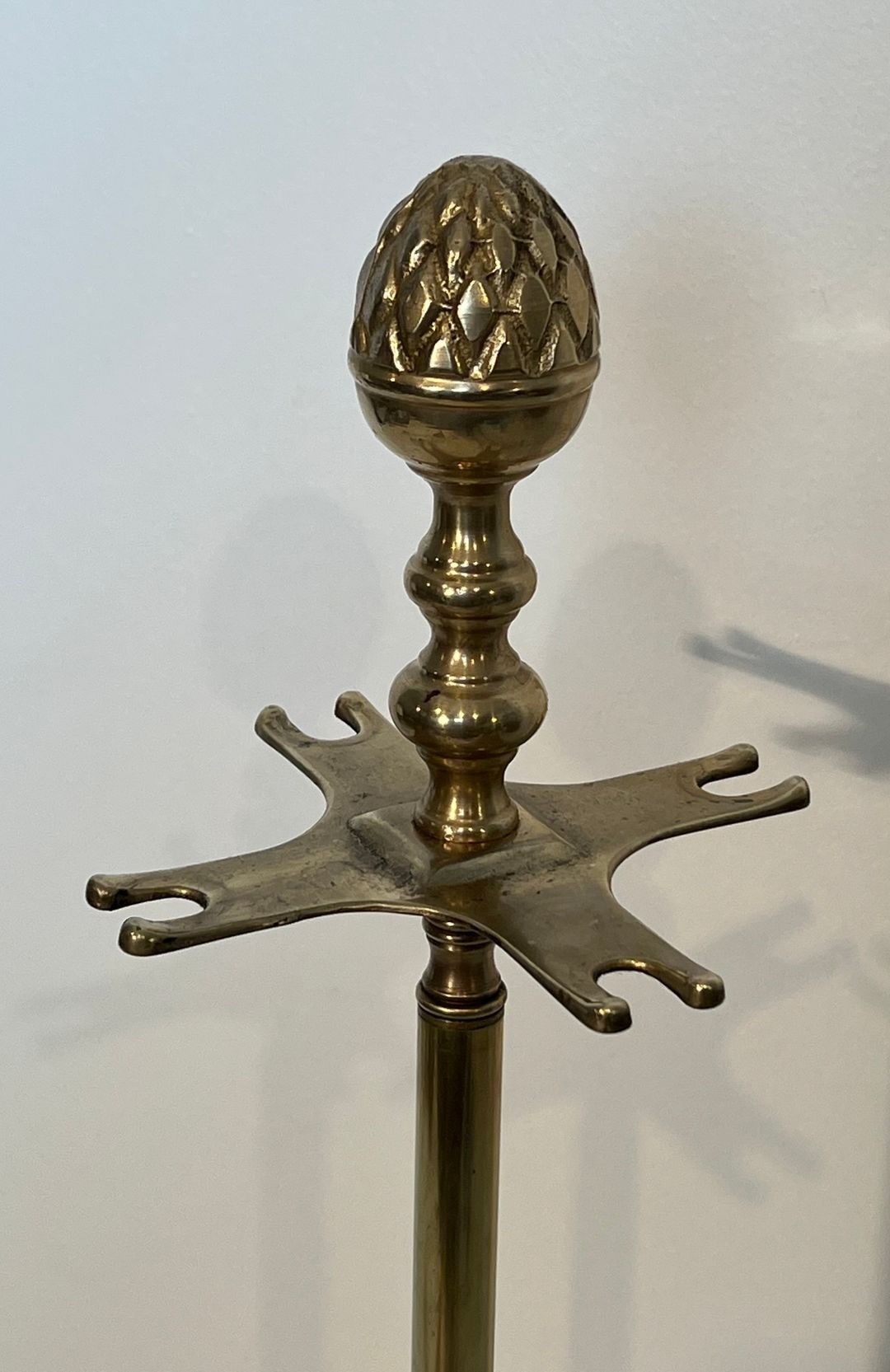 The pine cone finials of this set are particularly noteworthy for their size and three-dimensional elaboration: each cone is rendered with carefully modelled overlapping scales that build to a compact, pointed apex, the entire surface catching light across its many facets. Decorative knops punctuate the shafts at intervals, adding visual rhythm and recalling the turned finals of Louis XVI furniture mounts. The circular disc base, engraved or chased, completes the ensemble with stability and elegance.