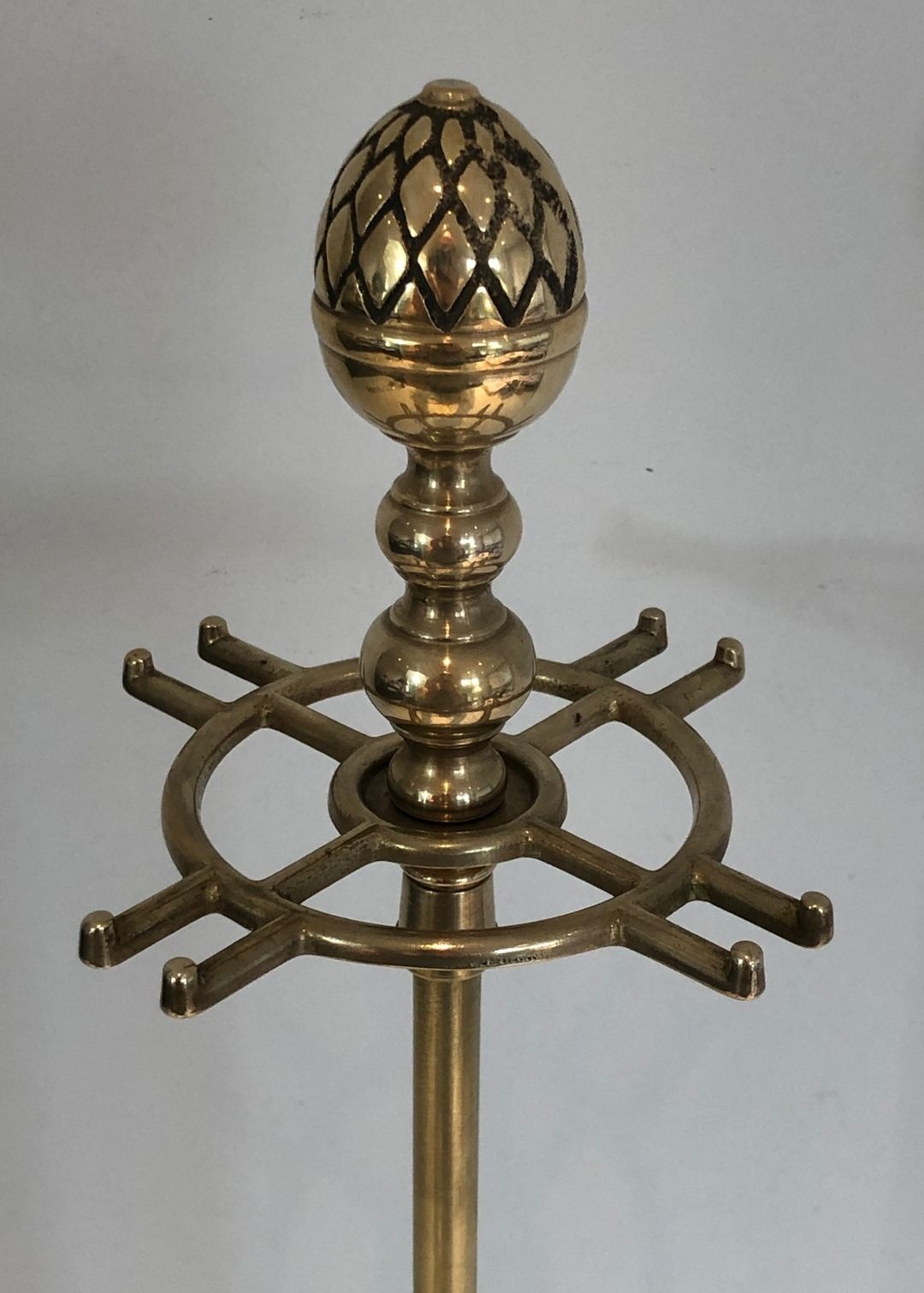 The pine cone finial—pomme de pin in the French tradition—is one of the most enduring motifs of Neoclassical decoration, drawn from the acanthus and foliate vocabulary of antiquity and used extensively in French Empire and Louis XVI style metalwork. Here, each finial is carefully rendered in repoussé or cast brass, the overlapping scales of the cone forming a tactile, three-dimensional cap that crowns each tool with both elegance and practical grip.