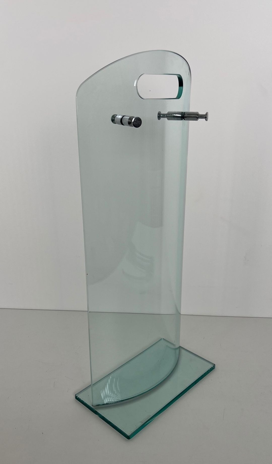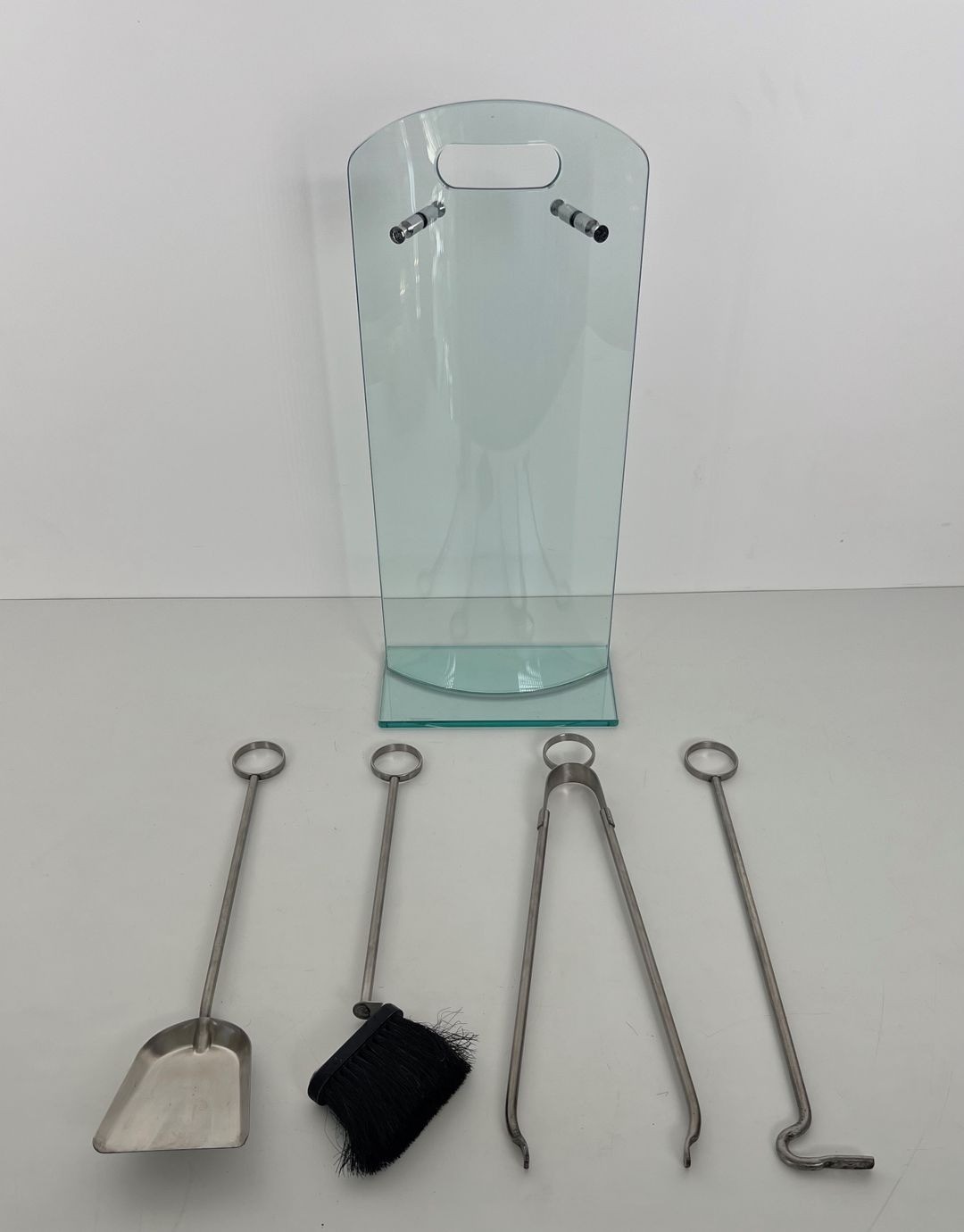 This fireplace companion set is a compelling example of French design of the 1970s at its most inventive, deploying the material language of Modernism — tempered glass, chrome, clean line — to reimagine an entirely traditional object. The stand abandons the conventional metal armature of the nécessaire de feu in favour of a tall rectangular panel of clear tempered glass rising from a flat glass base. From the upper edge of the panel hang four long-handled tools — shovel, poker, brush, and tongs — each with a circular chrome ring at its head, creating a silhouette of exceptional lightness in which the tools appear to float within the transparent structure.