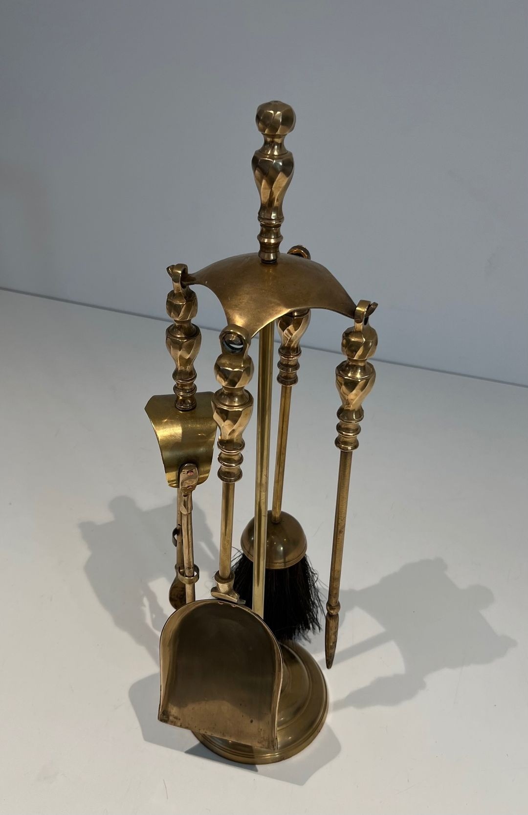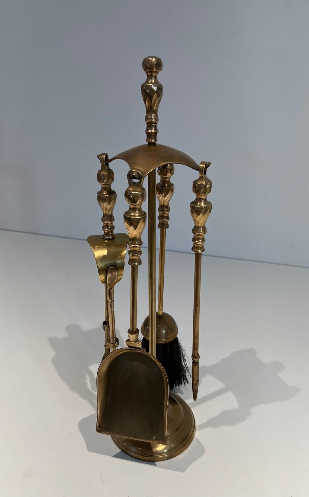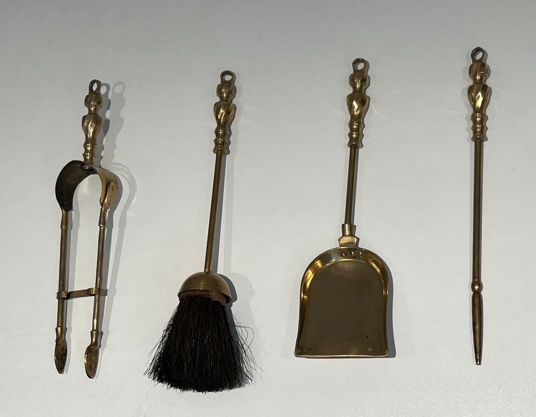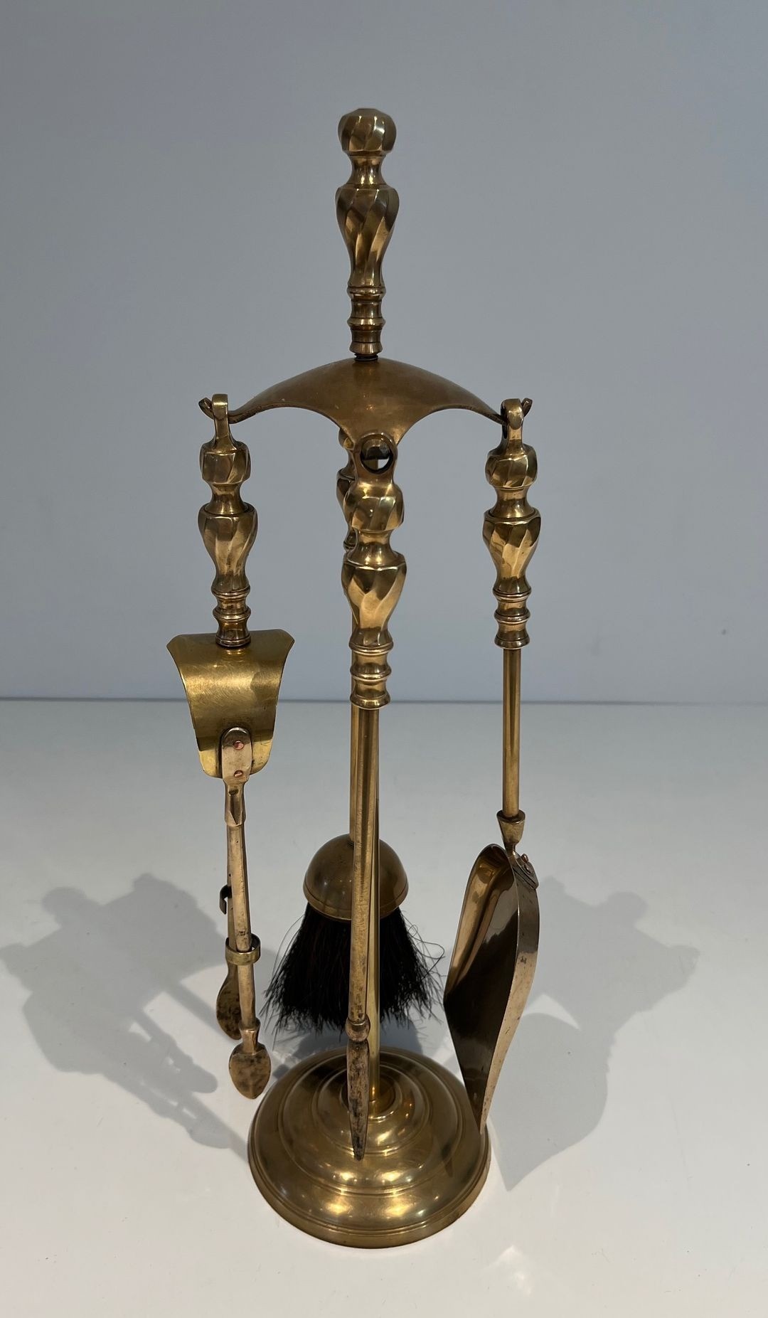 Neoclassical style brass fireplace companion set. The central turned upright post, crowned with a spherical finial, supports a semicircular arched frame studded with a continuous row of brass balls, from which three tools are suspended: a poker, a shovel and a brush. The base rests on four scrolled bracket feet. Polished brass. France. Circa 1970. W. 14.5 × D. 14.5 × H. 52 cm.