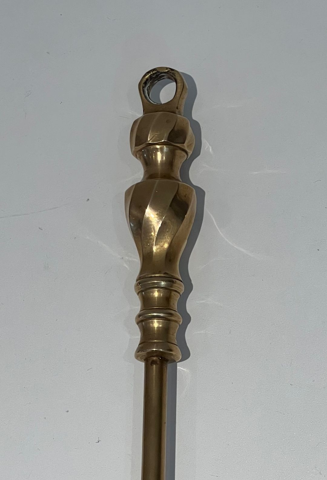 Suspended from the arch by individual rings are three fireplace tools — a poker, a flat-blade shovel and a stiff-bristle brush — each sharing the same turned brass construction and consistent formal language as the stand itself. The tools are perfectly balanced in weight and proportion, ensuring that the set presents with symmetry and visual harmony when at rest.