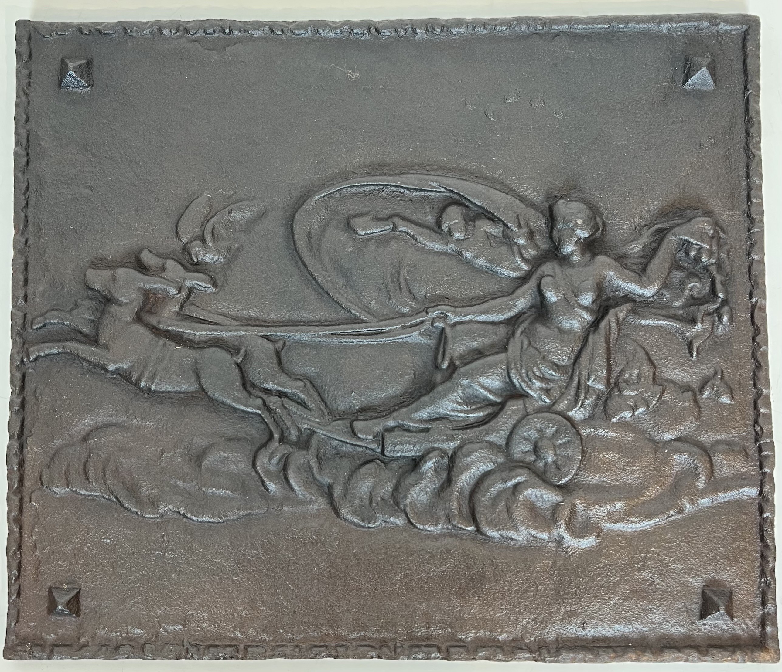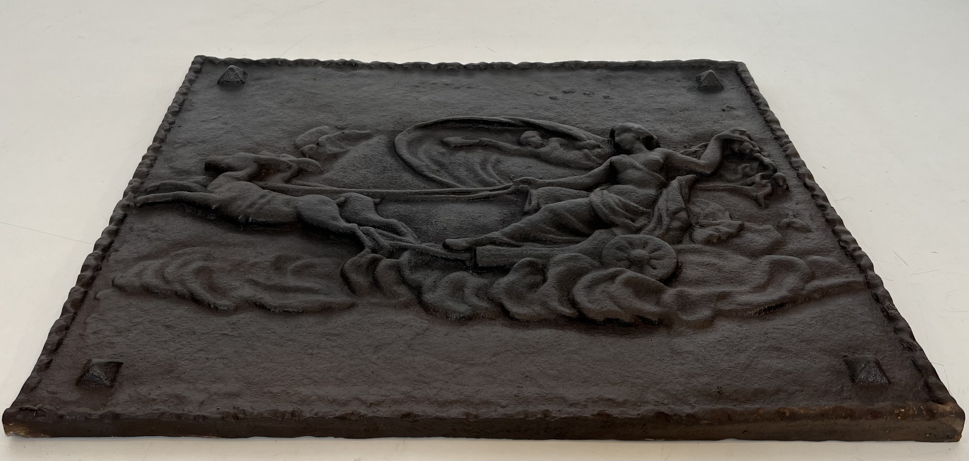 This magnificent cast iron fireback is a superb example of the tradition of mythological relief casting that has adorned French fireplaces since the Renaissance. Produced circa 1900, the piece depicts Diana, the Roman goddess of the hunt, triumphantly mounted on her chariot and drawn by her celebrated hunting hounds. The composition is rendered with a vigour and narrative energy worthy of the great relief casters of earlier centuries, the dynamic scene of the goddess in full stride conveying the exhilaration of the hunt and the divine authority of its presiding deity. The rich, velvety black surface of the cast iron lends the relief an almost sculptural presence.