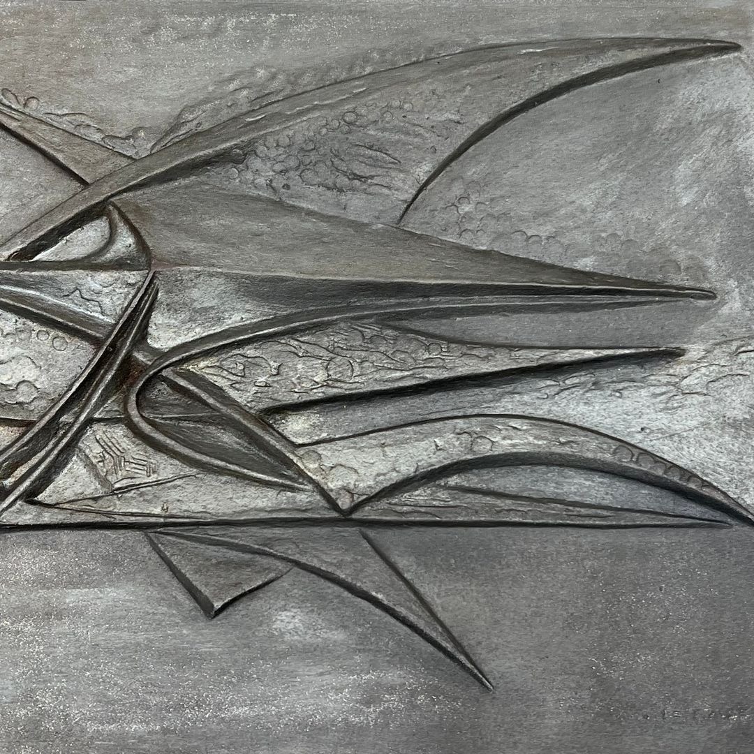 The fireback is signed and attributed to the Fonderie Stern, the Parisian foundry whose name appears on a number of distinguished post-war artistic firebacks in the French tradition, including signed works by Raina and Quellier. Stern was among the leading foundries supplying the Parisian interior market with artist-designed firebacks throughout the 1940s–1970s, working with sculptors and graphic artists to translate contemporary aesthetic languages into the durable medium of cast iron. The signature on this example — partially legible, possibly reading “G. Lecoff” — awaits definitive identification, but does not diminish the quality of the work.