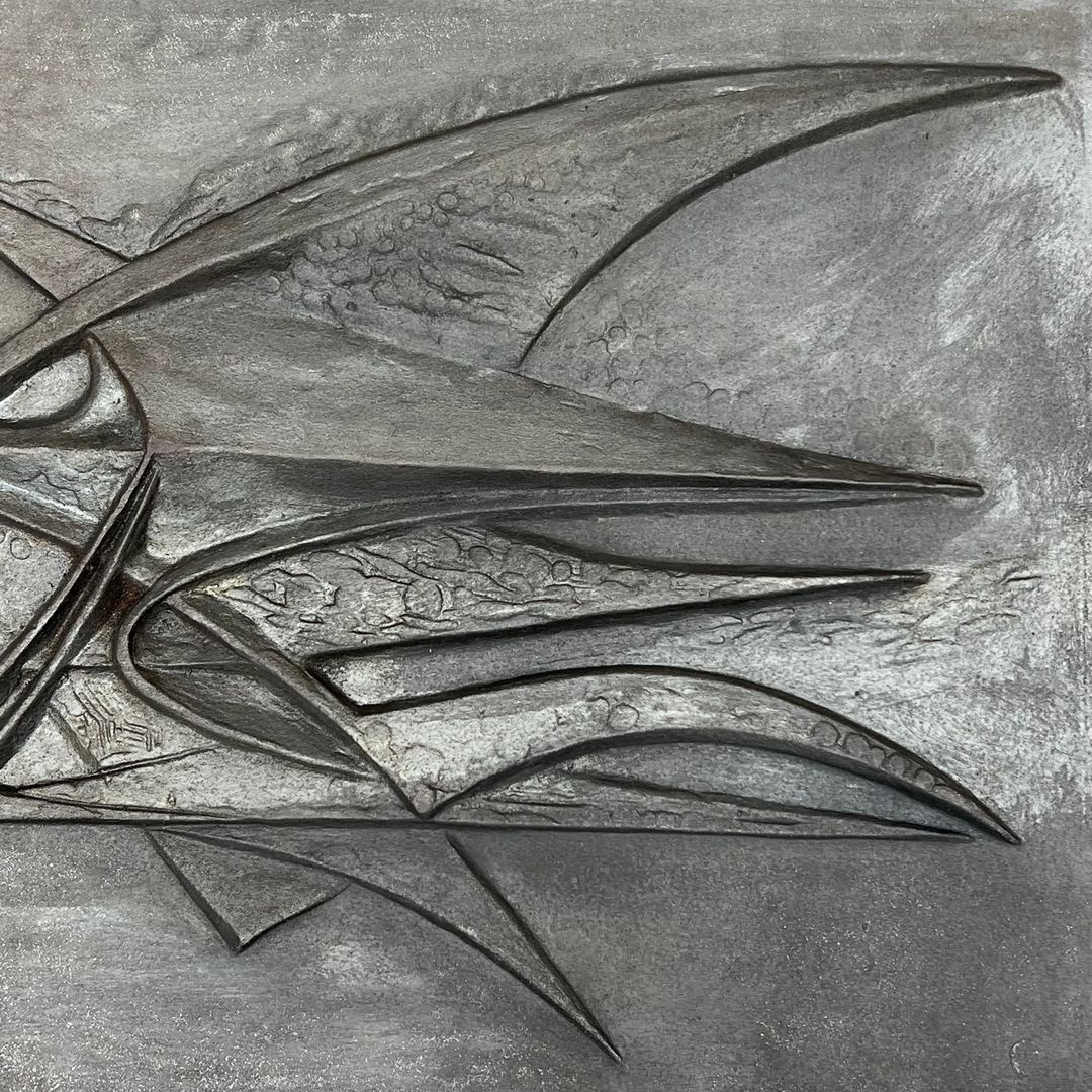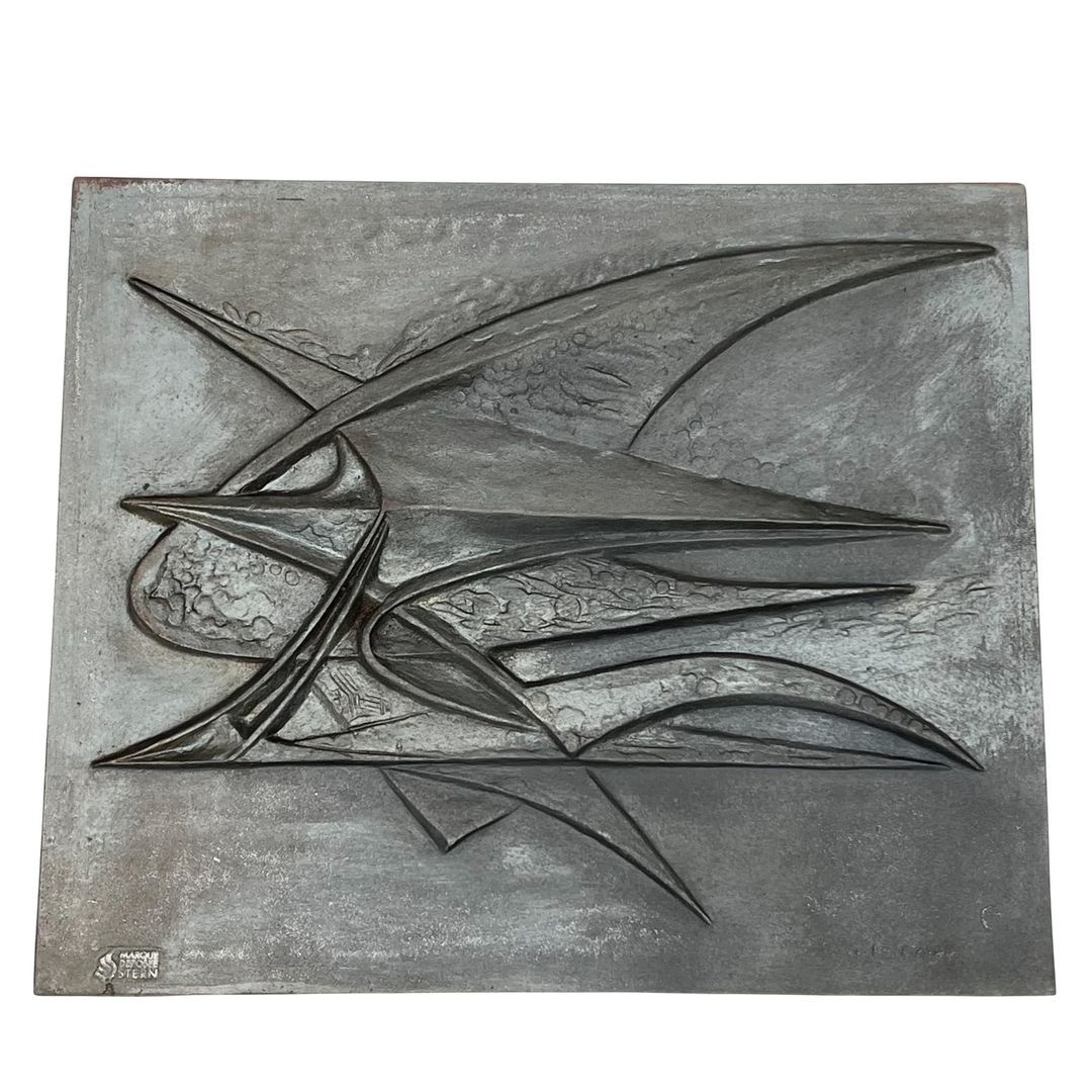 Modernist Cast Iron Fireback with Abstract Bird Motif, Signed, Foundry Stern, circa 1950