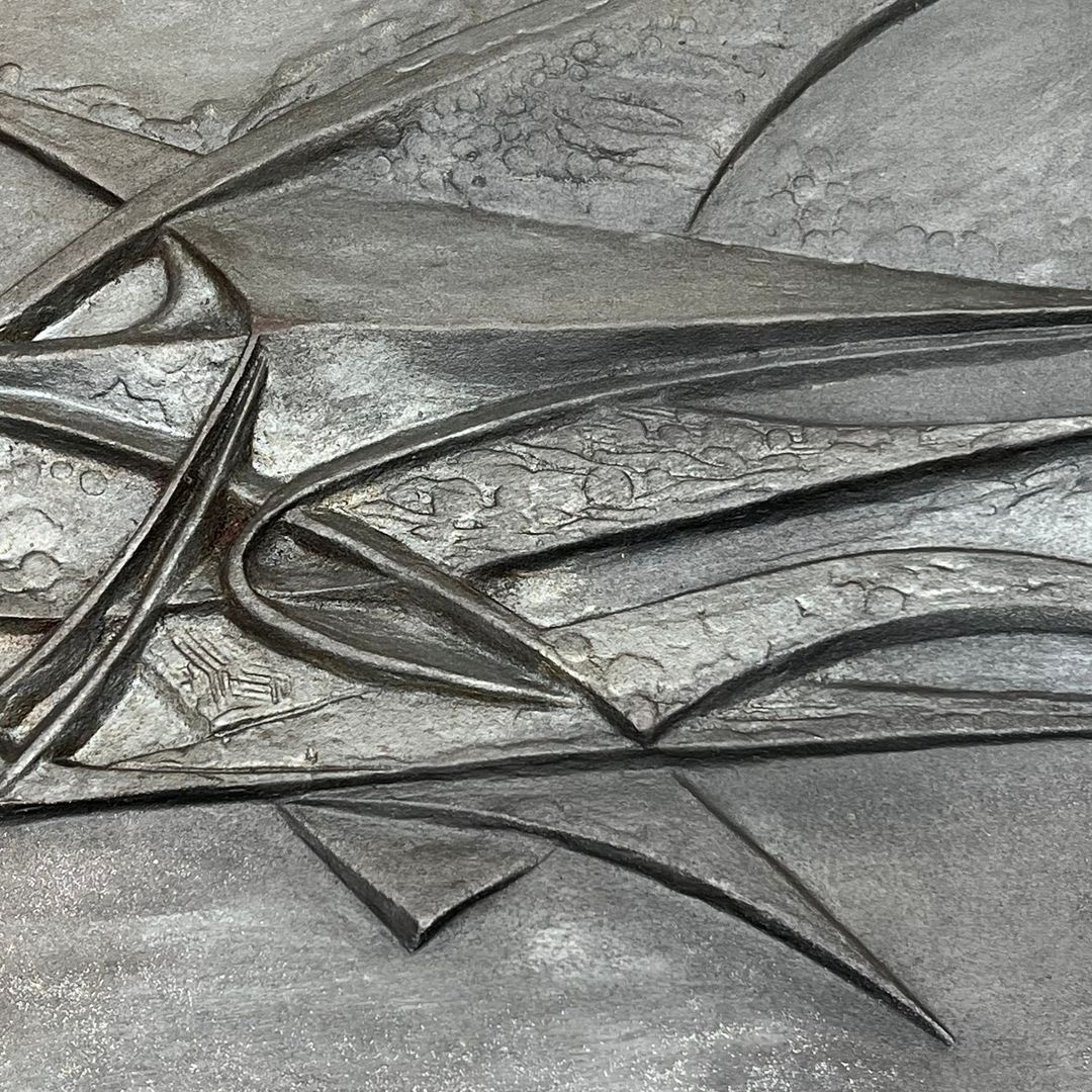 Modernist cast iron fireback with a bold abstract composition of raised lines evoking birds in flight or stylized aerodynamic forms. Signed, Foundry Stern, French, circa 1950. W. 60 × D. 3.5 × H. 50 cm.
