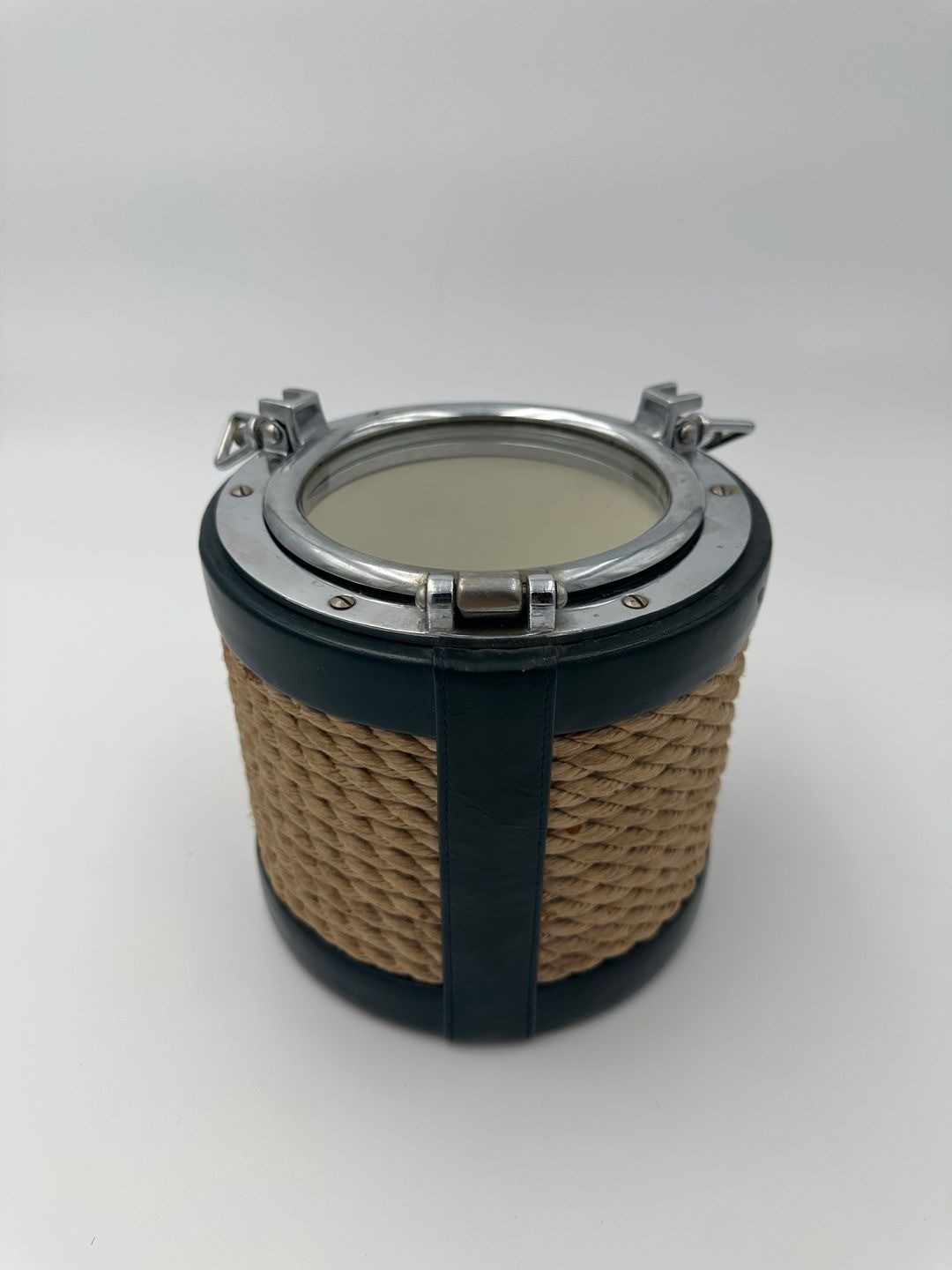 Cylindrical ice bucket with a hinged chrome lid and chrome interior, the body wrapped in dense natural rope with black leather bands at top and bottom. Clip clasps secure the lid. In the manner of Jacques Adnet. French work, circa 1950. W. 20 × D. 20 × H. 20.5 cm.