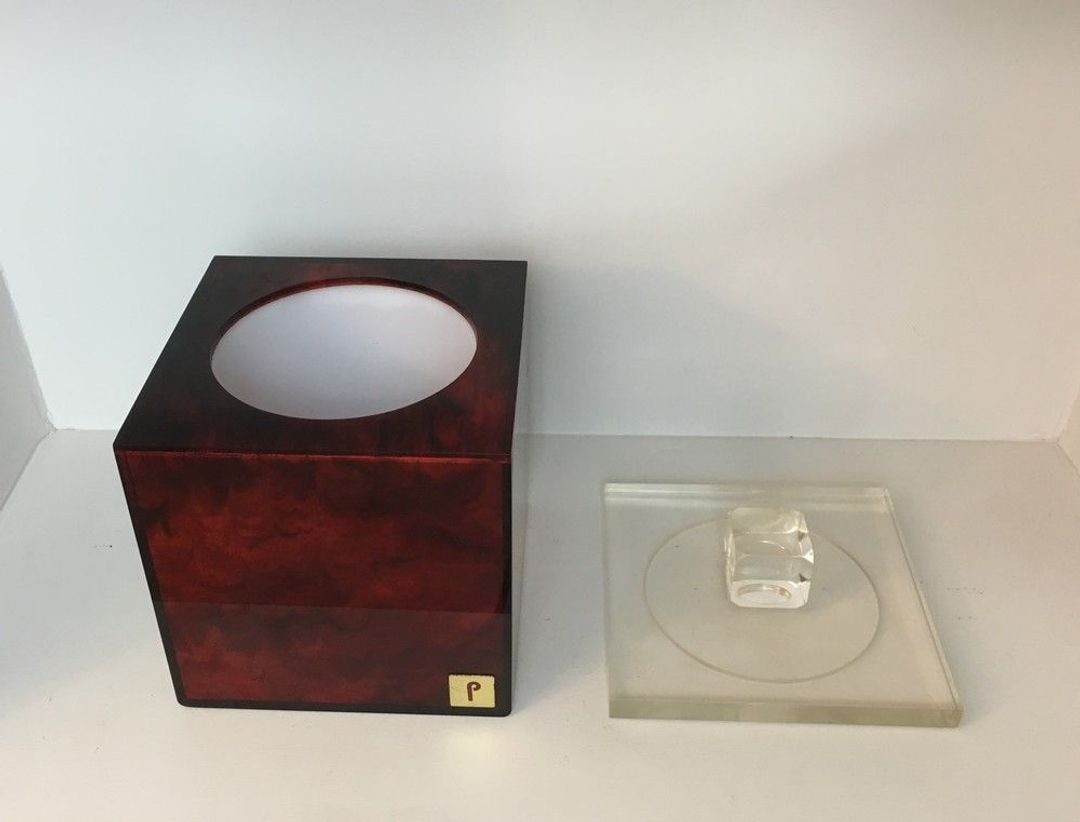A square ice bucket with a deep burgundy tortoiseshell-effect lucite body, a chrome-edged clear acrylic lid with a circular opening and a solid block handle, and a small brass signature plaque. Signed "P." French work, circa 1970. Dimensions: 15 × 15 × 19 cm.