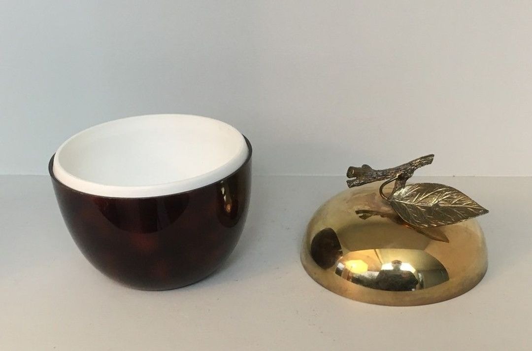 A trompe-l'œil ice bucket in the form of an apple, with a deep amber-red lucite lower body and a polished gilt brass domed lid topped by a finely cast stem-and-leaf finial. French work, circa 1970. Dimensions: 13.5 × 13.5 × 16 cm.