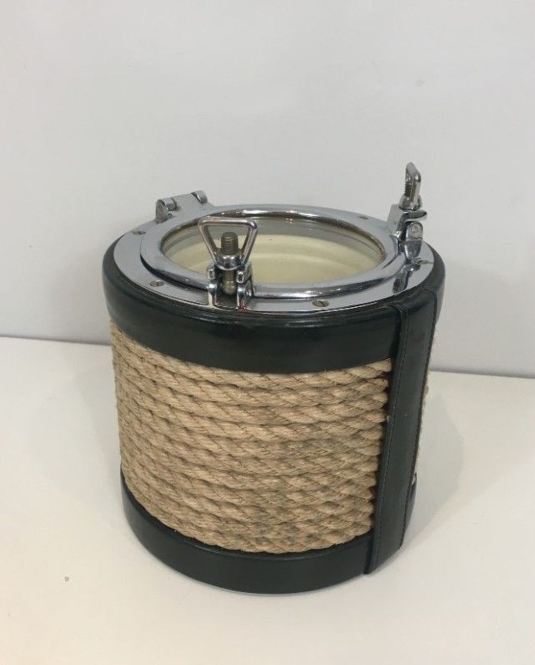 This ice bucket presents a composition of materials and forms that is immediately recognisable as belonging to the refined tradition of French mid-century domestic accessories. The cylindrical body is wrapped in tightly coiled natural rope — sisal or hemp — creating a warm, tactile surface that contrasts deliberately with the black leather banding at the upper and lower edges. The lid is a tour de force of the chrome metalsmith's art: a circular plate fitted with a raised ring handle and secured by two elegant clip clasps that pivot open with the precision of fine hardware. Seen from above, the piece suggests a ship's porthole, an allusion that feels entirely appropriate to an object associated with the chill of ice and the ceremony of drinks service.