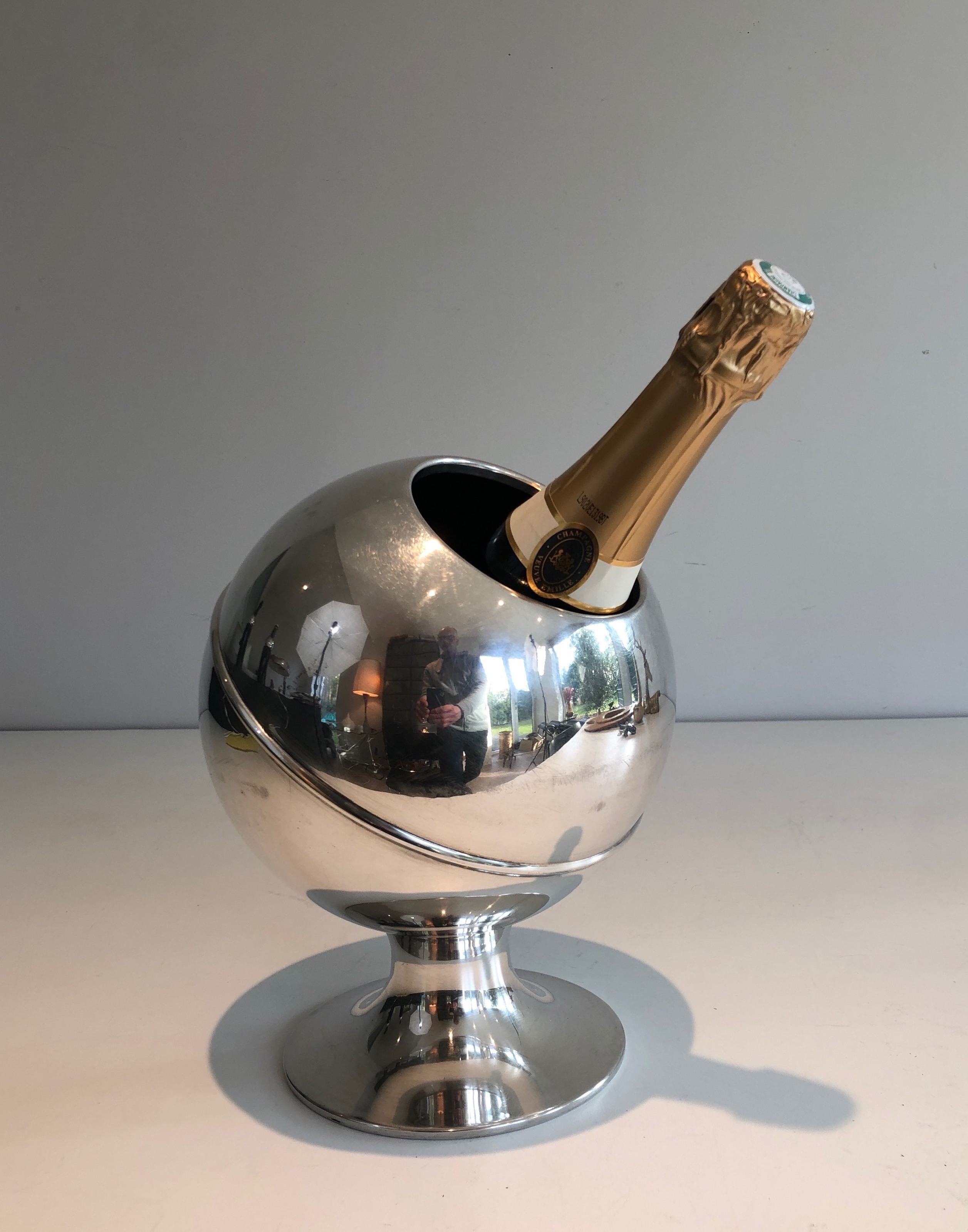 The chrome finish is in fine condition, maintaining its capacity to reflect and multiply light in the manner characteristic of the finest decorative metalwork of the period. The cylindrical form is well proportioned for a champagne or wine bottle, combining generous depth with the clean vertical line that distinguishes it from the more ornate bucket forms of earlier periods.