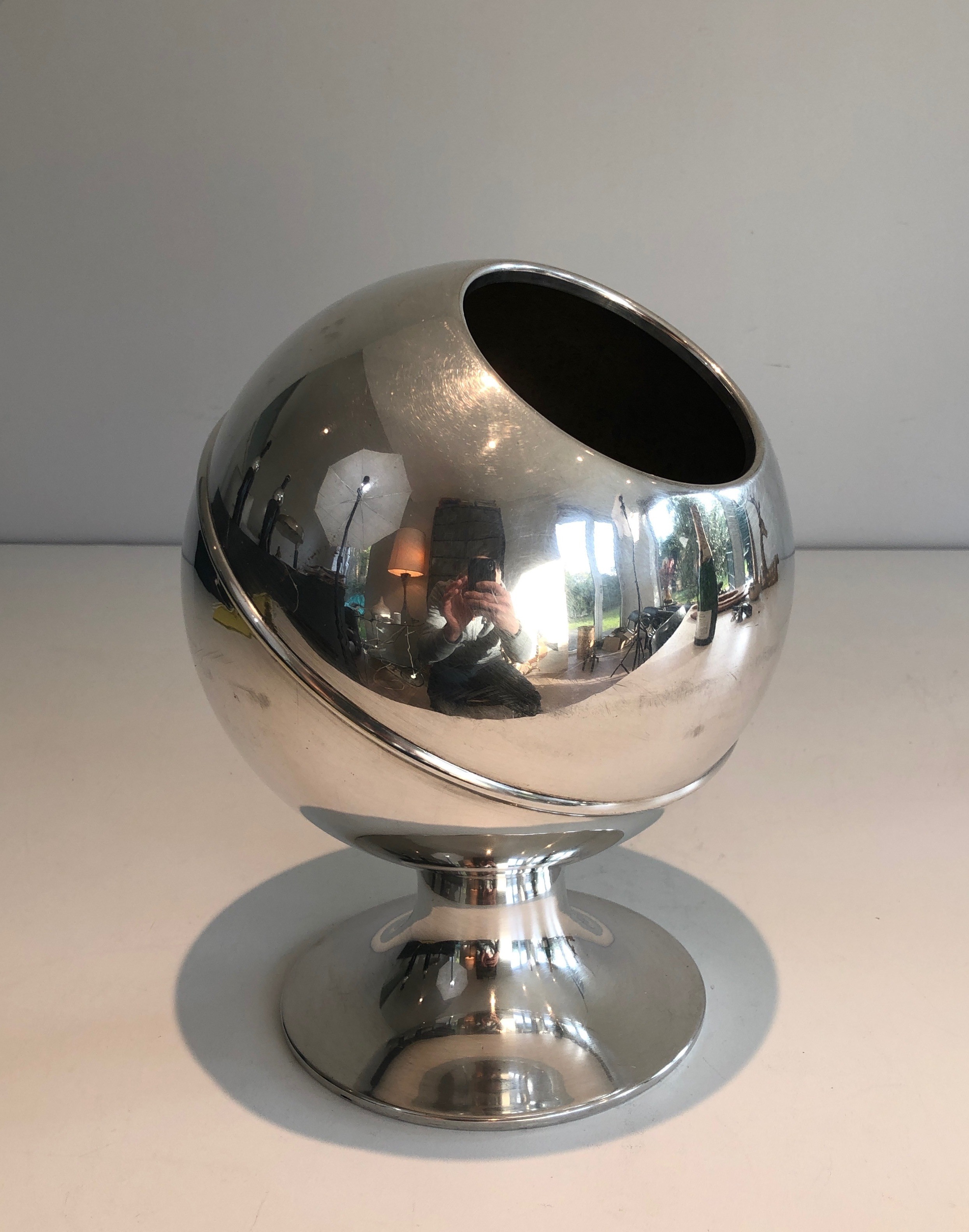 This cylindrical champagne ice bucket, standing at 26.5 cm with a base of 20 × 20 cm, represents the French approach to functional luxury in the modernist vein. Its clean geometry — precise, unornamented, and reliant entirely on the quality of the chrome surface for its aesthetic impact — reflects the era's conviction that beauty resided in clarity of form and material perfection rather than in applied decoration.