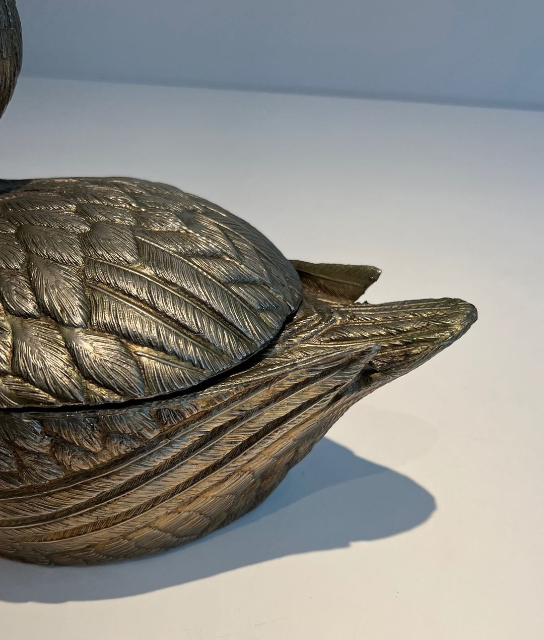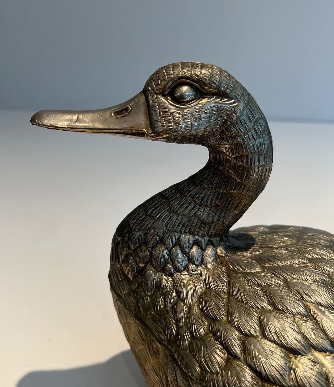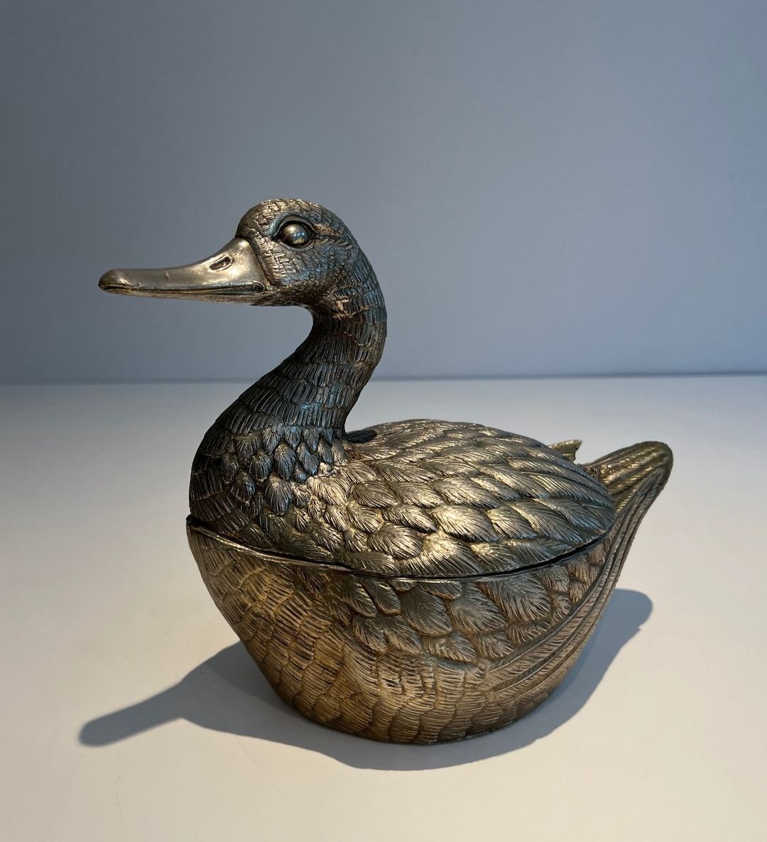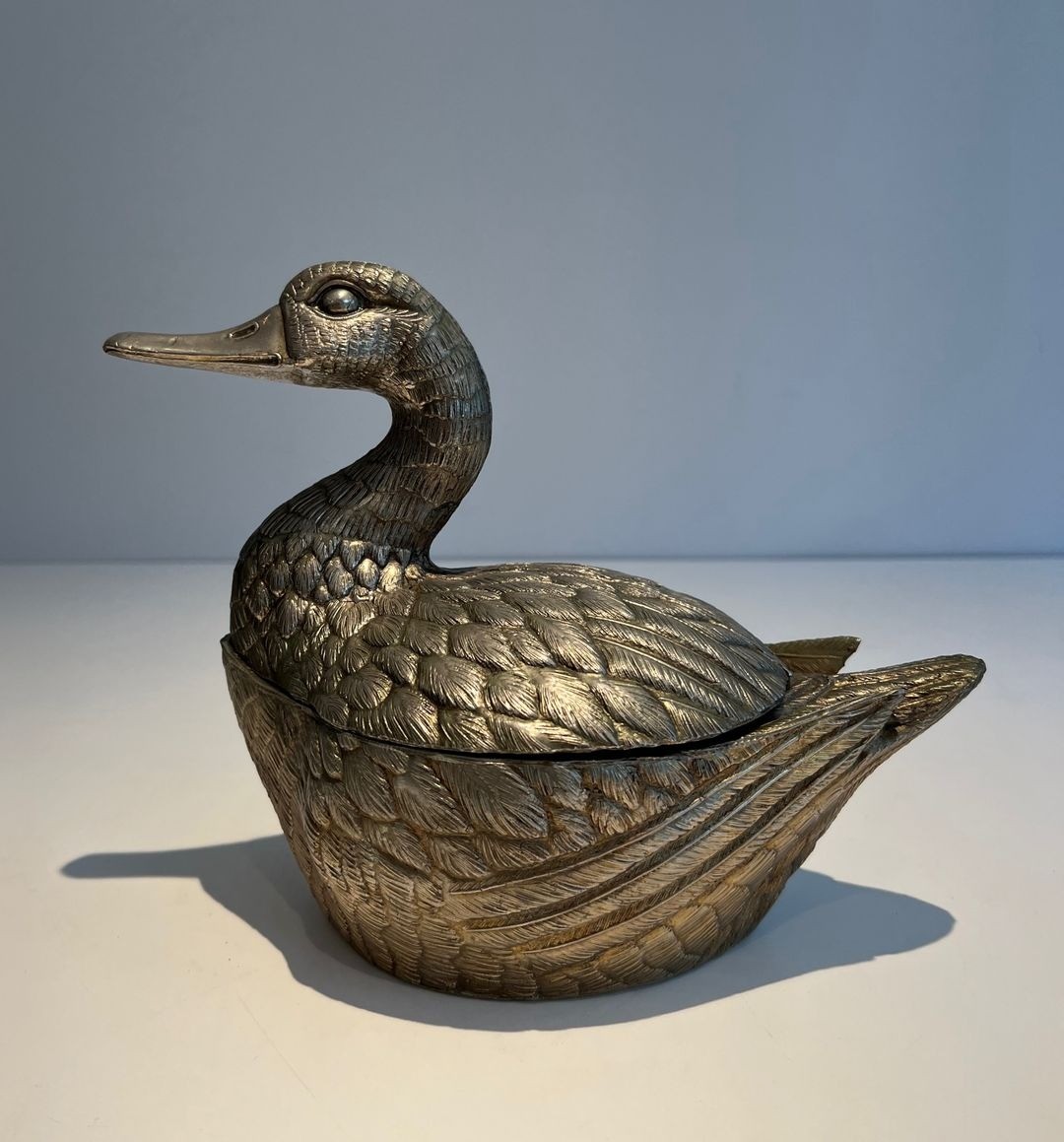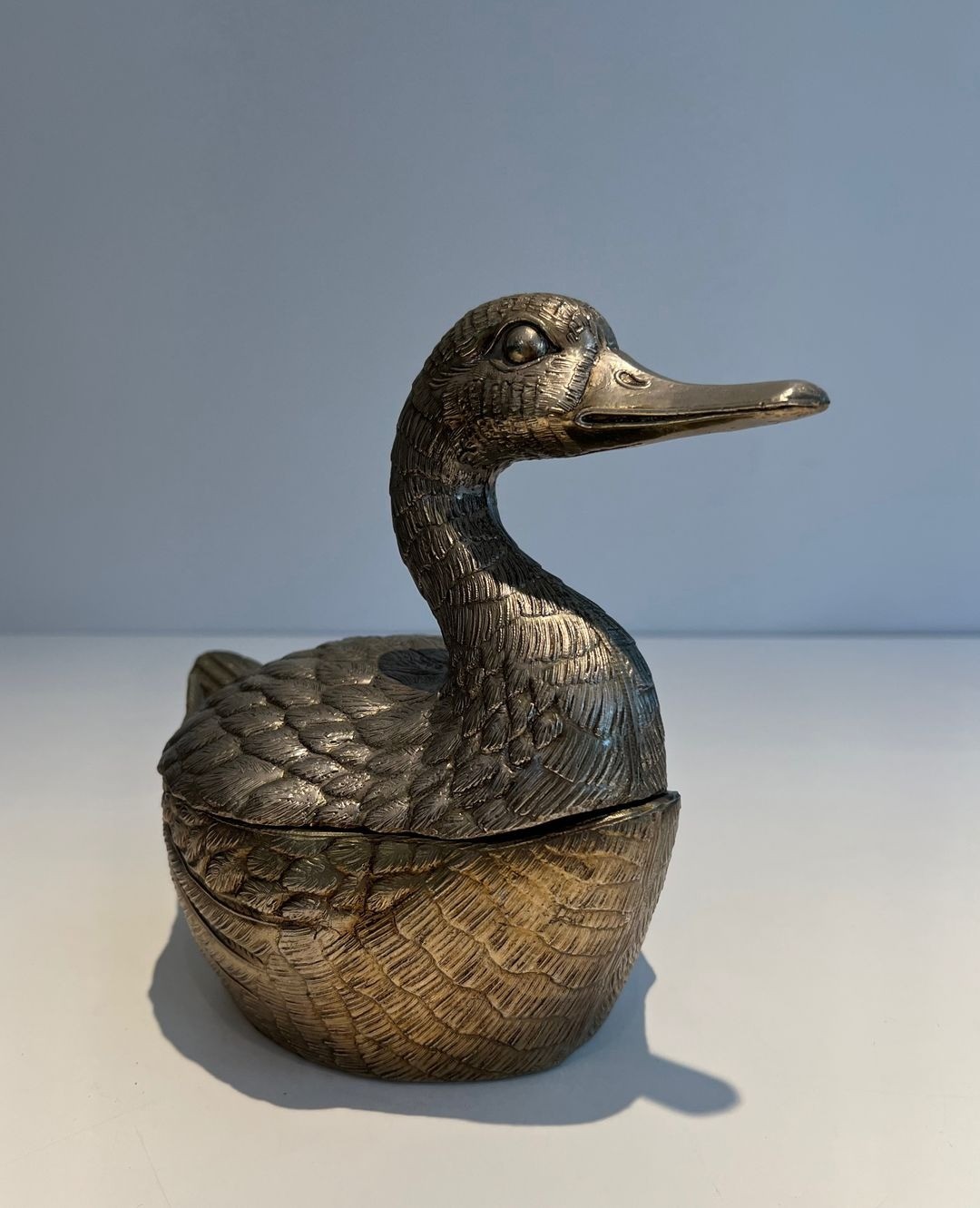 This magnificent silvered metal duck is one of the most charming and functional objects in the Italian decorative arts tradition of the post-war period: an ice bucket conceived as a naturalistic sculpture. The entire form is that of a sitting duck — the head and neck sculpted with confident naturalism, the wings folded against the sides, the tail cleanly resolved — and the upper portion of the body lifts away to reveal the interior metal liner designed to hold ice and a bottle. Every surface is worked with a finely textured, scale-like pattern that evokes the individual feathers of the bird with great decorative effect, the silvered finish catching the light from every angle.