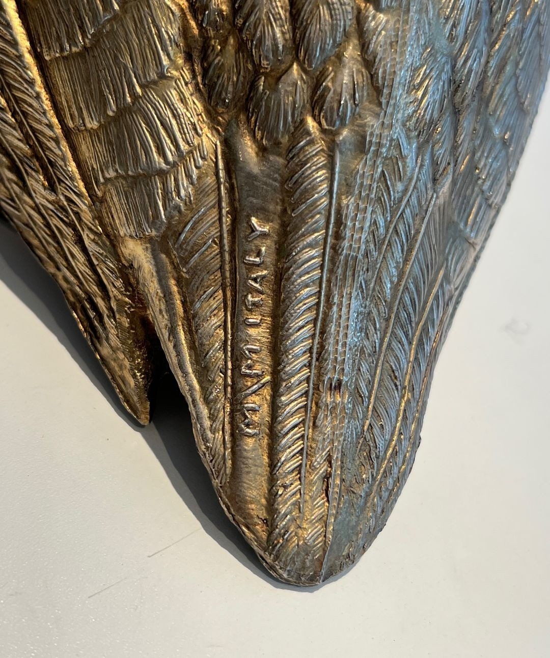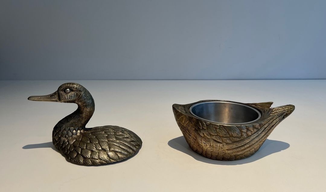 Elegant silvered metal ice bucket in the form of a duck, the body opening to reveal the interior container. Finely textured feather surface throughout. Signed Mauro Manetti. Italian work, circa 1970. W. 28 × D. 15.5 × H. 21.5 cm.