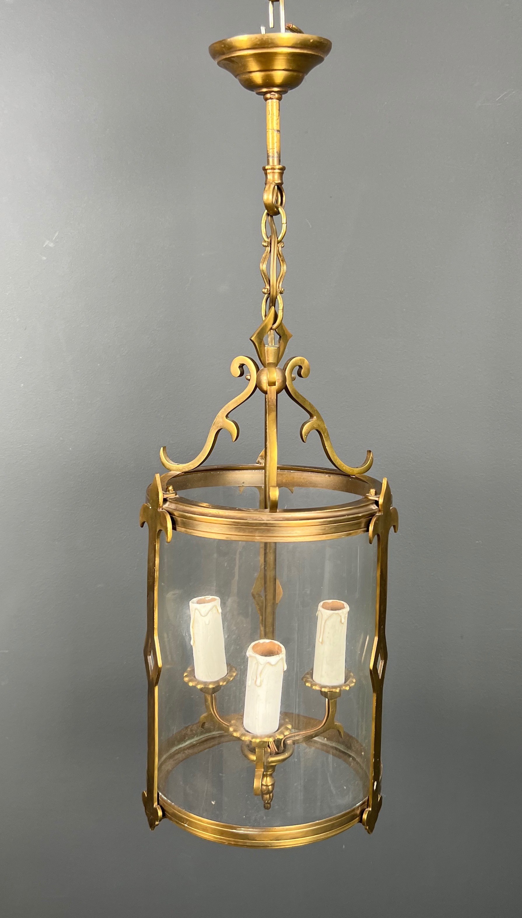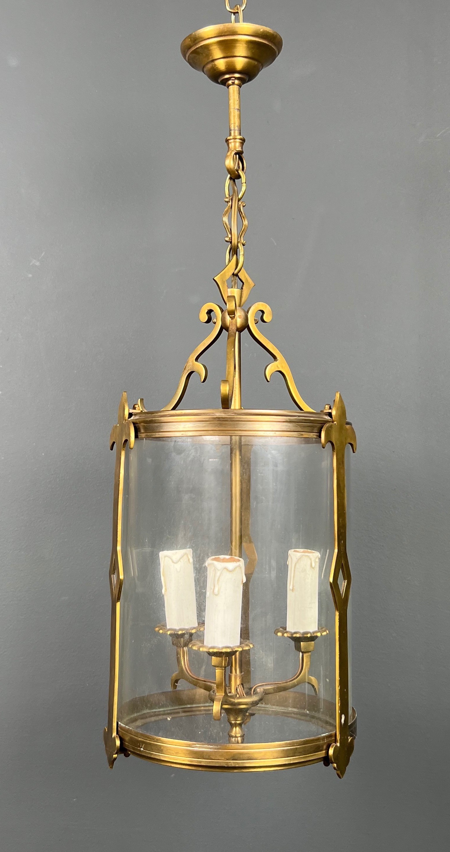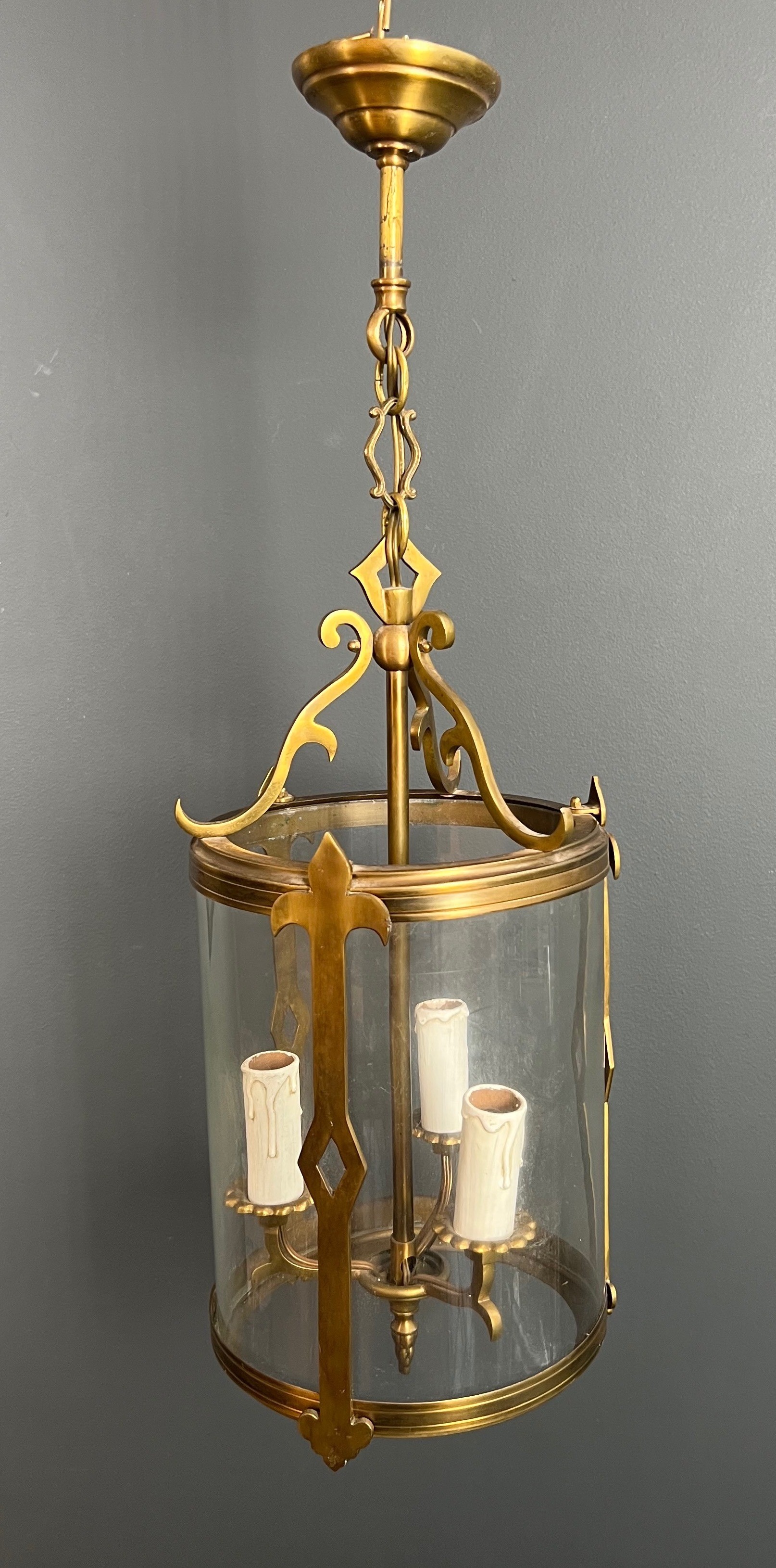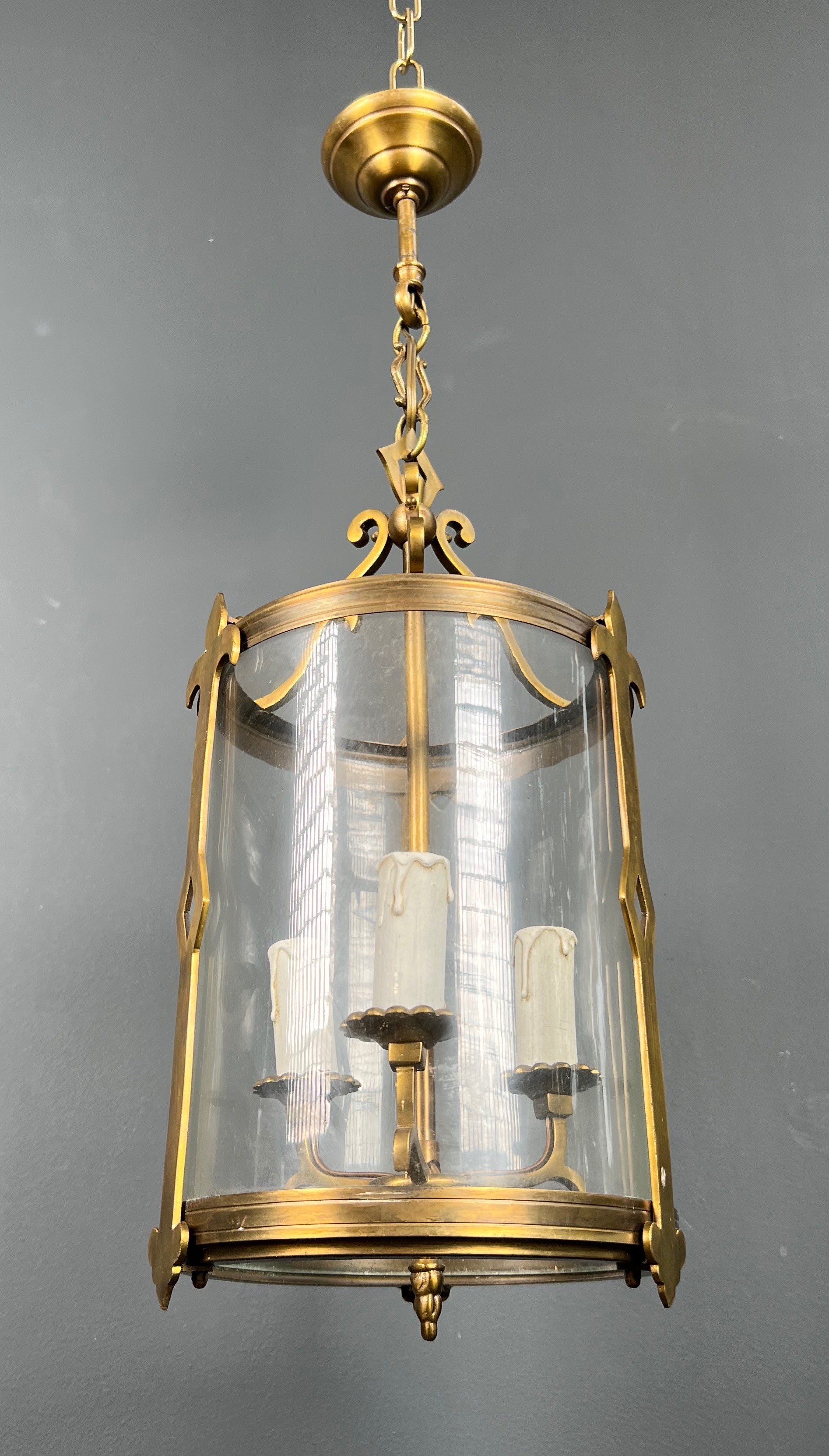 This lantern is ideally suited to a variety of interior positions: suspended in an entrance hall or foyer, above a stairwell, over a dining table for intimate atmosphere, or in a bedroom or corridor as an elegant accent light. Its modest scale bestows a versatility that permits it to complement both intimate spaces and larger rooms with equal ease. The warmth of patinated bronze combined with the soft glow diffused through its clear glass panels makes this a supremely atmospheric and beautiful lighting object.