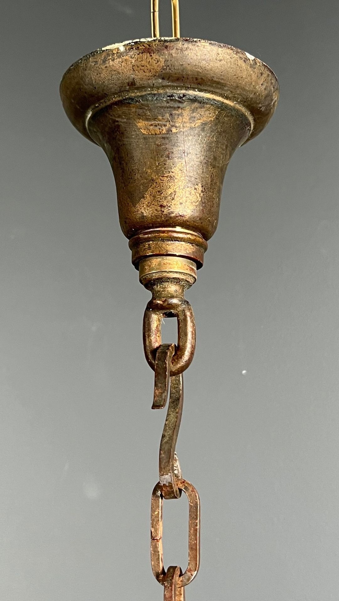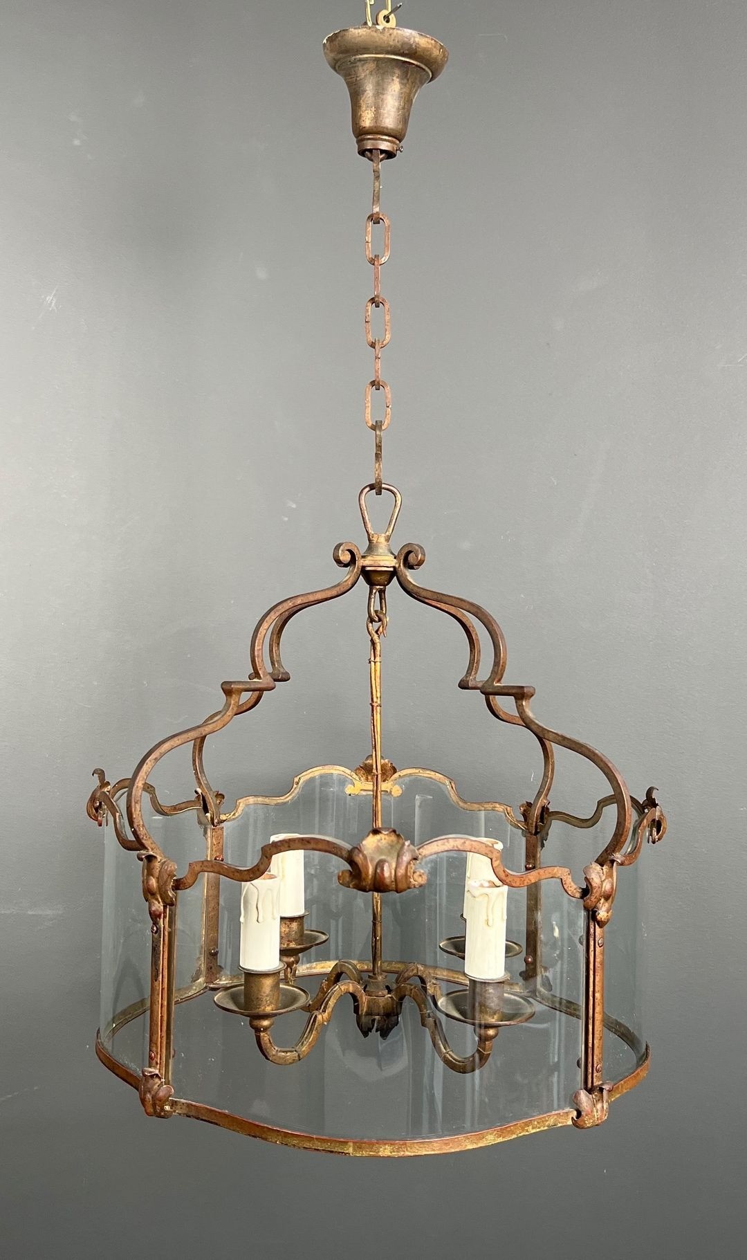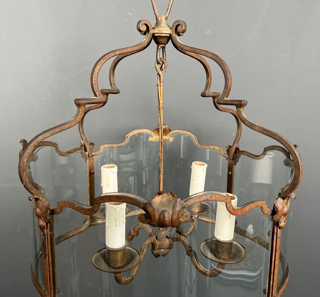 A lantern of this scale — nearly a metre in height and nearly half a metre across — belongs to the category of objects conceived for grand spaces: the entrance halls of châteaux and hôtels particuliers, the staircases of manor houses, or the vaulted corridors of institutional buildings of the first rank. Four-light lanterns of this quality in original condition are rarely encountered; they are objects made to last and to impress, and which, when found, represent an exceptional opportunity for the collector or interior decorator seeking a centrepiece of genuine authority.