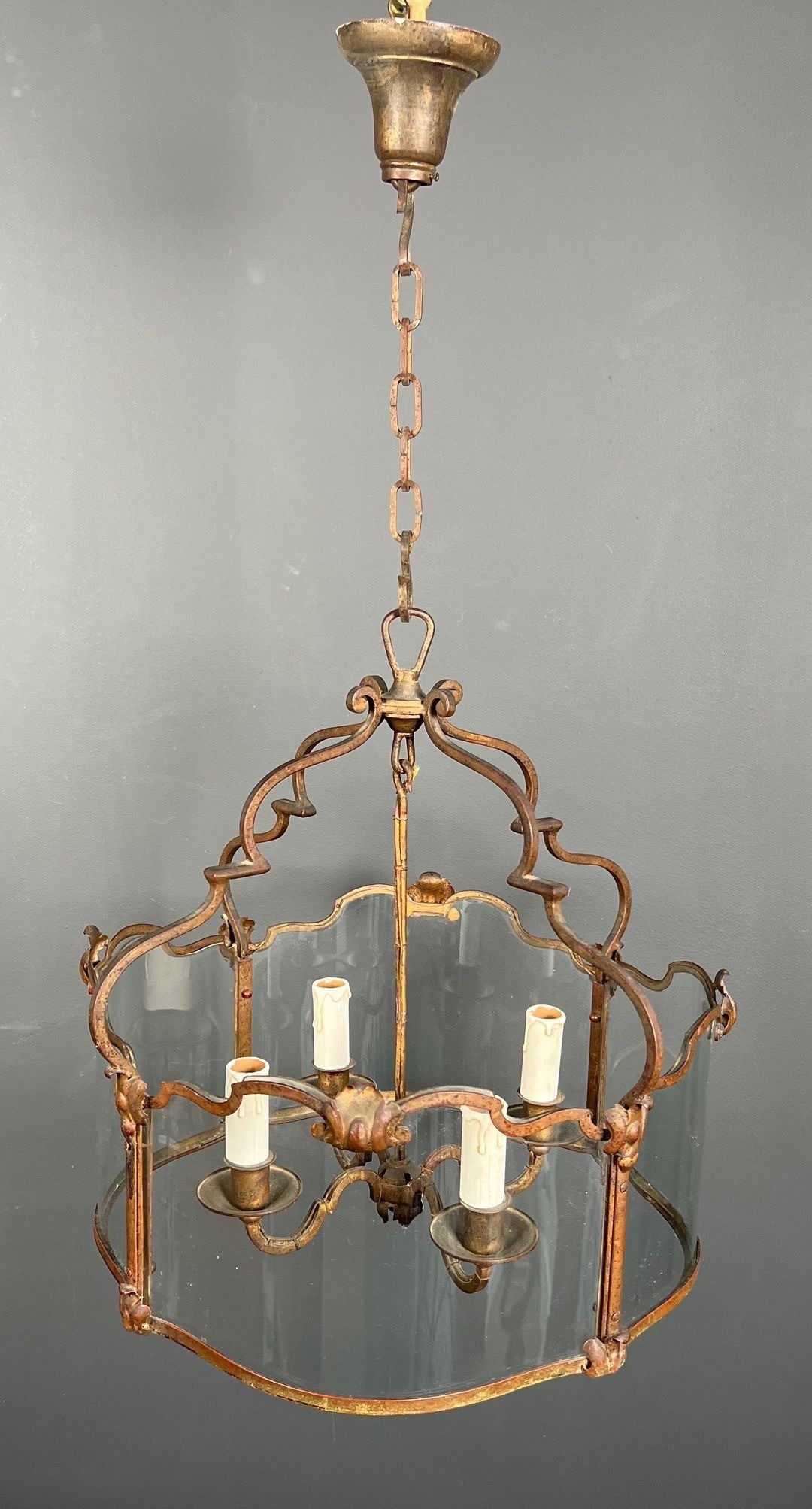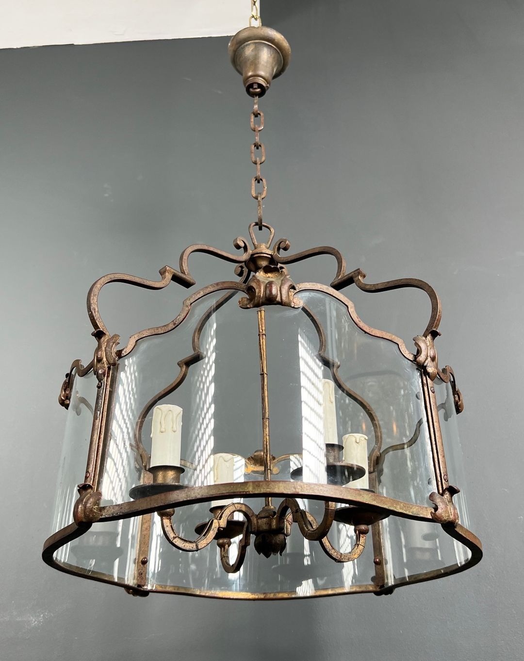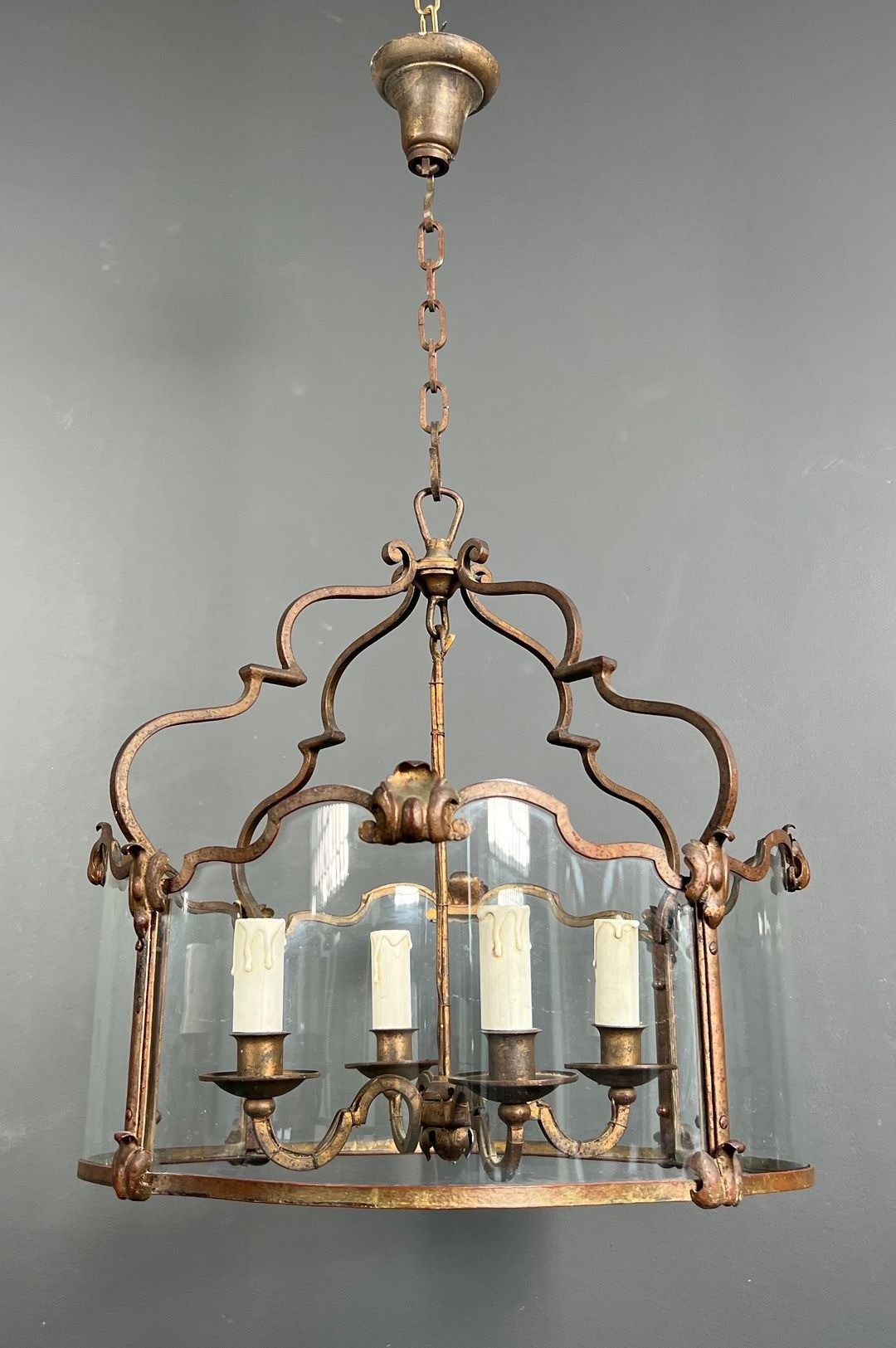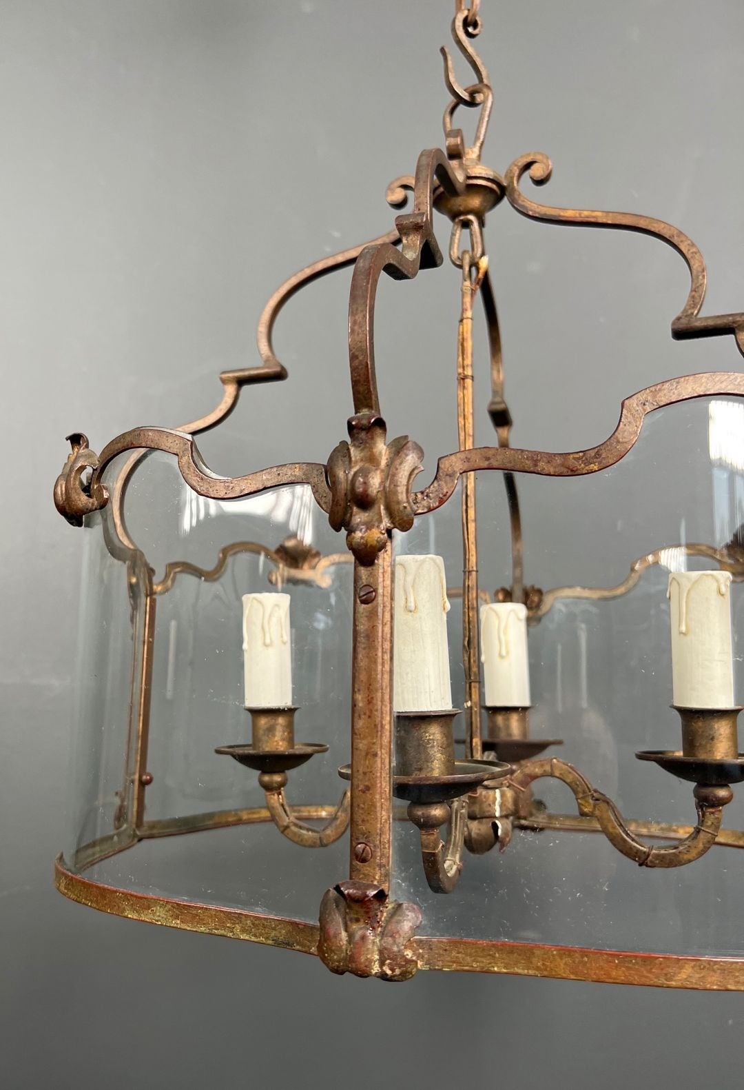The four lights — set within the generous body of the lantern (forty-seven centimetres across, eighty-six centimetres in height) — are enclosed behind curved glass panels. Curved glass is a technically demanding material: unlike flat glass, it must be shaped under heat in a specialised process, and the consistent curvature across multiple panels of matching dimensions is a test of the glassmaker’s skill. In a lantern of this age and size, the survival of the curved glass panels in original condition is itself a point of distinction. Together, the four light sources animate the interior of the lantern with a warmth and depth that simpler constructions cannot achieve.