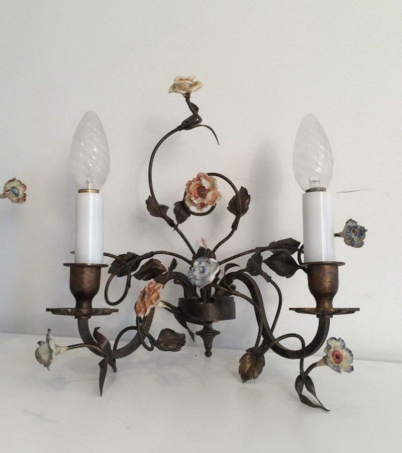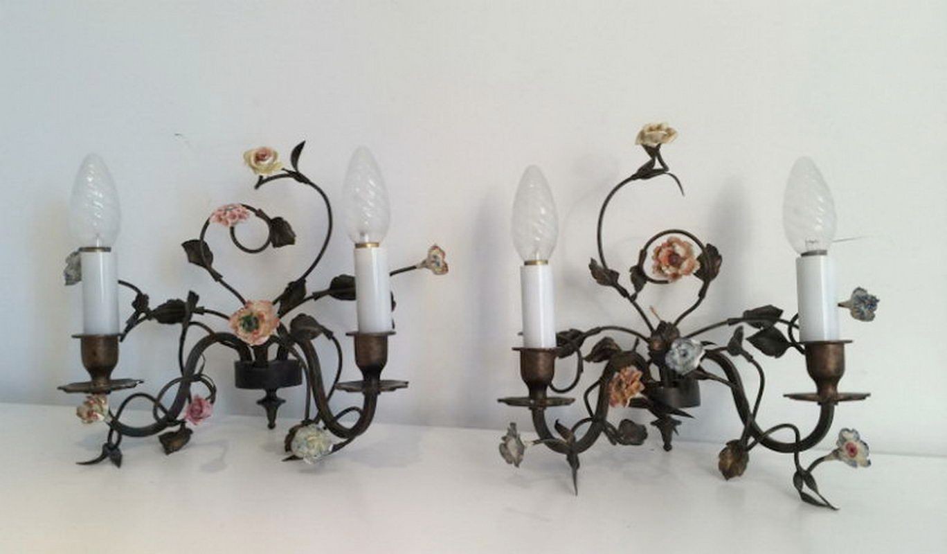 Beautiful pair of bronze wall sconces with porcelain flowers, French work from the 1920s.