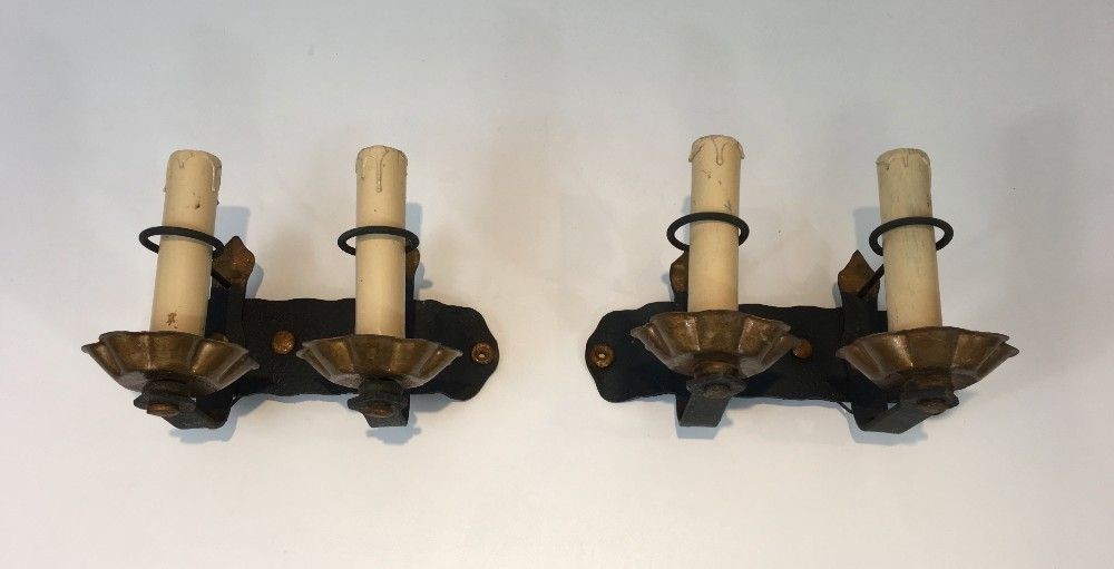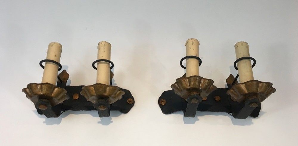 Elegant pair of wrought iron wall sconces, French work from the 1940s.