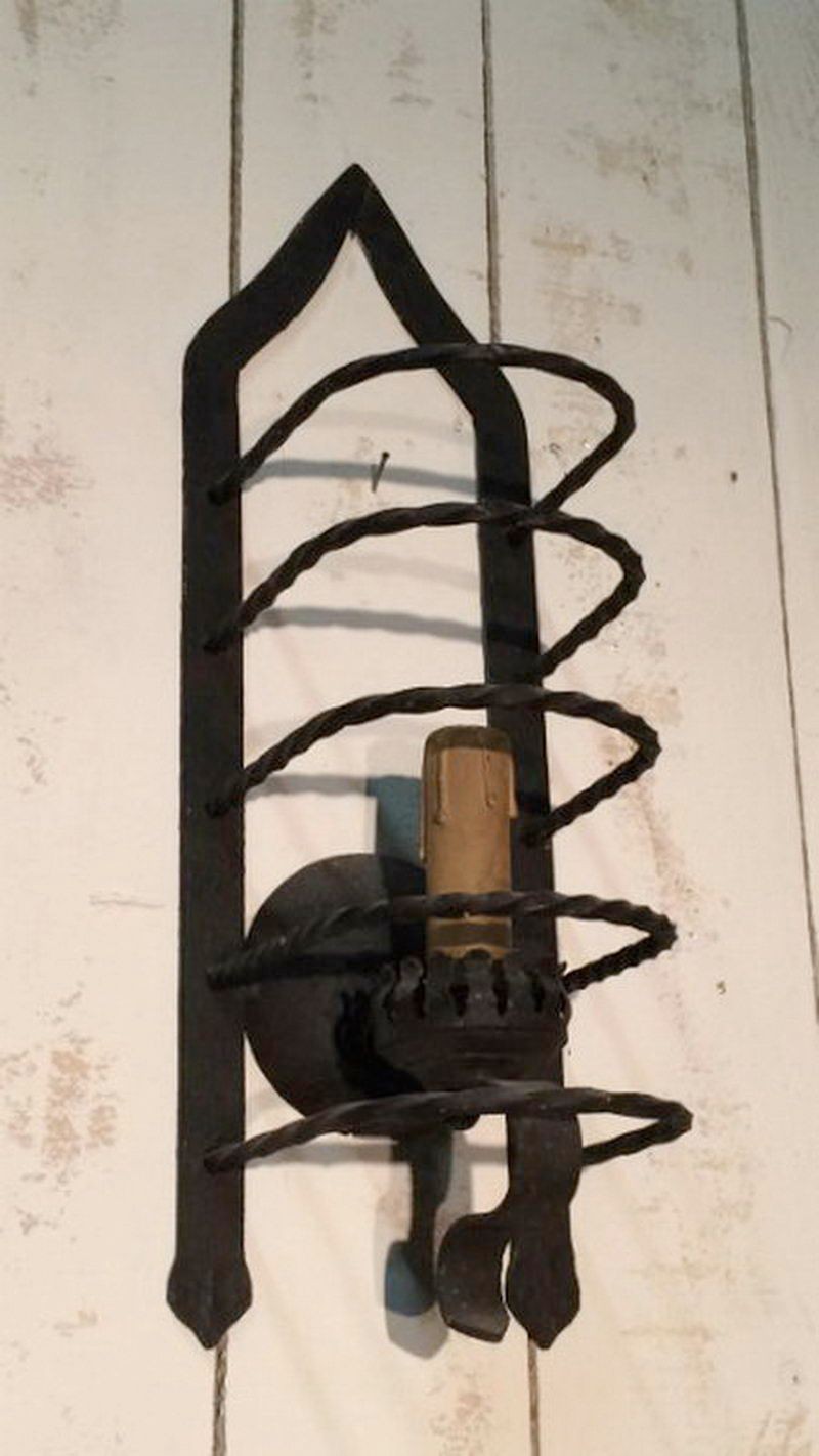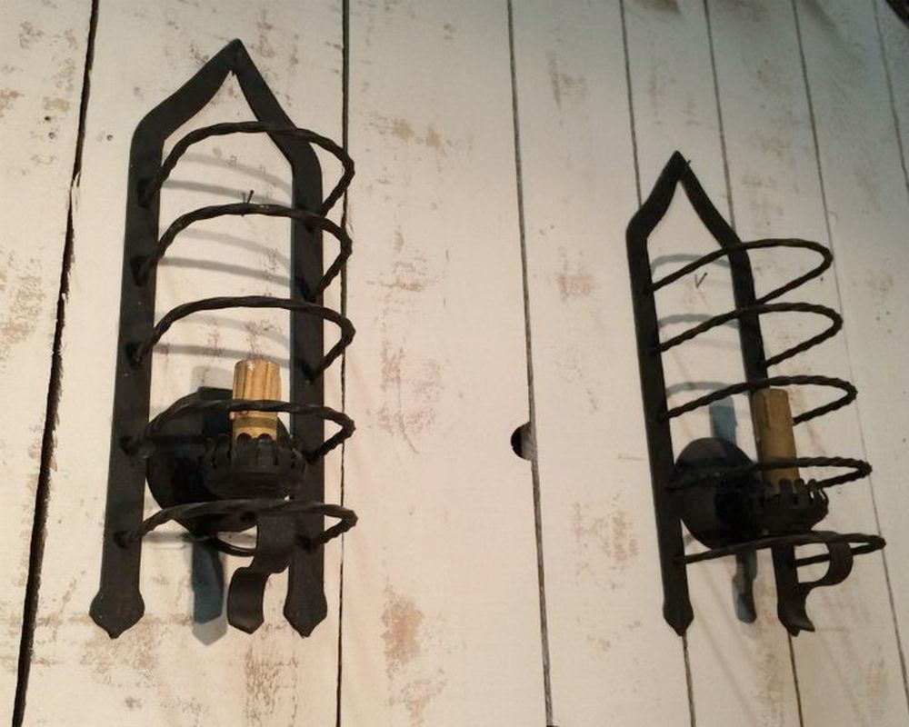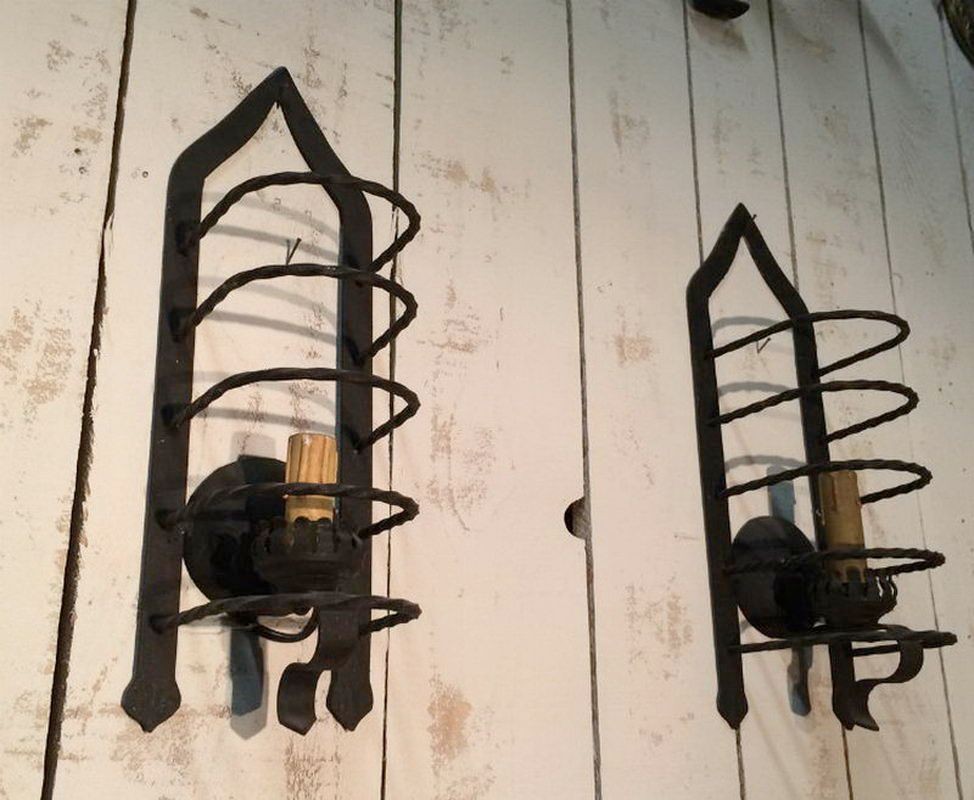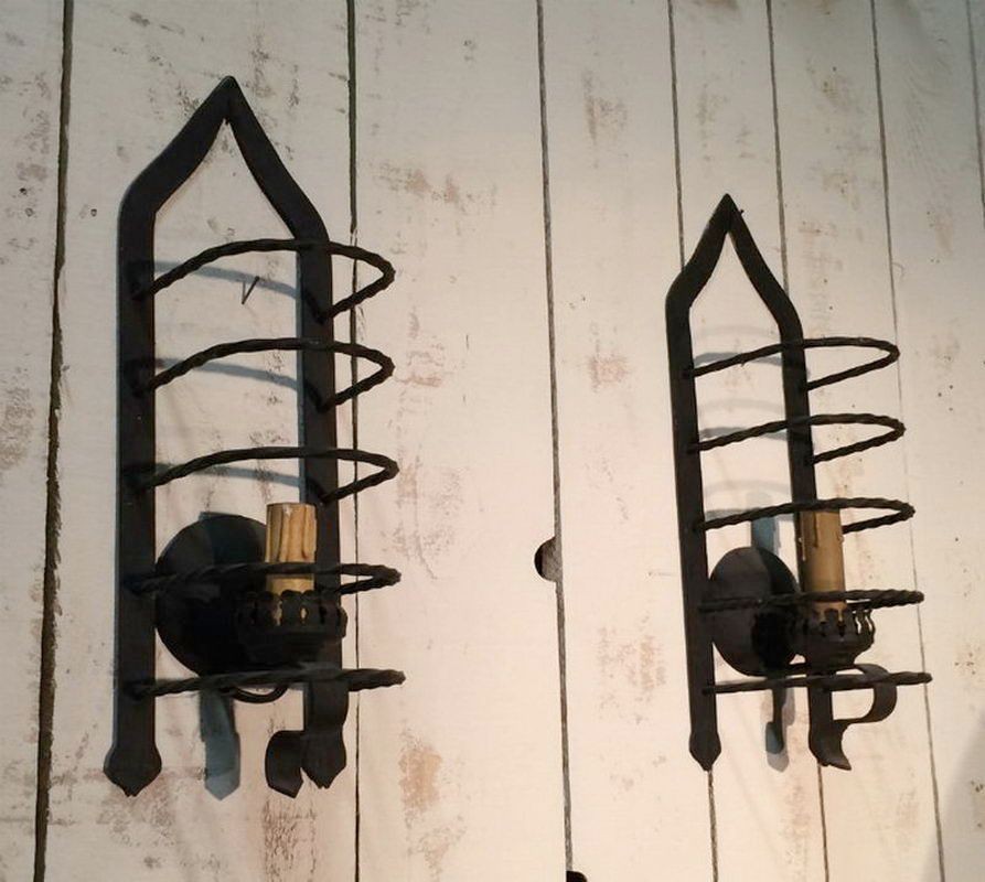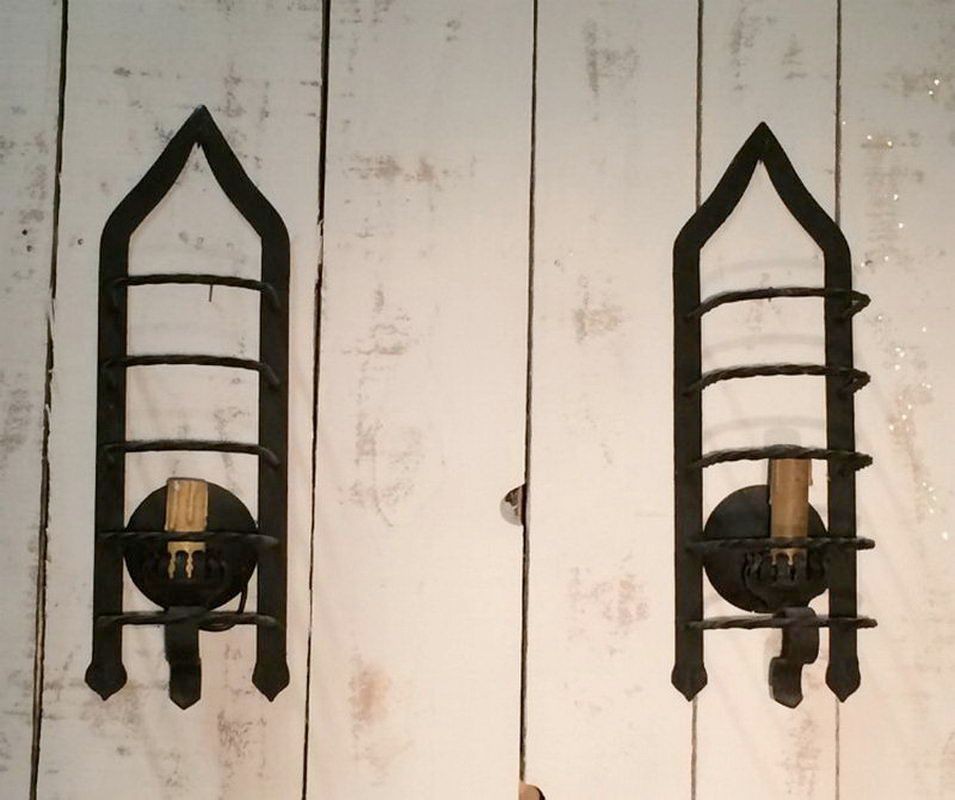This pair of cage sconces illustrates the formal inventiveness of French ironworkers in the 1950s, a period when wrought iron experienced a major revival in art lighting. The openwork cubic structure — hence the name "cage" — plays on transparency and the graphic design of the bars, creating a shadow effect on the wall when lit. The iron patina, dark with some warm hues, testifies to authentic hot work. These sconces are part of the post-war French School lineage that revisited classicism with a more refined and geometric vocabulary. Ideal for a mid-century interior, contemporary loft, or eclectic decor combining modernism and craftsmanship.