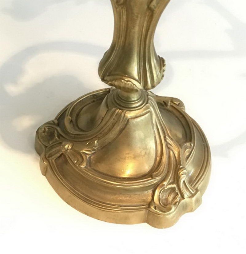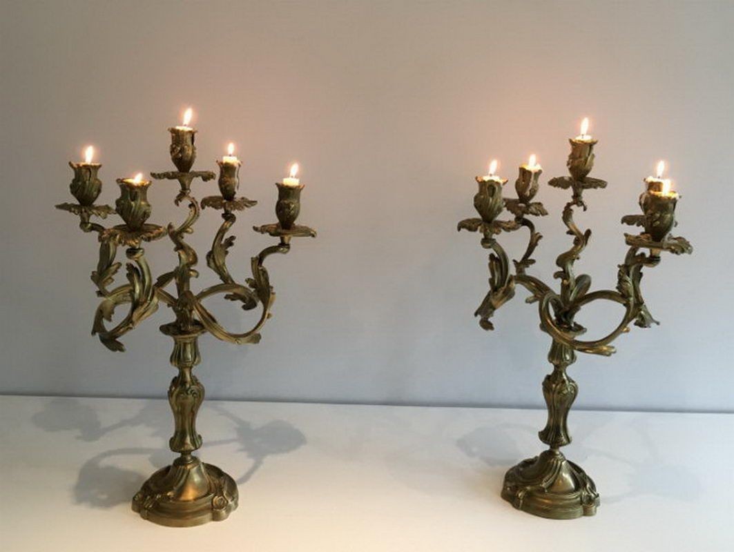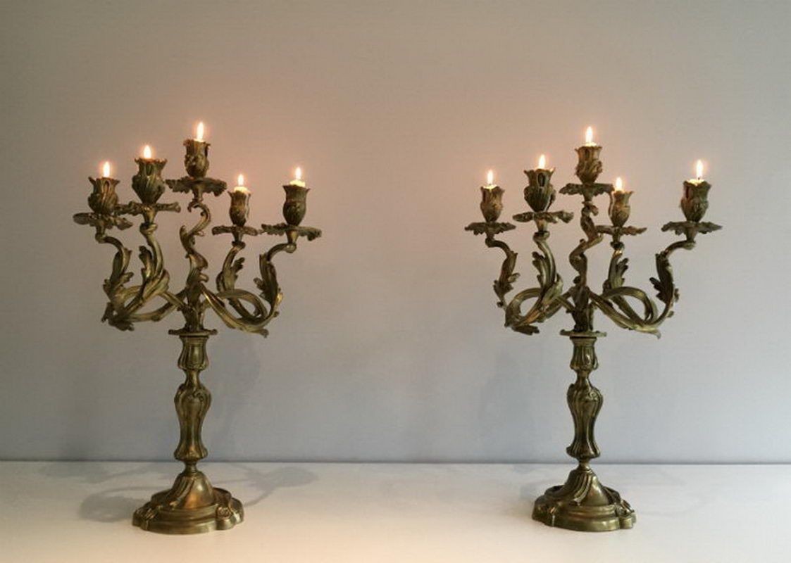 This pair of bronze candelabras with five light arms is part of the neoclassical decorative sculpture tradition of the turn of the 20th century. The massive patinated bronze structure features a flared base, a richly ornate central shaft, and five curved arms radiating in a crown around a central bobèche. The applied motifs — acanthus leaves, palmettes, beads — reflect the taste for classical ornamentation typical of the late Belle Époque. The dark patina of the bronze, enhanced by a few golden highlights on the edges, gives the pieces all their depth. As a pair, they form a harmonious and symmetrical ensemble, ideal for furnishing the console of an entrance, the mantle of a fireplace, or a dining room sideboard.