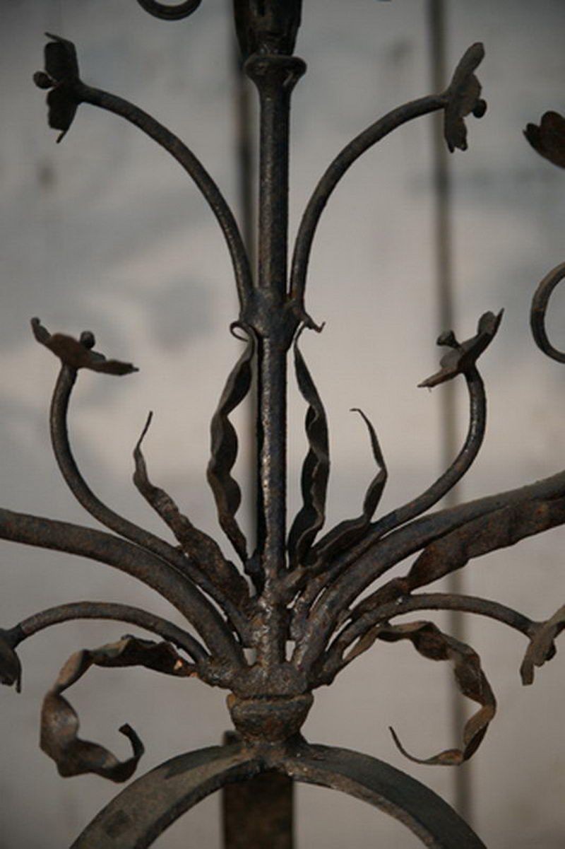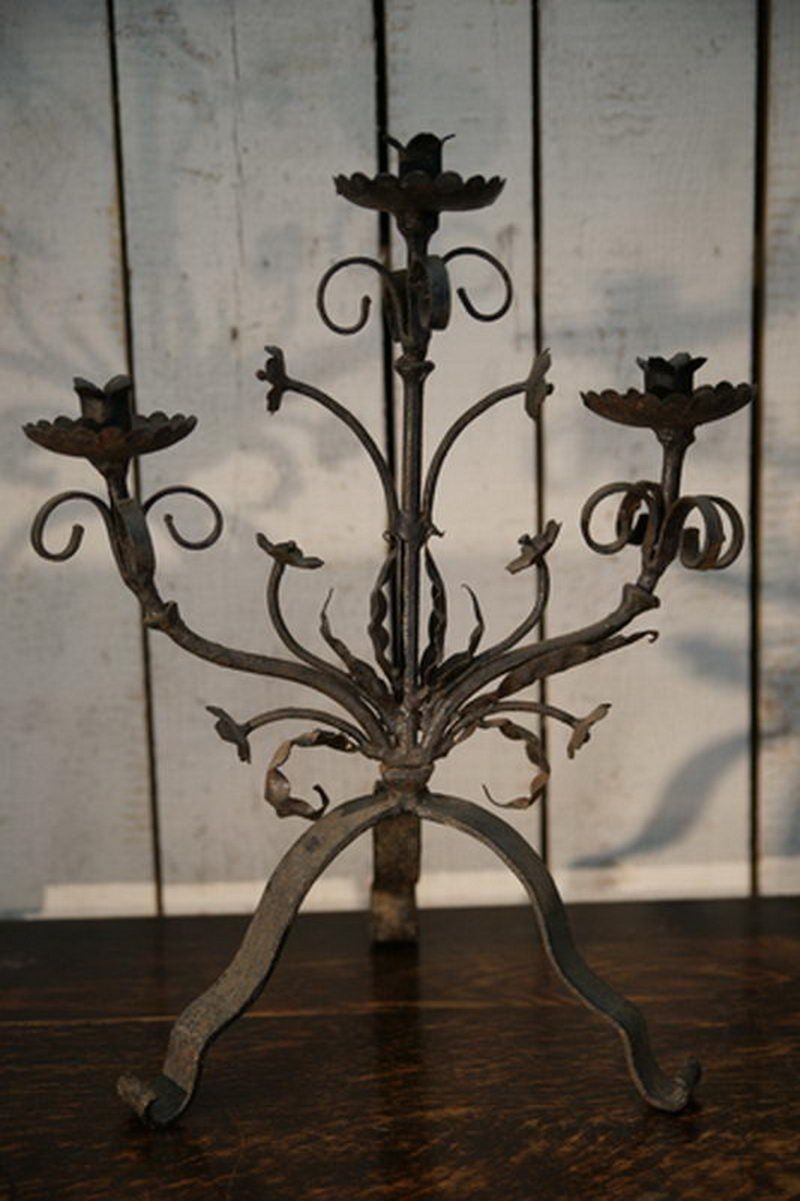 This wrought iron candle holder represents a perfect example of French art ironwork from the early 20th century. The structure, entirely handcrafted, exhibits the typical features of traditional work: twists, scrolls and fluid lines achieved through hot hammering. The iron's patina, rich with natural oxidation, gives the piece an authentic and warm appearance. Its solid and stable design makes it a functional decorative object, ideal for adding a touch of rustic authenticity to a contemporary or classic interior.