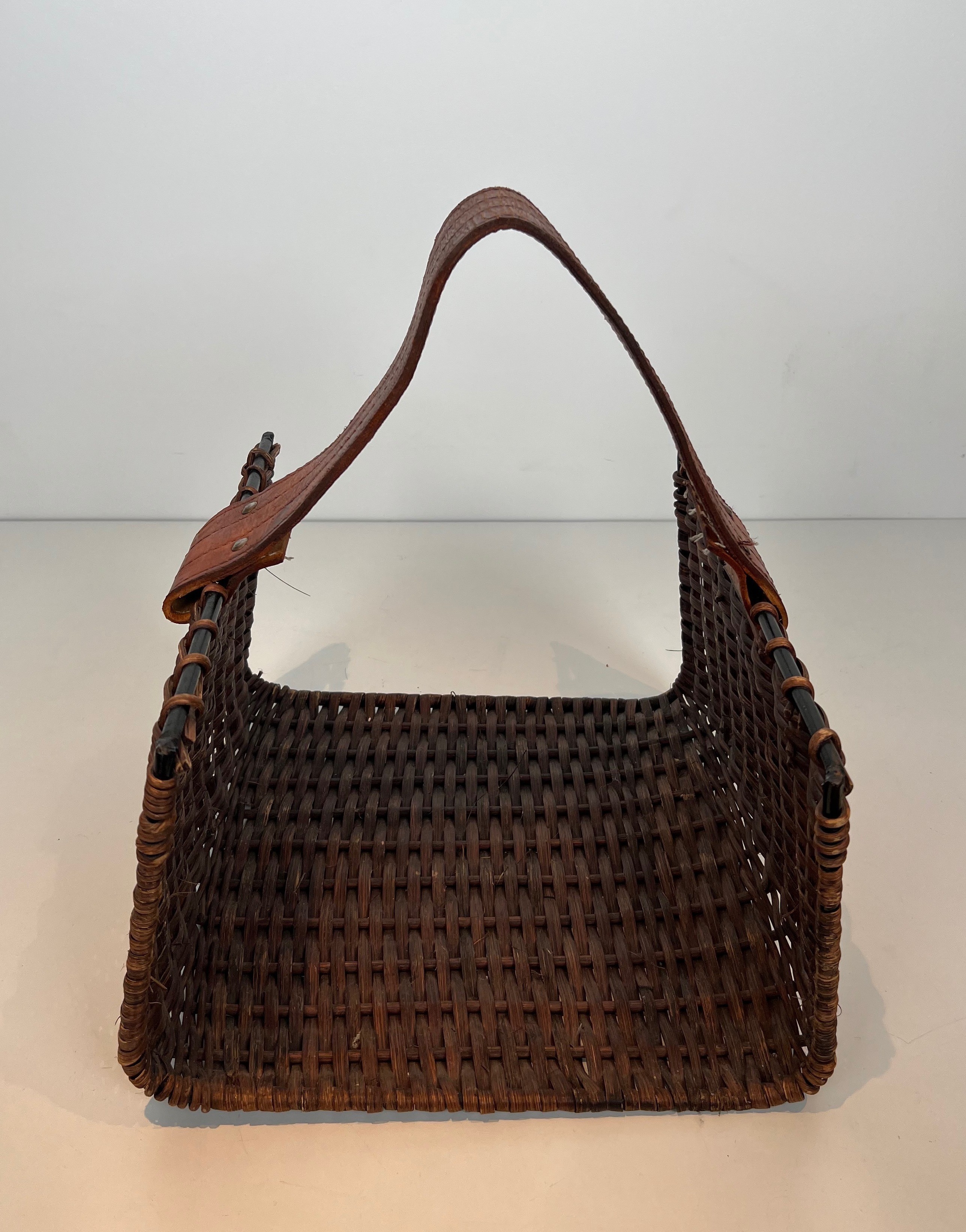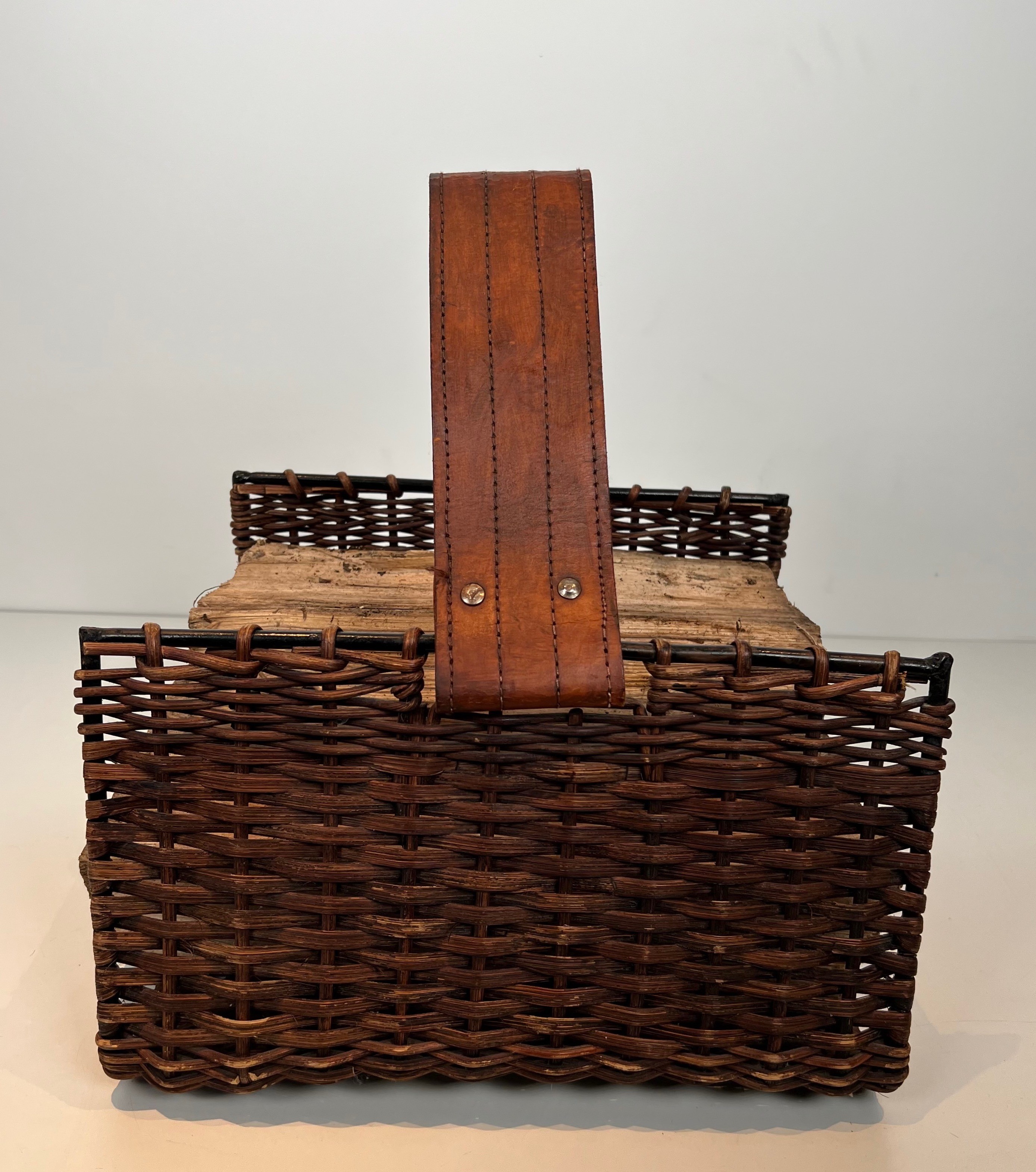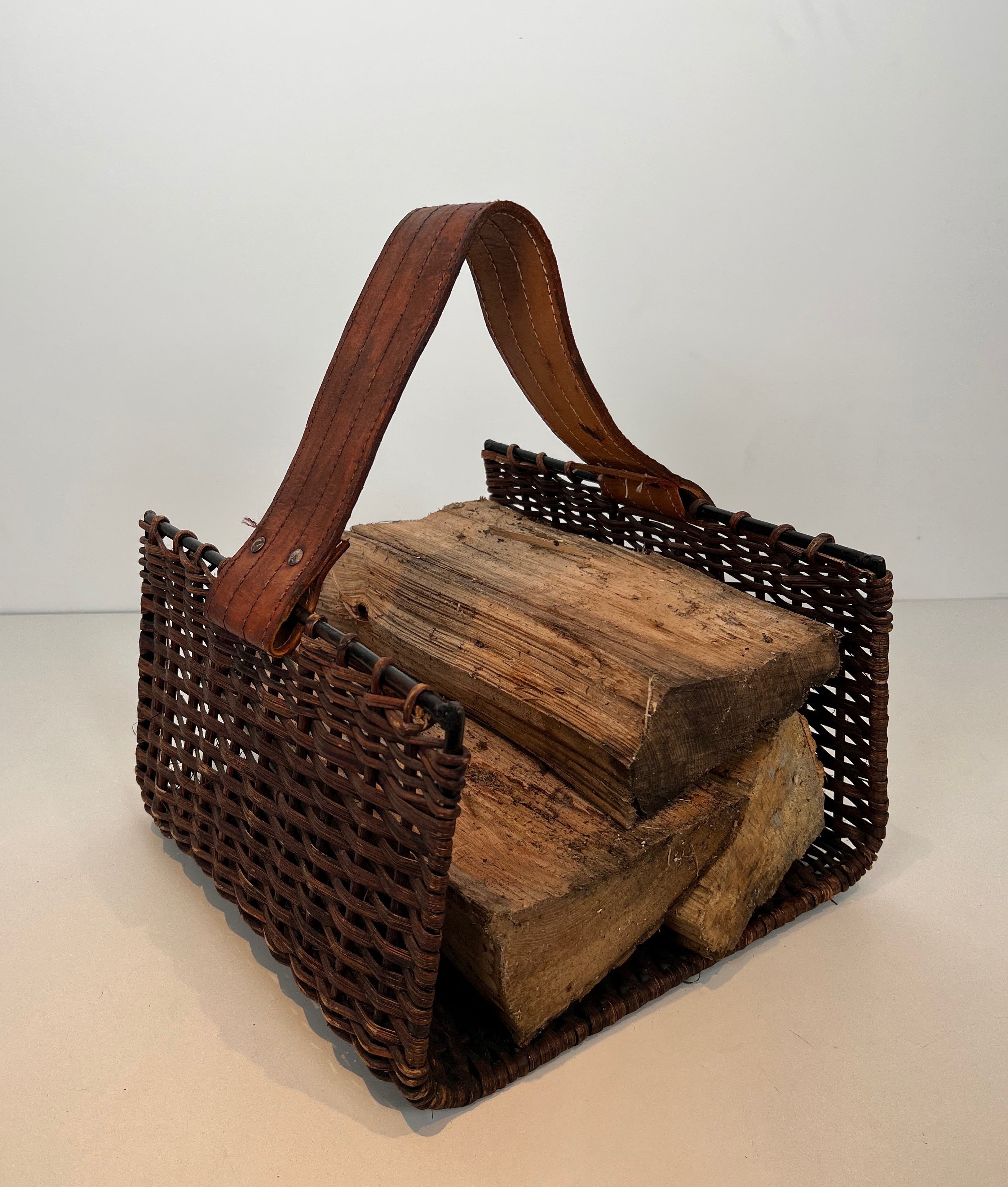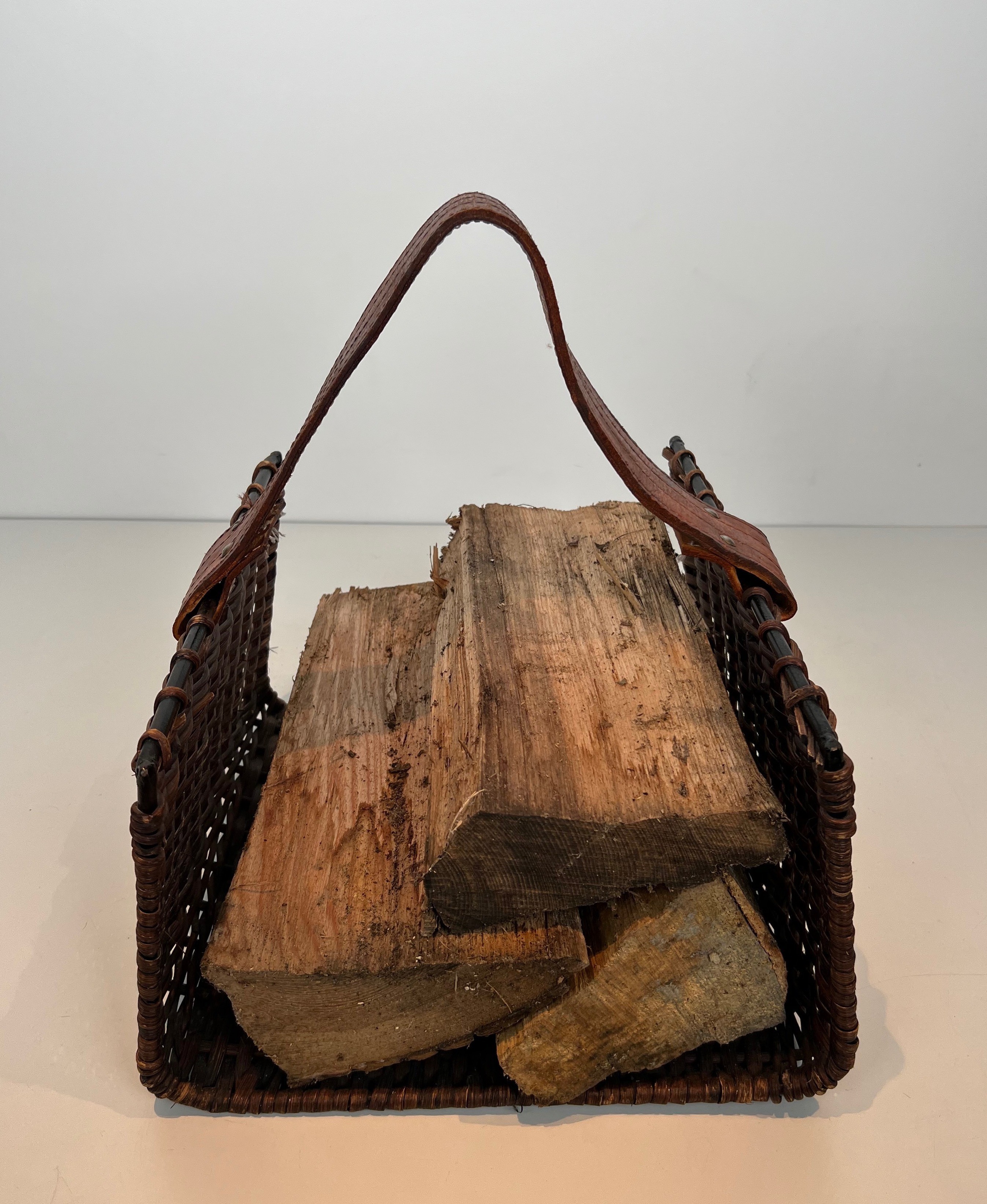 Rattan, black lacquered metal and leather log holder. French. Circa 1970