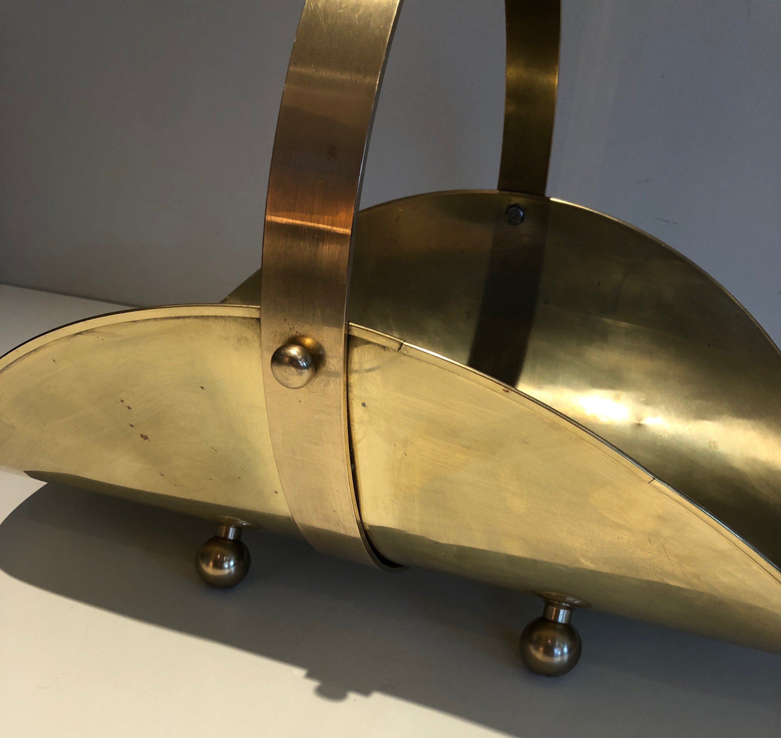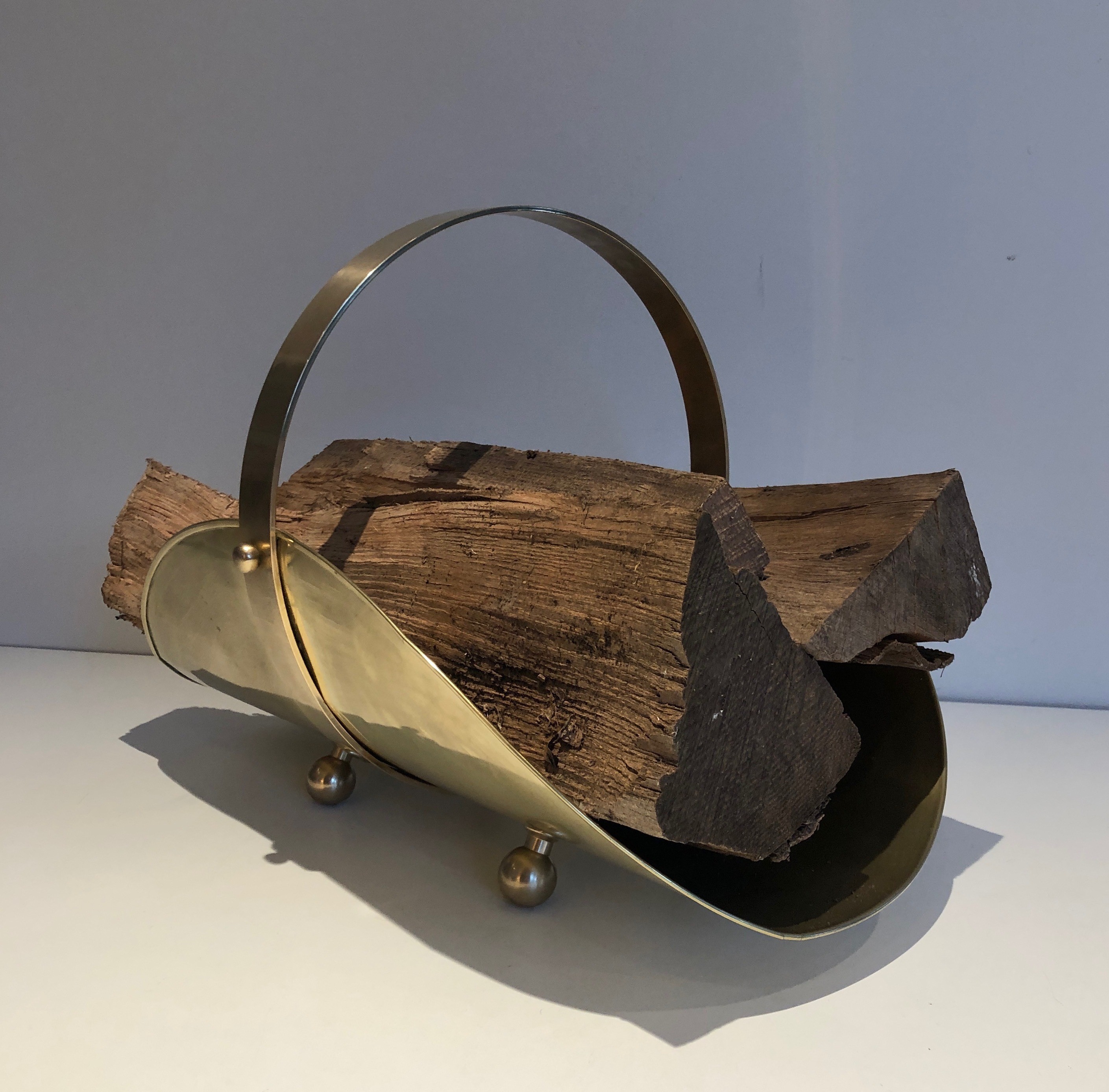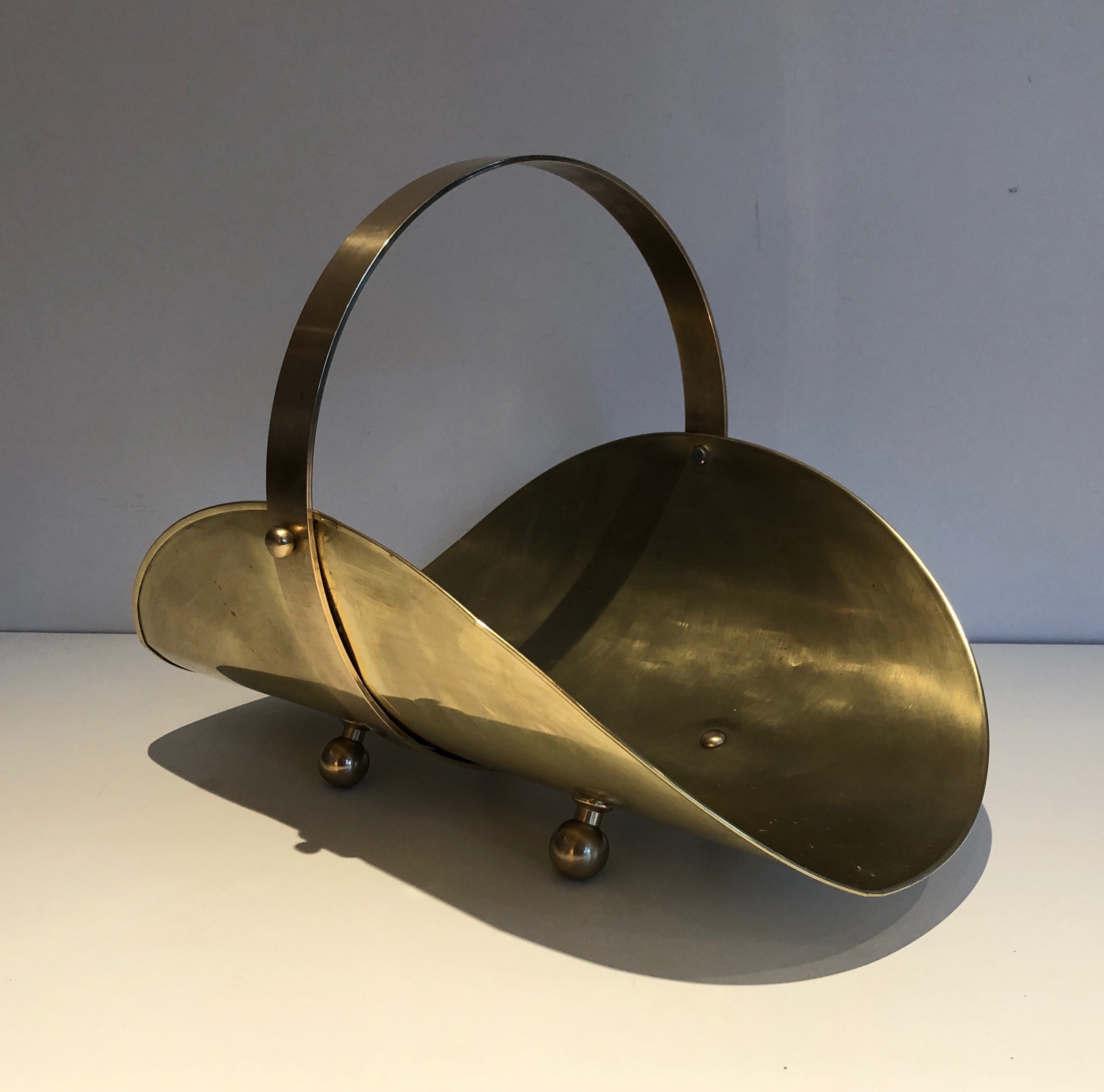 This elegant brass log holder in the neoclassical manner stands on characteristic ball feet, its polished structure displaying the clean lines and precise proportions of the French classical metalwork tradition. Designed to hold logs beside the fireplace, it combines practical function with a refined decorative presence, the warm golden tone of the polished brass providing a natural complement to the colours of the hearth. The ball feet, a recurring motif in the neoclassical vocabulary from the Empire period onwards, lend the piece both stability and a characteristic elegance.