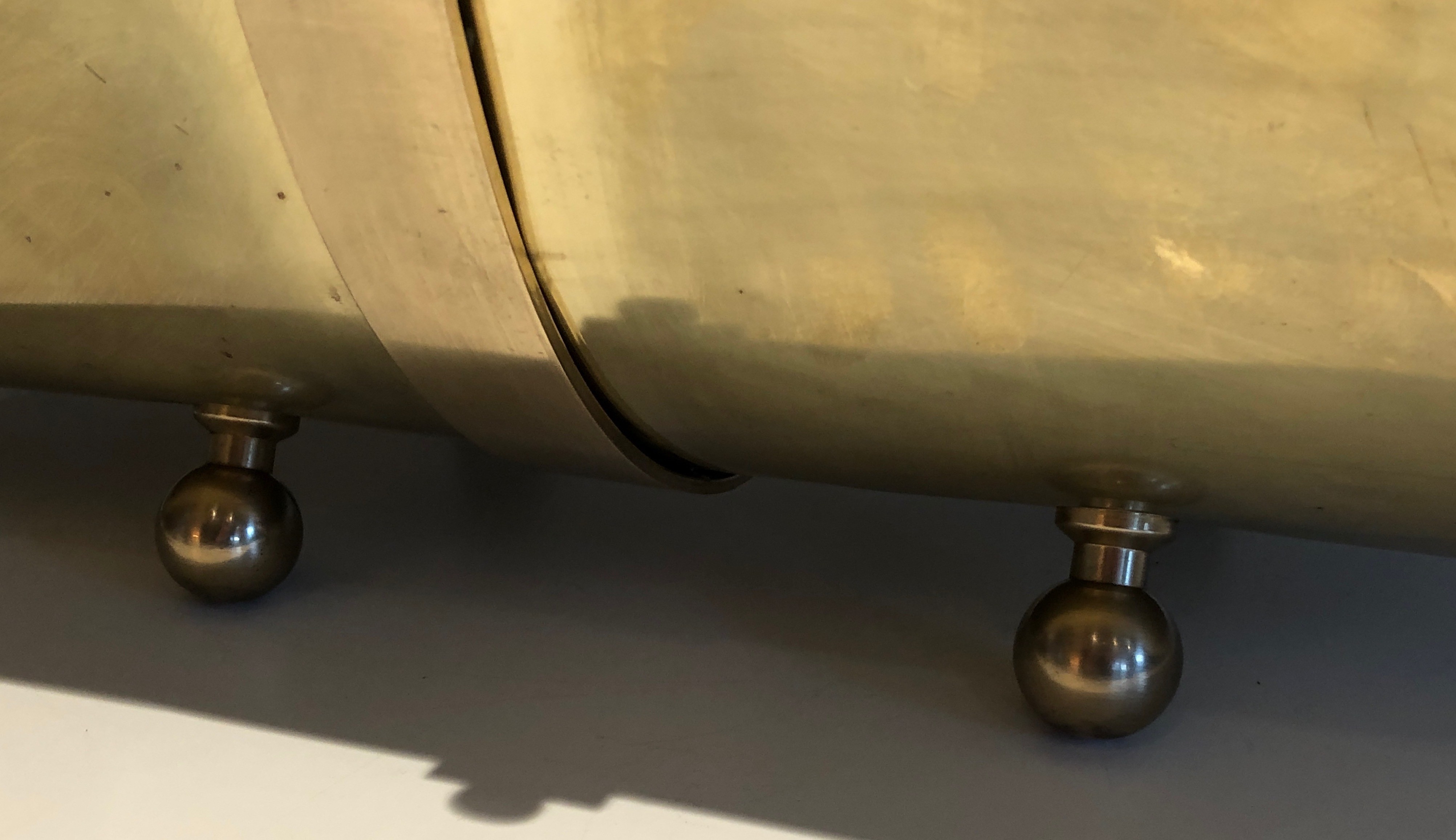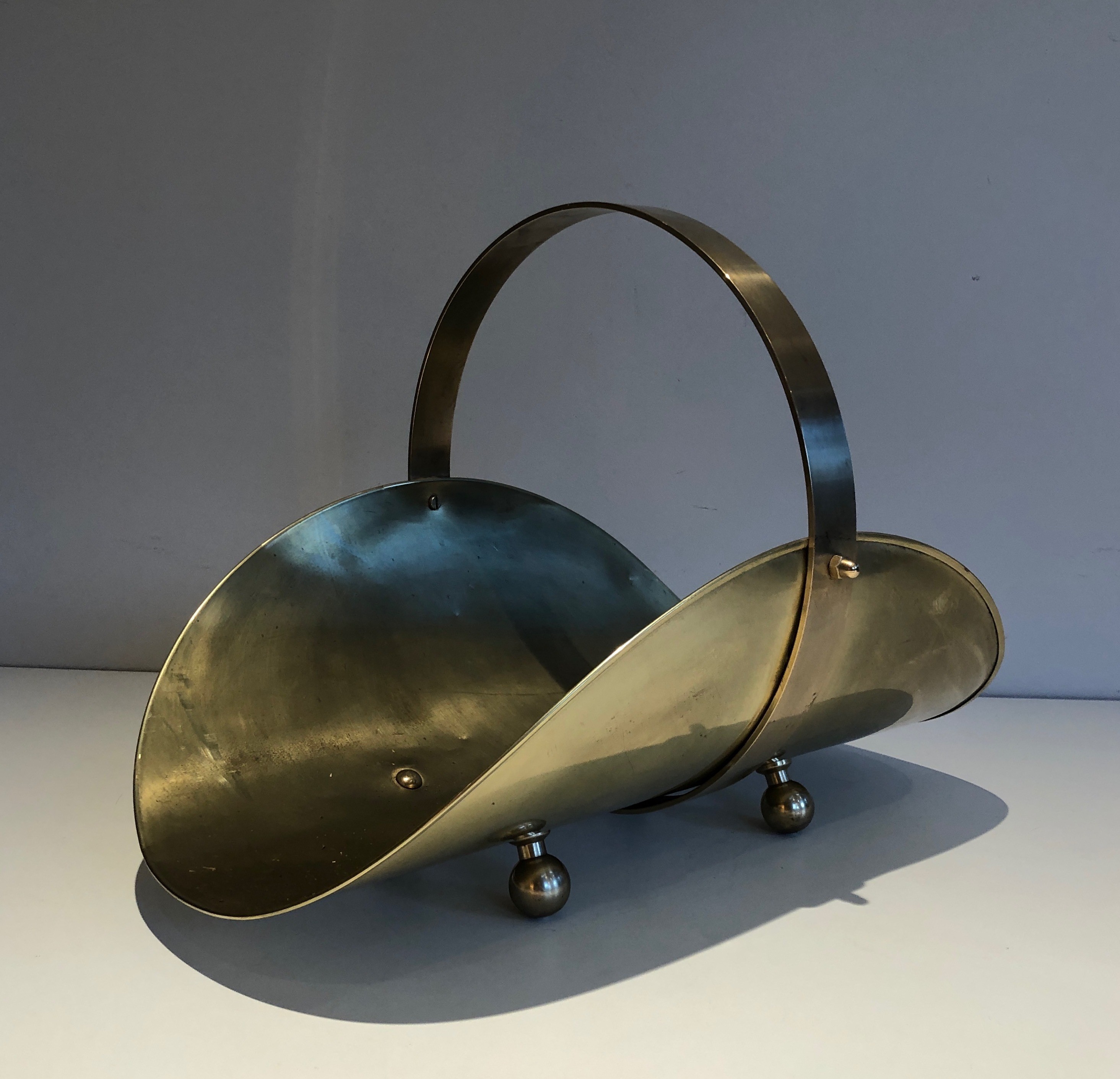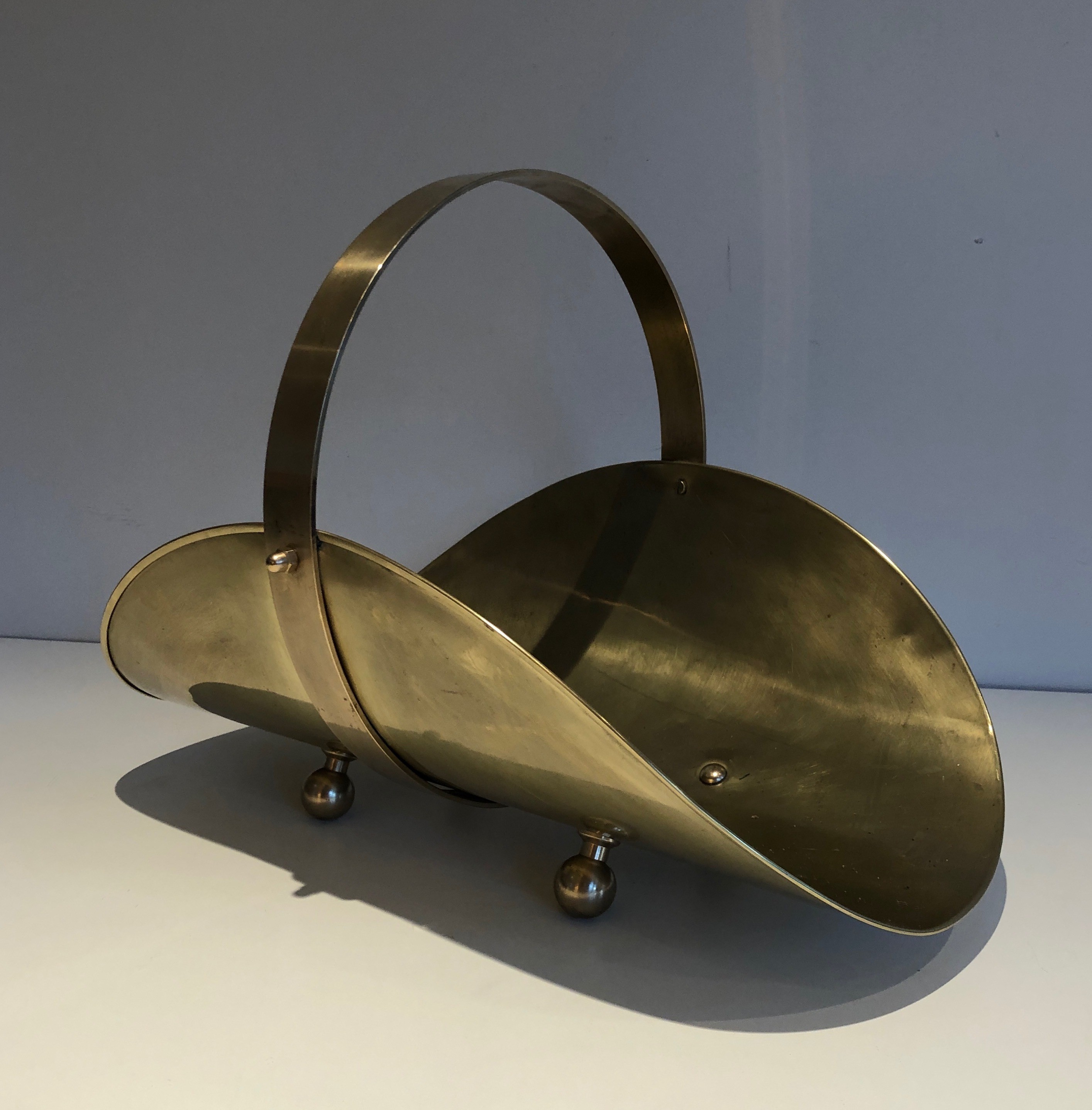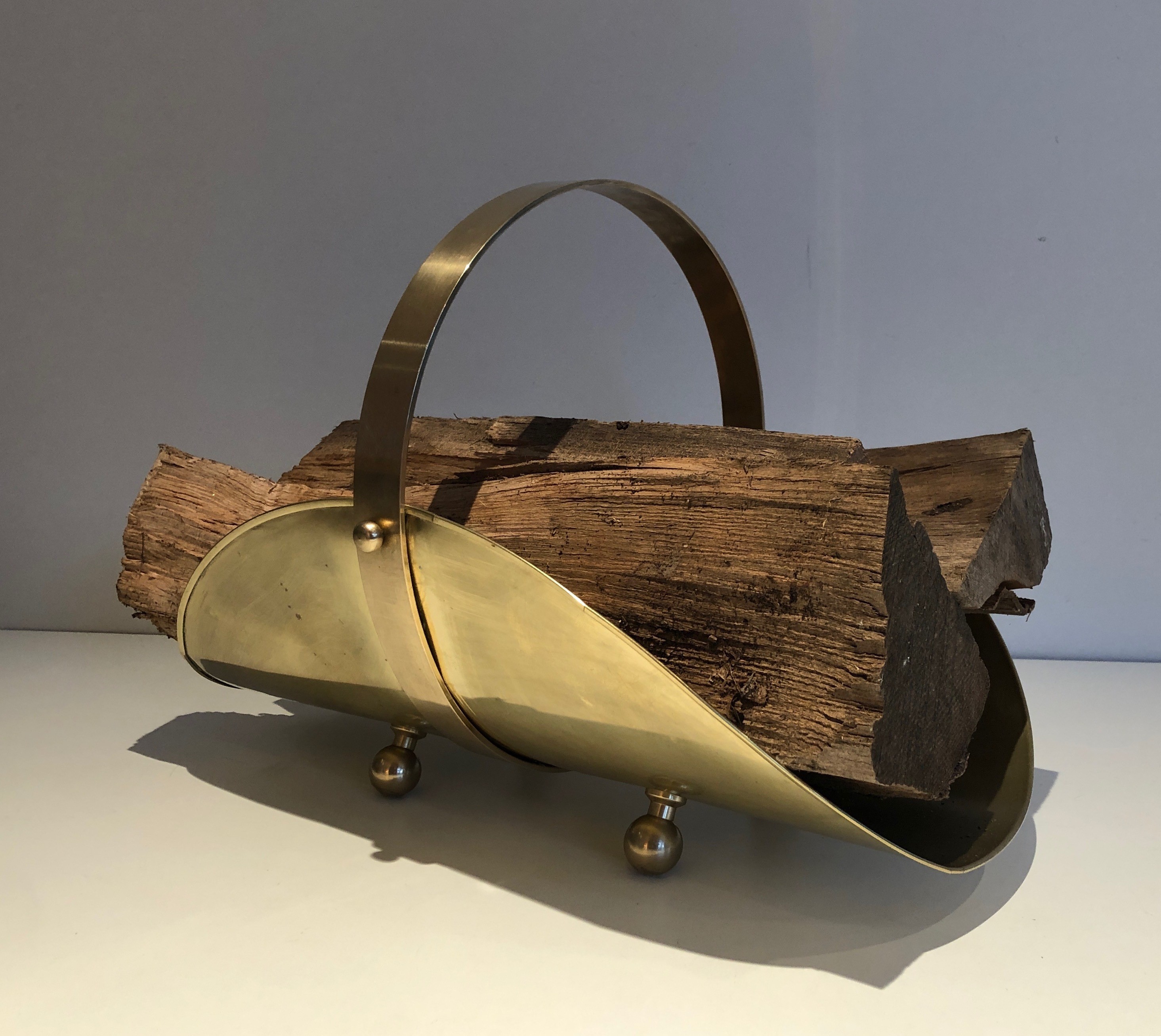 This elegant brass log holder in the neoclassical manner stands on characteristic ball feet, its polished structure displaying the clean lines and precise proportions of the French classical metalwork tradition. Designed to hold logs beside the fireplace, it combines practical function with a refined decorative presence, the warm golden tone of the polished brass providing a natural complement to the colours of the hearth. The ball feet, a recurring motif in the neoclassical vocabulary from the Empire period onwards, lend the piece both stability and a characteristic elegance.
