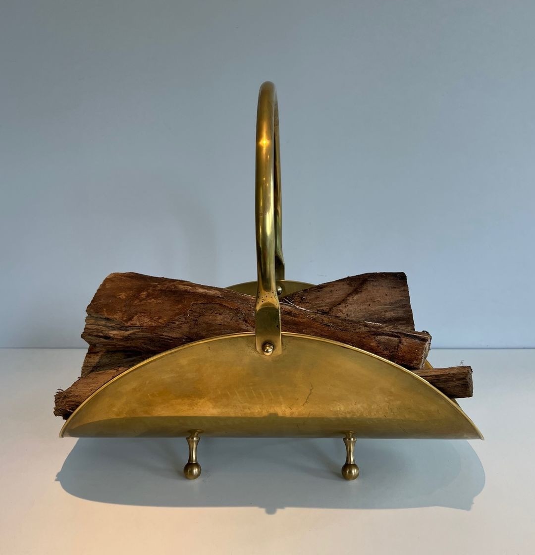 Modernist Polished Brass Log Basket with Semicircular Arch Handle and Ball Feet, French circa 1970