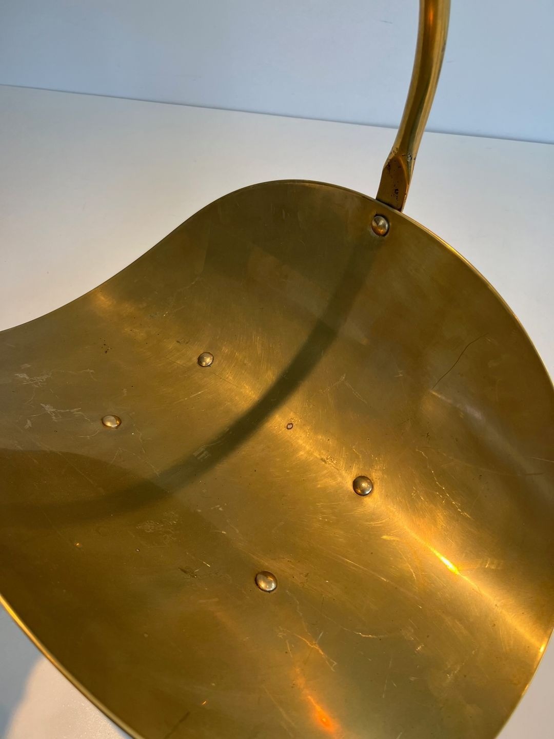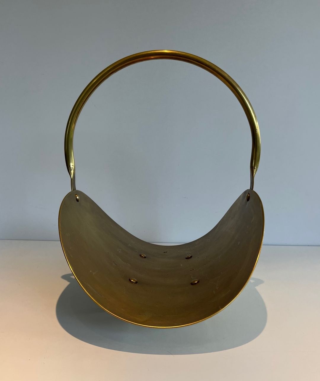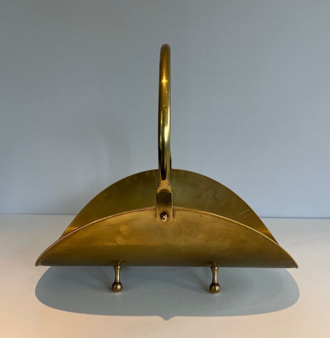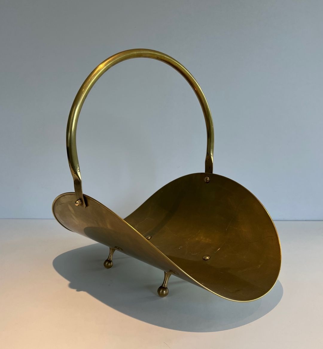 The choice of polished brass as the sole material is characteristic of the period’s preference for the warm monochromatic luxury of a single noble metal over the painted or mixed-material approaches of earlier traditions. The ball feet, a discreet nod to the neoclassical vocabulary, root the piece lightly in the language of French decorative arts without departing from its fundamentally modernist character. The arch handle, perfectly proportioned, allows the basket to be carried easily when full without disrupting the visual balance of the composition.