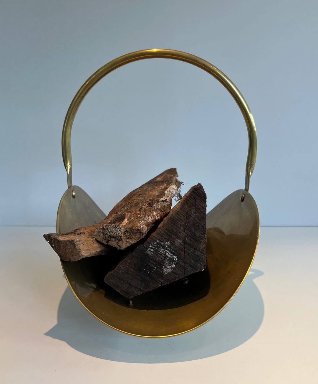 The log basket or porte-bûches is one of the less celebrated but most practically important of fireplace accessories, present in any household where wood fires are regularly laid. In quality French and Italian production of the 1960s and 1970s, the form was often resolved with considerable elegance, designers applying the same vocabulary of clean geometry and quality materials they brought to furniture and lighting. This example exemplifies that approach: rather than a rustic wrought-iron basket or an elaborate historicist stand, it offers a form reduced to its essentials—curve, arch, and sphere—in a material that elevates the utilitarian to the decorative.