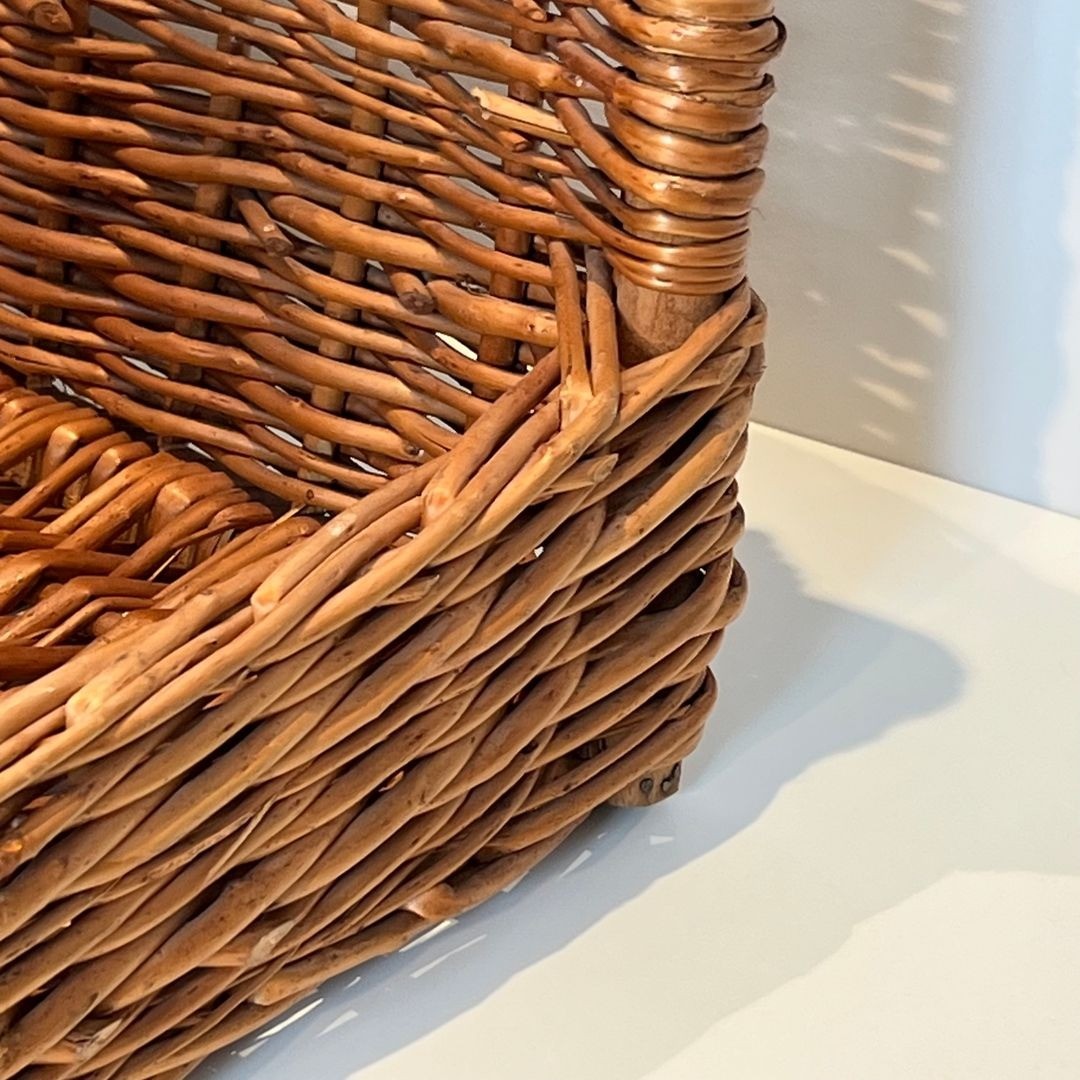 The weave is closely worked and even, the rattan chosen for regularity and strength. The tall arched handle rises above the basket’s open rim in a confident single arc, providing a firm grip for carrying logs and lending the piece its characteristic silhouette — the outline that makes a rattan log holder instantly recognizable and perennially satisfying as a form. At 57 cm wide and 46.5 cm deep, the interior volume is generous: capable of holding a substantial armful of logs for an evening’s fire.
