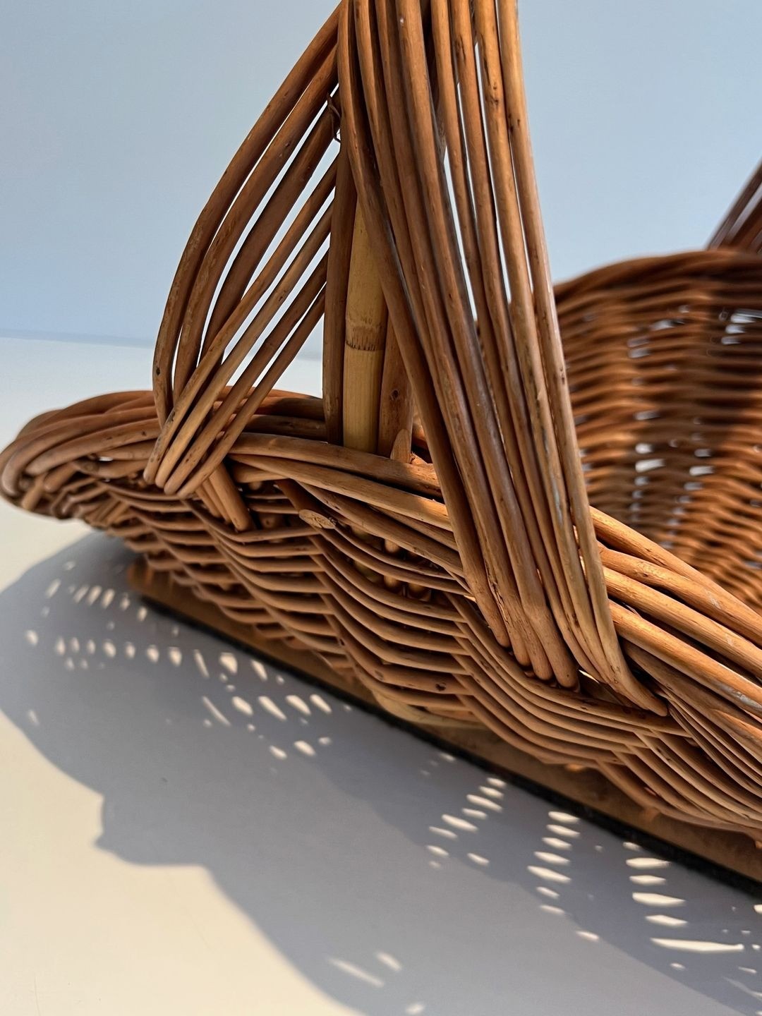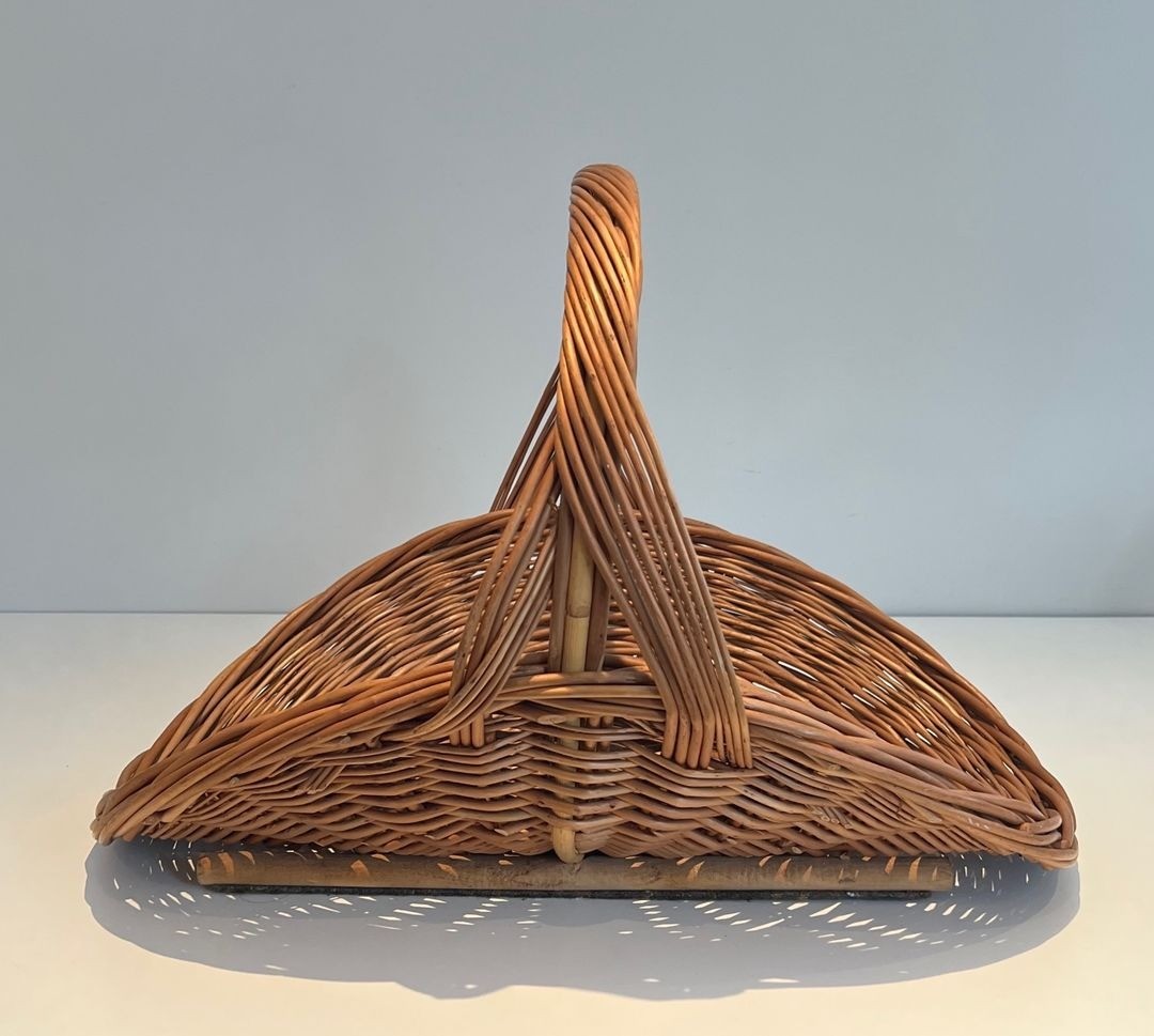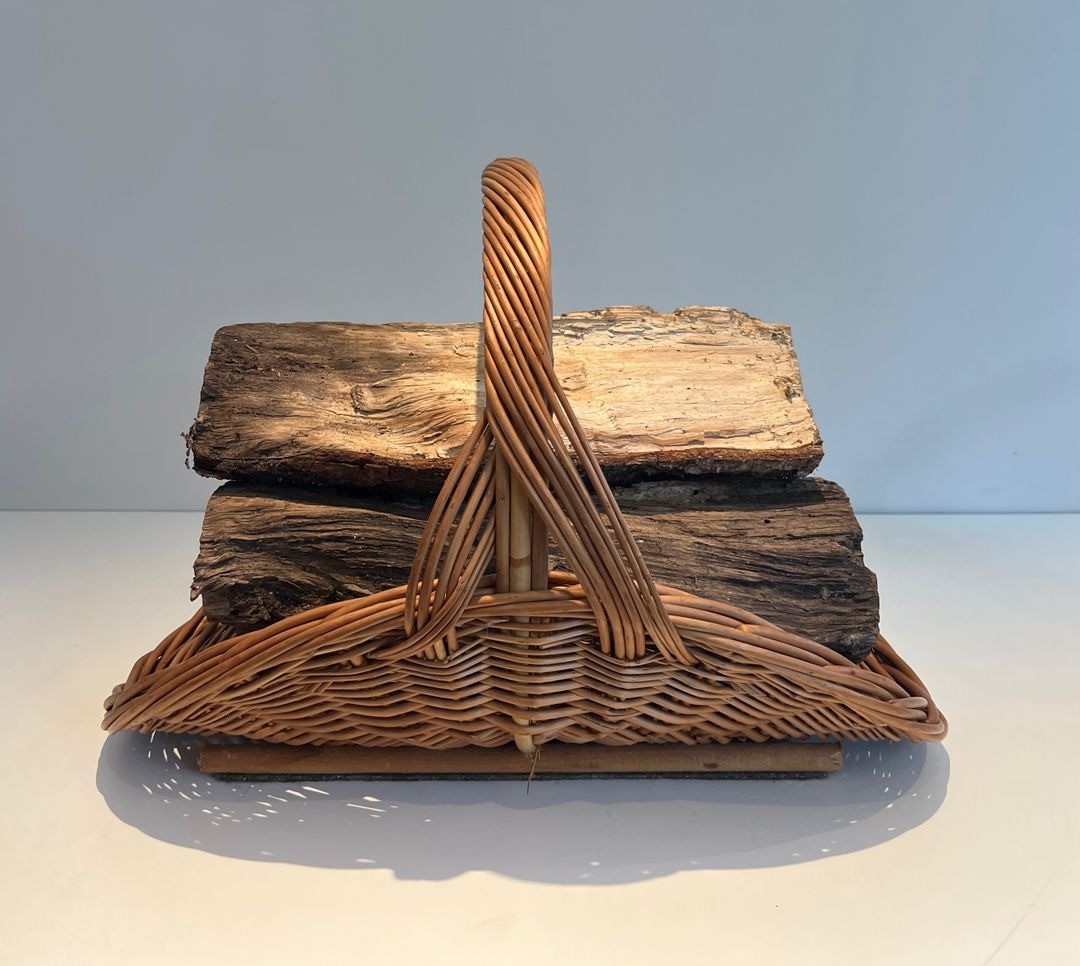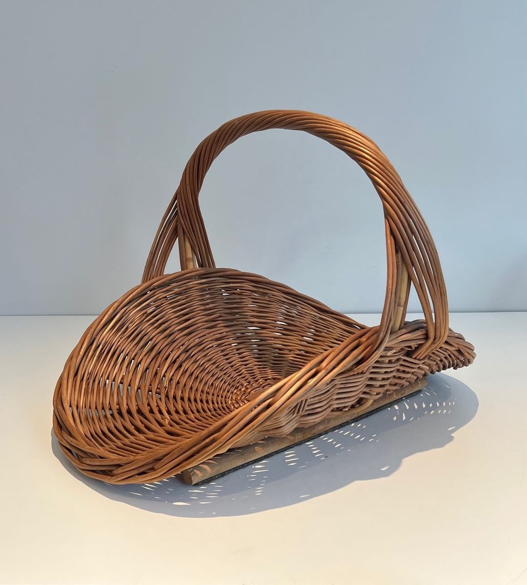 Rattan Wicker Log Basket of D-Shaped Form with Arched Carrying Handle. France. Circa 1970.