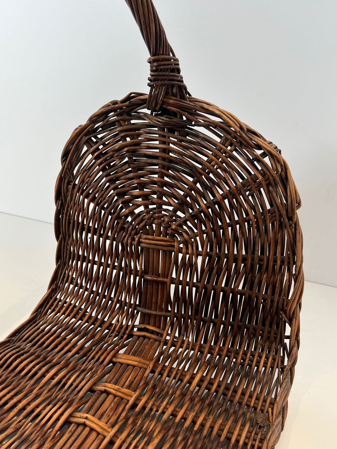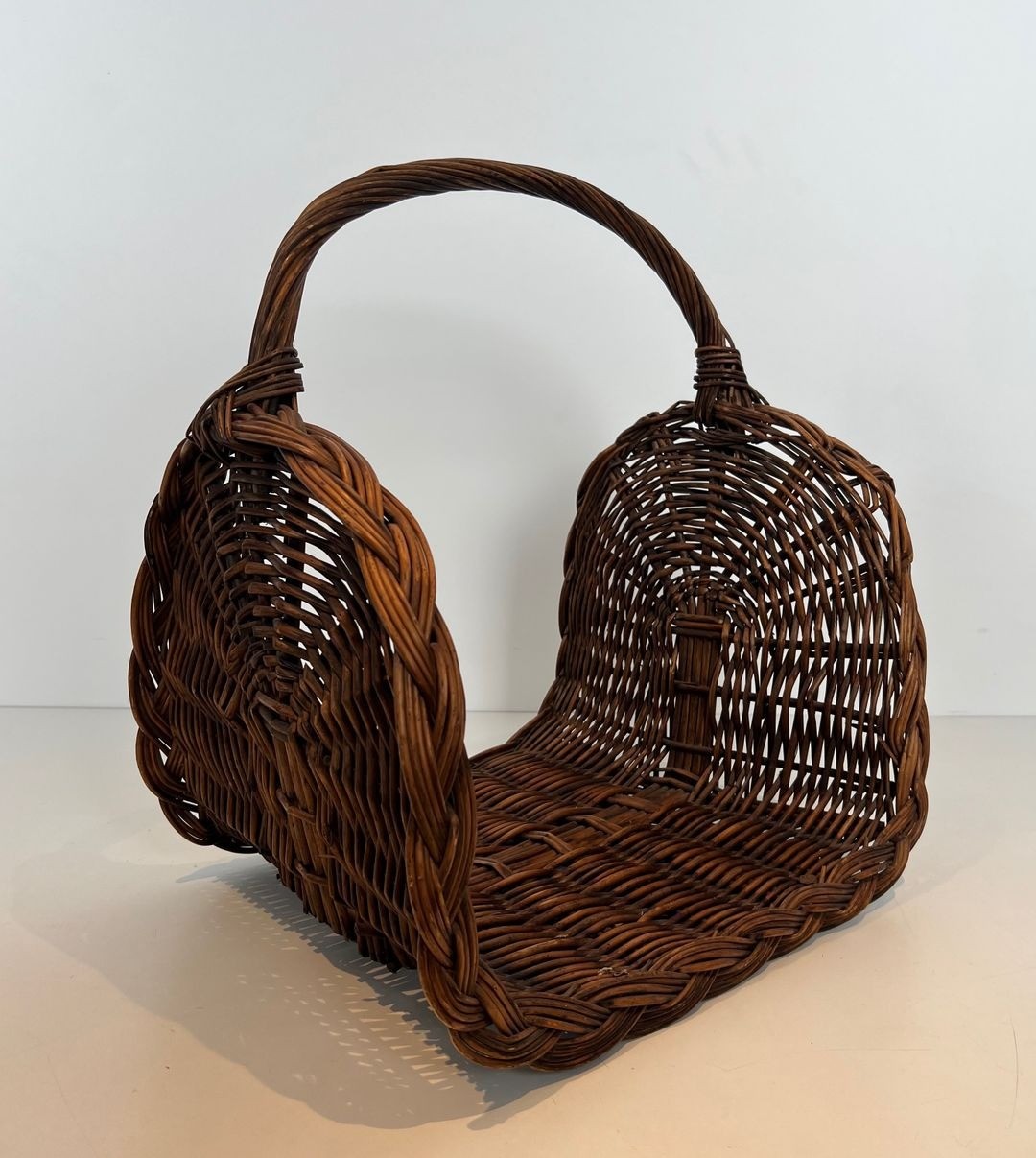 The form of the basket is simultaneously practical and sculptural. When placed beside a fireplace, whether laden with logs or empty, it reads as a composed object in its own right: the arching handle framing the space above the basket, the broad body providing a grounded counterweight below. This quality of considered design within a vernacular tradition is the hallmark of the best French craft production of the period.