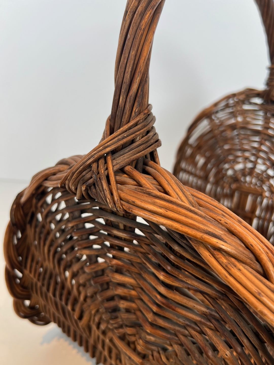 The weave itself is tight and accomplished, demonstrating the skill of a craftsman thoroughly versed in the traditions of French basketwork. The texture of the rattan — its natural irregularity, the variation in the colour of the individual stems, the subtle relief of the over-and-under pattern — creates a surface of considerable visual richness that catches and modulates the ambient light in a way that no manufactured material can replicate. Darkened through use and age to a warm espresso tone, the rattan has acquired the patina of a well-loved domestic object.