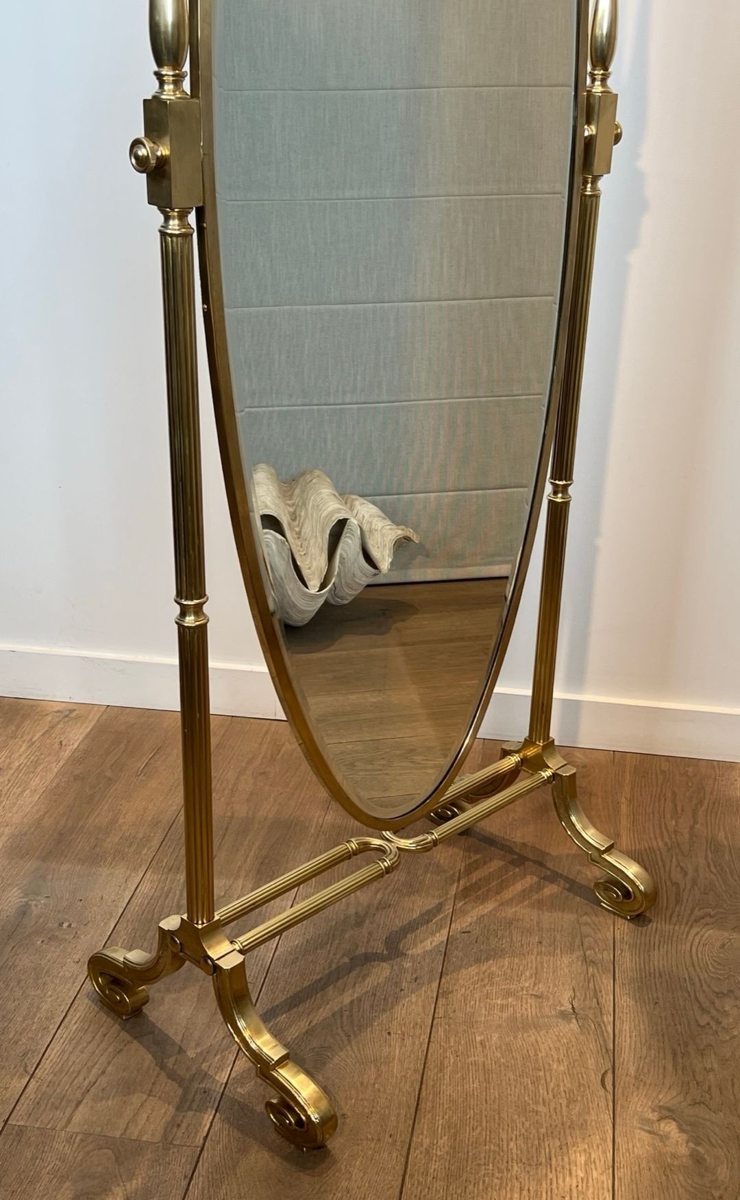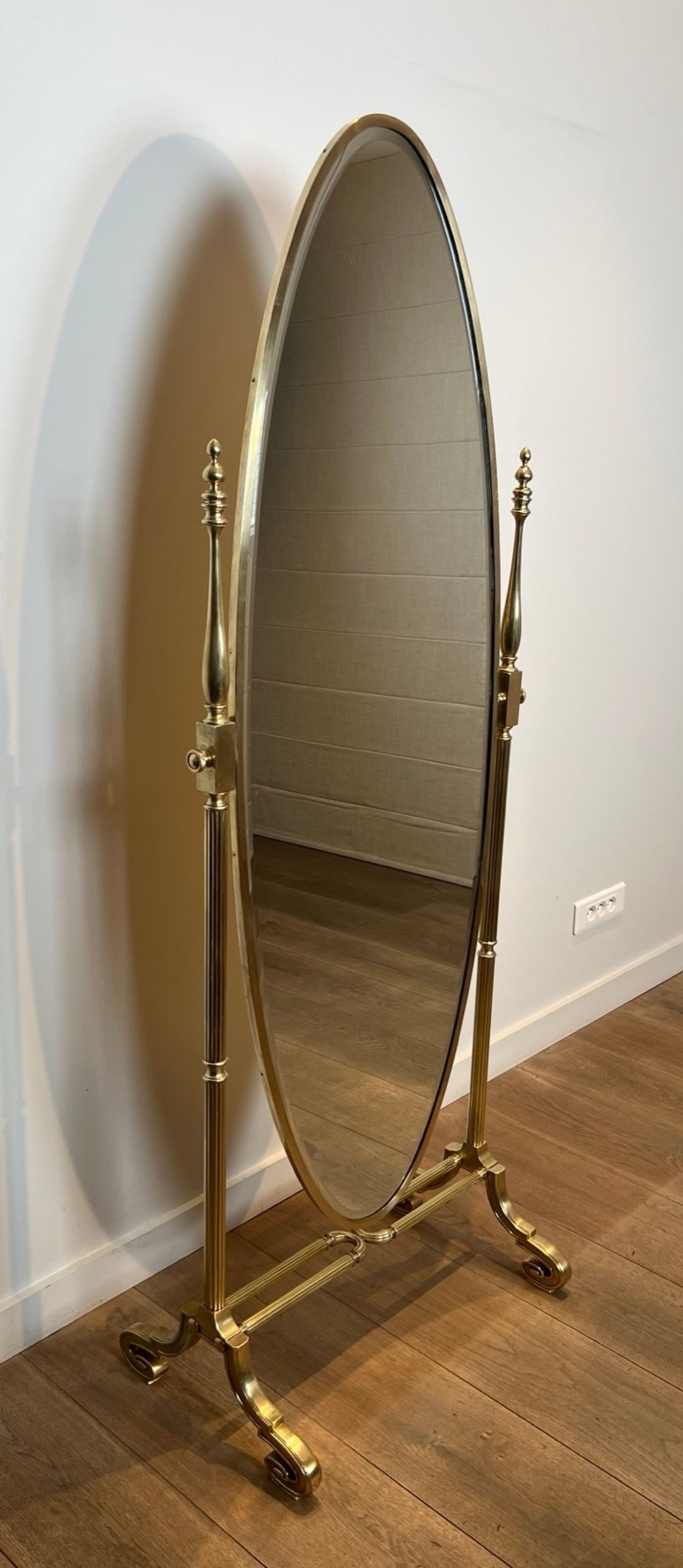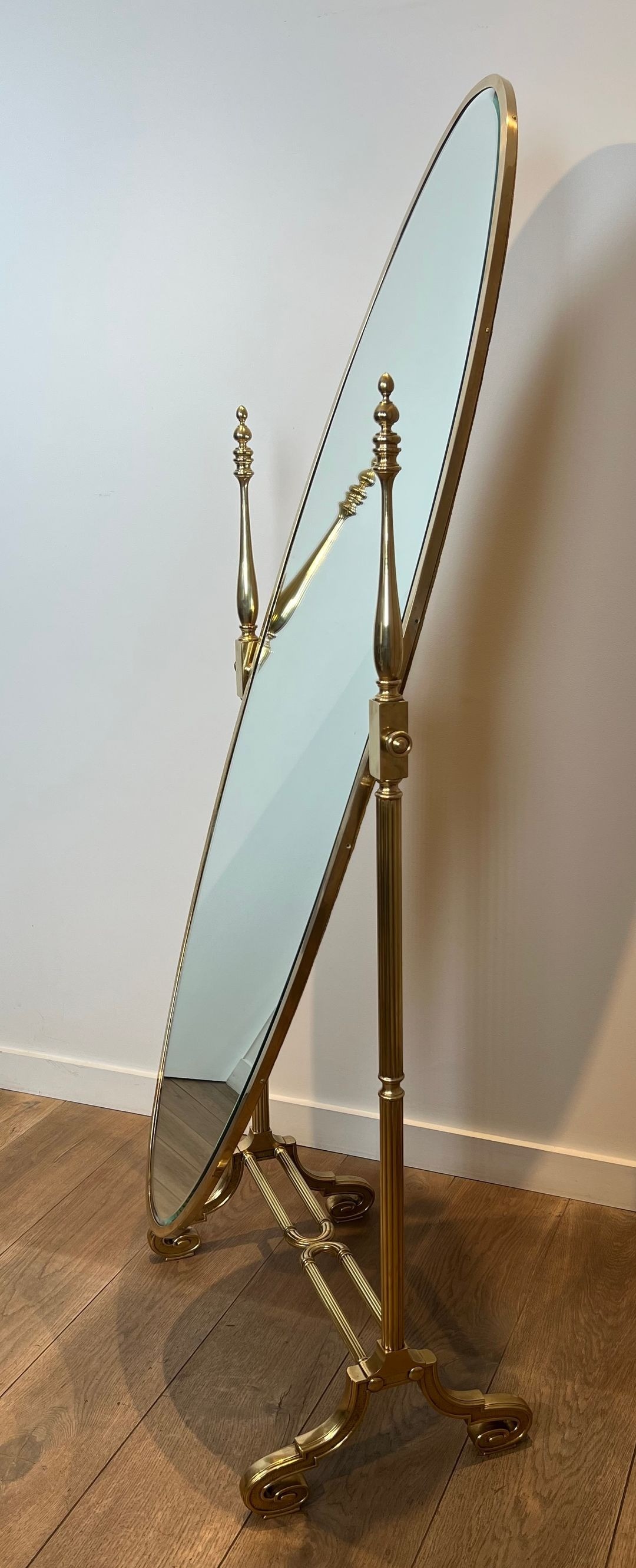 Large full-length psyché mirror in the Empire style, the oval mirror plate in a gilt brass frame mounted on a tilting pivot between two richly decorated bronze and brass uprights with classical ornamental mounts, on a splayed base. French work, circa 1880. Dimensions: 69.5 × 42 × 180.5 cm.